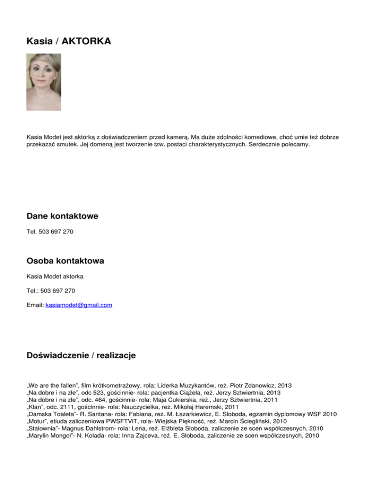 Kasia / AKTORKA Kasia Modet jest aktorką z doświadczeniem przed kamerą. Ma duże zdolności komediowe, choć umie też dobrze przekazać smutek. Jej domeną jest tworzenie tzw. postaci charakterystycznych. Serdecznie polecamy. Dane kontaktowe Tel. 503 697 270 Osoba kontaktowa Kasia Modet aktorka Tel.: 503 697 270 Email: [email protected] Doświadczenie / realizacje „We are the fallen”, film krótkometrażowy, rola: Liderka Muzykantów, reż. Piotr Zdanowicz, 2013 „Na dobre i na złe”, odc 523, gościnnie- rola: pacjentka Ciążela, reż. Jerzy Sztwiertnia, 2013 „Na dobre i na złe”, odc. 464, gościnnie- rola: Maja Cukierska, reż., Jerzy Sztwiertnia, 2011 „Klan”, odc. 2111, gościnnie- rola: Nauczycielka, reż. Mikołaj Haremski, 2011 „Damska Toaleta”- R. Santana- rola: Fabiana, reż. M. Łazarkiewicz, E. Słoboda, egzamin dyplomowy WSF 2010 „Motur”, etiuda zaliczeniowa PWSFTViT, rola- Wiejska Piękność, reż. Marcin Ściegliński, 2010 „Stalownia”- Magnus Dahlstrom- rola: Lena, reż. Elżbieta Słoboda, zaliczenie ze scen współczesnych, 2010 „Marylin Mongoł”- N. Kolada- rola: Inna Zajceva, reż. E. Słoboda, zaliczenie ze scen współczesnych, 2010 „Dwoje biednych Rumunów mówiących po polsku”, D. Masłowska- rola: Dżina, reż. E. Słoboda, zaliczenie ze scen współczesnych, 2009 „Świętoszek”, Molier- rola: Doryna, reż. A. Domalik, zaliczenie ze scen klasycznych, 2009 „Ożenek”, N. Gogol- rola: Agafia Tichonovna, reż. A. Domalik, P. Zelt, zaliczenie ze scen z dramatu rosyjskiego, 2009 „Białe małżeństwo”, T. Różewicz- rola: Bianka, reż. K. Rogulski, zaliczenie z dramatu ze scen współczesnych, 2008 Dodatkowe umiejętności: jazda konna, szermierka, pływanie, taniec historyczny: Galiarda i Pawana, zdolności komediowe i kabaretowe, podstawy kaskaderki, prawo jazdy, kat. B. Angielski- biegle Hiszpański- biegle Rosyjski- podstawowy Powered by TCPDF (www.tcpdf.org)