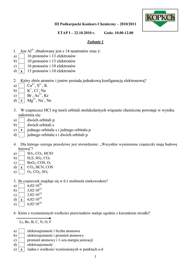 III Podkarpacki Konkurs Chemiczny – 2010/2011 ETAP I – 22.10.2010 r. KOPKCh Godz. 10.00-12.00 Zadanie 1 1. Jon Al3+ zbudowany jest z 14 neutronów oraz z: a) 16 protonów i 13 elektronów b) 10 protonów i 13 elektronów c) 16 protonów i 10 elektronów d) x 13 protonów i 10 elektronów 2. Który zbiór atomów i jonów posiada jednakową konfigurację elektronową? a) Ca2+, S2- , K b) K+, Cl-, Na c) Br-, As3+, Kr d) x Mg2+, Na+, Ne 3. W cząsteczce HCl wg teorii orbitali molekularnych wiązanie chemiczne powstaje w wyniku nałożenia się: a) dwóch orbitali p b) dwóch orbitali s c) x jednego orbitalu s i jednego orbitalu p d) jednego orbitalu s i dwóch orbitali p 4. a) b) c) d) e) Dla którego szeregu prawdziwe jest stwierdzenie: „Wszystkie wymienione cząsteczki mają budowę liniową”? SO2, CO2, HClO H2S, SO2, CO2 BeO2, COS, O3 x CO2, HCN, COS O3, CO2, SO2 5. Ile cząsteczek znajduje się w 0,1 molimola siarkowodoru? a) 6,021020 b) 3,021023 c) 3,021019 d) x 6,021019 e) 6,021018 6. Która z wymienionych wielkości pierwiastków maleje zgodnie z kierunkiem strzałki? Li, Be, B, C, N, O, F a) b) c) d) e) x elektroujemność i liczba atomowa elektroujemność i promień atomowy promień atomowy i 1-sza energia jonizacji elektroujemność żadna z wielkości wymienionych w punktach a-d 1 7. Jaki procent tlenku żelaza(III) zawiera ruda, jeżeli z próbki rudy o masie 5g otrzymano 2,8g żelaza? a) 60 % b) 70% c) x 80% d) 90% Rozwiązanie: 1 mol Fe2O3 - 2 mol Fe 159,7 g Fe2O3 - ( 255,9 )g Fe y g Fe2O3 - 2,8g Fe stąd y = 4,0 g Fe2O3 , a % Fe2O3 = 4,0 g 100% = 80 % 5,0 g 8. Roztwór otrzymany w wyniku zmieszania 2 dm3 2 molowego roztworu H2SO4 i 2 dm3 0,5 molowego roztworu H2SO4 jest roztworem: a) 1,5 molowym b) 0,25 molowym c) x 1,25 molowym d) 0,75 molowym Rozwiązanie: liczba moli H2SO4 w roztworze 1, n1 = 2 dm3 2 mol/dm3 = 4 mol liczba moli H2SO4 w roztworze 2, n2 = 2 dm3 0,5 mol/dm3 = 1 mol liczba moli H2SO4 po zmieszaniu, nk = 5 mol objętość roztworu po zmieszaniu, Vk = 4 dm3, stężenie ck = 5 mol/4 dm3 =1,25 mol/dm3. 9. Stopień dysocjacji kwasu octowego w 0,01 molowym roztworze wynosi 20%. Ile (razem) cząsteczek i jonów pochodzących z dysocjacji kwasu zawiera 1 dm3 tego roztworu? a) 6,021021 b) x 7,221021 c) 7,221023 d) 4,821021 Rozwiązanie: Początkowa ilość kwasu w 1 dm3 roztworu wynosi 0,01 mola czyli 6,021021 cząsteczek CH3COOH, zdysocjowało (6,021021 0,20) cząsteczek, a więc pozostało w roztworze 6,021021 – 1,201021 = 4,821021 cząsteczek CH3COOH oraz w wyniku dysocjacji kwasu powstało 1,201021 jonów H+ i 1,201021 jonów CH3COO-. Suma cząsteczek i jonów pochodzących z dysocjacji kwasu: ( 4,82+2,40) 1021 = 7,221021. 10. Który z podanych związków należy do fenoli? OH OH OH A B OH C OH D 2 E a) b) x c) d) e) A B C D E Łącznie zadanie 1: 10 pkt. Zadanie 2 Udziel odpowiedzi na postawione pytania dotyczące fosforu (Z=15) i jego związków. a). Pierwiastek fosfor (masa atomowa 30,9738 u) występuje w przyrodzie w postaci tylko jednego nuklidu o liczbie masowej 31. (i). Oblicz masę (g) atomu fosforu. (ii). Wiedząc, że masa protonu wynosi 1,0078 u, masa neutronu – 1,0086 u, oblicz defekt masy (g) powstały z utworzenia 0,5 mol atomów fosforu. b). W trzech różnych tlenkach fosforu oznaczono zawartość fosforu, która wynosi odpowiednio: 56,34%, 49,19%, 43,64%. Oblicz w jakim stosunku pozostają do siebie masy tlenu przypadające na tą samą masę fosforu w kolejnych tlenkach. c). Atom fosforu w anionie PO43- ulega hybrydyzacji typu sp3. Podaj: (i) liczbę wolnych par elektronowych atomu centralnego, (ii) typ cząsteczki i przestrzenny kształt cząsteczki, (iii) wartość kąta pomiędzy wiązaniami. d). Zbilansuj równanie reakcji: fosfor + jodan(V) + OH- = wodorofosforan(III) + jod + woda e). Jedną z soli zawierających fosfor jest ortofosforan(V) wapnia. (i) Oblicz, ile gramów tej soli można otrzymać z 50,0 cm3 10,0%-wego roztworu Na3PO4 o gęstości 1,108 g/cm3. (ii). Jakiej objętości [cm3] roztworu CaCl2 o stężeniu 0,8 mol/dm3 należy użyć do przeprowadzenia tej reakcji z wydajnością 100% ? Przykładowe rozwiązanie a). Masa atomu fosforu 6,023x1023 atomów fosforu (1 mol) ma masę 30,9738 g 1 atom fosforu --------------------------------x g, x = 5,14 10-23 g 1pkt lub Obliczyć masę 1 daltona ([1u] = 1/12 masy atomu izotopu 12C = 1,66 10-24g) Masa jednego atomu fosforu: m = 30,9738u 1,66 10-24 g/u = 5,14 10-23 g Defekt masy 2pkt Nuklid fosforu (Z=15, A=31) składa się z 15 protonów oraz 16 neutronów (A – Z = 16). Suma masy protonów i neutronów niezbędnych do utworzenia 0,5 mola nuklidów fosforu wynosi: m= 0,5mol(15 1,0078 g/mol + 16 1,0086g/mol) = 15,6273 g. 3 Defekt masy: m = 15,6273 g – 0,5mol 30,9738 g/mol = 0,1404 g lub w przeliczeniu na 1 mol nuklidów fosforu: m = 1 mol (15 1,0078 g/mol + 16 1,0086 g/mol) = 31,2546 g Defekt masy: m = 31,2546 g – 1mol 30,9738 g/mol = 0,2808 g Defekt masy dla 0,5 mol nuklidów fosforu: 0,1404 g b). 100 g (tlenek 1) – 56,34 g fosforu – 43,66 g tlenu 30,9738 g fosforu (1 mol) – x g tlenu, x = 24 g O 100 g (tlenek 2) – 49,19 fosforu – 50,81 g tlenu 30,9738 g fosforu (1 mol) – x g tlenu, x = 32 g O 100 g (tlenek 3) – 43,64 g fosforu – 56,36 g tlenu 30,9738 g fosforu (1 mol) – x g tlenu, x = 40 g O Stosunek masowy tlenu w tlenkach fosforu: 24:32:40 3:4:5 c). d). (i) 0, 2pkt (ii) AX4, czworościan (tetraedr), (iii) 109o 3pkt 10P + 6IO3- + 14OH- = 10HPO32- + 3I2 + 2H2O 2pkt e). 2Na3PO4 + 3CaCl2 = Ca3(PO4)2 + 6 NaCl (równ. 1) (i). Zawartość Na3PO4 w roztworze wyjściowym: 50 cm3 (d = 1,108g/cm3) 55,4 g 100 g r-ru - 10 g Na3PO4 55,4 g r-ru - x, x = 5,54 g Na3PO4 Ze stechiometrii reakcji: 2 mol Na3PO4 – 1 mol Ca3(PO4)2 2163,97 g Na3PO4 – 310,18 g 5,54 g Na3PO4 – x, x = 5,24 g Ca3(PO4)2 (ii). Ze stechiometrii reakcji: 2 mol Na3PO4 – 3 mol CaCl2 2163,97g Na3PO4 – 3 110,98 g CaCl2 5,54 g Na3PO4 - x, x = 5,62 g CaCl2 1dm3 – 1000 cm3 – 0,8 mol CaCl2 