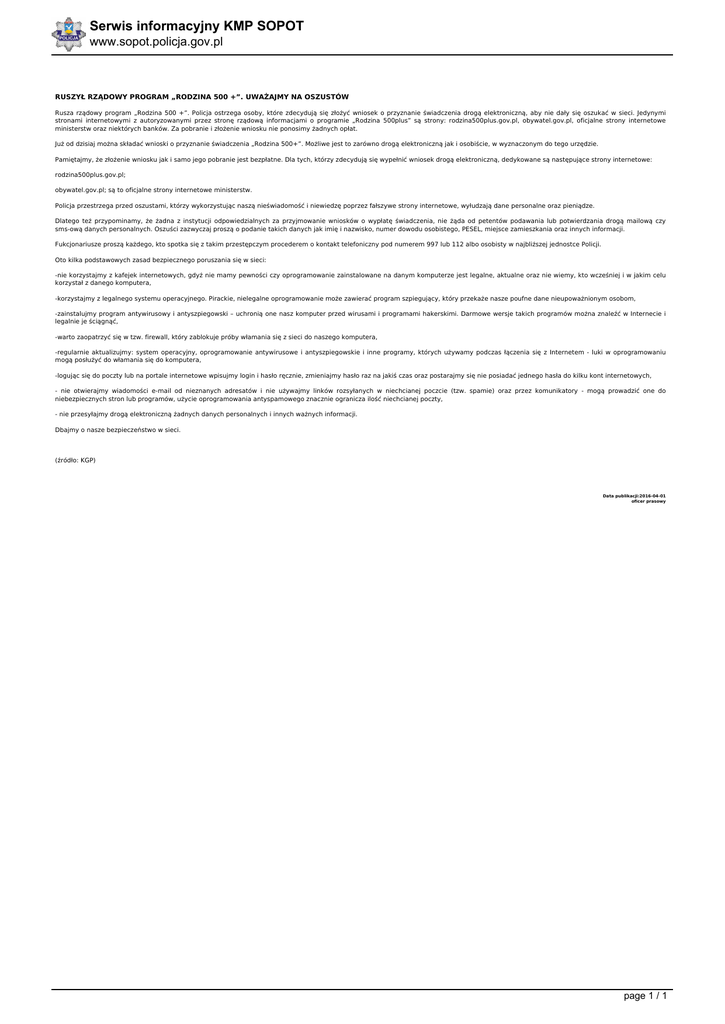Serwis informacyjny KMP SOPOT www.sopot.policja.gov.pl RUSZYŁ RZĄDOWY PROGRAM „RODZINA 500 +”. UWAŻAJMY NA OSZUSTÓW Rusza rządowy program „Rodzina 500 +”. Policja ostrzega osoby, które zdecydują się złożyć wniosek o przyznanie świadczenia drogą elektroniczną, aby nie dały się oszukać w sieci. Jedynymi stronami internetowymi z autoryzowanymi przez stronę rządową informacjami o programie „Rodzina 500plus” są strony: rodzina500plus.gov.pl, obywatel.gov.pl, oficjalne strony internetowe ministerstw oraz niektórych banków. Za pobranie i złożenie wniosku nie ponosimy żadnych opłat. Już od dzisiaj można składać wnioski o przyznanie świadczenia „Rodzina 500+”. Możliwe jest to zarówno drogą elektroniczną jak i osobiście, w wyznaczonym do tego urzędzie. Pamiętajmy, że złożenie wniosku jak i samo jego pobranie jest bezpłatne. Dla tych, którzy zdecydują się wypełnić wniosek drogą elektroniczną, dedykowane są następujące strony internetowe: rodzina500plus.gov.pl; obywatel.gov.pl; są to oficjalne strony internetowe ministerstw. Policja przestrzega przed oszustami, którzy wykorzystując naszą nieświadomość i niewiedzę poprzez fałszywe strony internetowe, wyłudzają dane personalne oraz pieniądze. Dlatego też przypominamy, że żadna z instytucji odpowiedzialnych za przyjmowanie wniosków o wypłatę świadczenia, nie żąda od petentów podawania lub potwierdzania drogą mailową czy sms-ową danych personalnych. Oszuści zazwyczaj proszą o podanie takich danych jak imię i nazwisko, numer dowodu osobistego, PESEL, miejsce zamieszkania oraz innych informacji. Fukcjonariusze proszą każdego, kto spotka się z takim przestępczym procederem o kontakt telefoniczny pod numerem 997 lub 112 albo osobisty w najbliższej jednostce Policji. Oto kilka podstawowych zasad bezpiecznego poruszania się w sieci: -nie korzystajmy z kafejek internetowych, gdyż nie mamy pewności czy oprogramowanie zainstalowane na danym komputerze jest legalne, aktualne oraz nie wiemy, kto wcześniej i w jakim celu korzystał z danego komputera, -korzystajmy z legalnego systemu operacyjnego. Pirackie, nielegalne oprogramowanie może zawierać program szpiegujący, który przekaże nasze poufne dane nieupoważnionym osobom, -zainstalujmy program antywirusowy i antyszpiegowski – uchronią one nasz komputer przed wirusami i programami hakerskimi. Darmowe wersje takich programów można znaleźć w Internecie i legalnie je ściągnąć, -warto zaopatrzyć się w tzw. firewall, który zablokuje próby włamania się z sieci do naszego komputera, -regularnie aktualizujmy: system operacyjny, oprogramowanie antywirusowe i antyszpiegowskie i inne programy, których używamy podczas łączenia się z Internetem - luki w oprogramowaniu mogą posłużyć do włamania się do komputera, -logując się do poczty lub na portale internetowe wpisujmy login i hasło ręcznie, zmieniajmy hasło raz na jakiś czas oraz postarajmy się nie posiadać jednego hasła do kilku kont internetowych, - nie otwierajmy wiadomości e-mail od nieznanych adresatów i nie używajmy linków rozsyłanych w niechcianej poczcie (tzw. spamie) oraz przez komunikatory - mogą prowadzić one do niebezpiecznych stron lub programów, użycie oprogramowania antyspamowego znacznie ogranicza ilość niechcianej poczty, - nie przesyłajmy drogą elektroniczną żadnych danych personalnych i innych ważnych informacji. Dbajmy o nasze bezpieczeństwo w sieci. (źródło: KGP) Data publikacji:2016-04-01 oficer prasowy page 1 / 1 Powered by TCPDF (www.tcpdf.org)