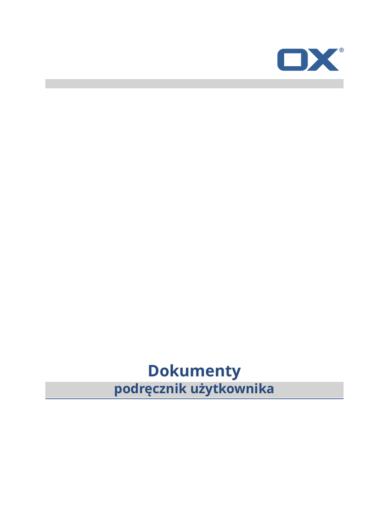 bla Dokumenty podręcznik użytkownika bla Dokumenty Dokumenty: podręcznik użytkownika data wydania środa, 23. marzec 2016 Version 7.6.2 Copyright © 2016-2016 OX Software GmbH. , Niniejszy dokument stanowi własność intelektualną firmy OX Software GmbH. Niniejszy dokument może być kopiowany w całości lub części pod warunkiem umieszczenia w każdej kopii niniejszej informacji o prawach autorskich. Informacje zawarte w tym podręczniku zostały zebrane z zachowaniem najwyższej staranności. Nie jest jednak możliwe całkowite wykluczenie błędów. Firma OX Software GmbH, autorzy i tłumacze nie odpowiadają za ewentualne błędy i ich konsekwencje. Używane w niniejszym podręczniku nazwy programów i urządzeń mogą być zastrzeżonymi znakami towarowymi i są wykorzystywane bez udzielania gwarancji możliwości ich darmowego wykorzystywania. Firma OX Software GmbH z reguły przestrzega zasad pisowni ustalonych przez producentów. Reprodukcja nazw marek, nazw handlowych, logo itd. w niniejszym podręczniku (nawet bez specjalnego oznaczenia) nie oznacza, że te nazwy mogą zostać uznane za darmowe (w rozumieniu prawa dotyczącego znaków towarowych i nazw marek). 2 © Copyright Open-Xchange Inc. 2012-2015 Spis treści 1 Informacje o tej dokumentacji ................................................................ 5 2 Do czego służy aplikacja Dokumenty? .................................................... 7 3 Tekst ............................................................................................................ 9 3.1 Składniki aplikacji Tekst ........................................................................................ 10 3.2 Składniki aplikacji Tekst do edycji strony ............................................................... 11 3.3 Tworzenie dokumentów tekstowych ................................................................... 14 3.4 Edycja dokumentów tekstowych .......................................................................... 15 3.5 Edycja dokumentów tekstowych pod nową nazwą .............................................. 16 4 Arkusz kalkulacyjny ................................................................................ 17 4.1 Składniki aplikacji Arkusz kalkulacyjny ................................................................... 18 4.2 Składniki aplikacji Arkusz kalkulacyjny do edycji strony ......................................... 19 4.3 Tworzenie arkuszy kalkulacyjnych ....................................................................... 22 4.4 Edycja arkuszy kalkulacyjnych ............................................................................. 23 4.5 Edycja arkuszy kalkulacyjnych pod nową nazwą .................................................. 24 5 Szablony .................................................................................................... 25 5.1 Korzystanie z szablonów ..................................................................................... 26 5.2 Tworzenie szablonów .......................................................................................... 27 5.3 Porządkowanie szablonów .................................................................................. 28 6 Współpraca ............................................................................................... 29 6.1 Wspólna edycja dokumentów ............................................................................. 30 Indeks .......................................................................................................... 31 © Copyright Open-Xchange Inc. 2012-2015 3 4 © Copyright Open-Xchange Inc. 2012-2015 1 Informacje o tej dokumentacji Poniższe informacje pozwolą sprawniej posługiwać się tą dokumentacją. ▪ Jaka jest grupa docelowa niniejszej dokumentacji? ▪ Jaka jest zawartość niniejszej dokumentacji? ▪ Dodatkowa pomoc Jaka jest grupa docelowa niniejszej dokumentacji? Ta dokumentacja jest przeznaczona dla użytkowników, którzy chcą tworzyć i edytować dokumenty pakietu Office w oprogramowaniu do pracy grupowej, a następnie udostępniać je innym. Jaka jest zawartość niniejszej dokumentacji? Niniejsza dokumentacja zawiera następujące informacje: ▪ W rozdziale Do czego służy aplikacja Dokumenty? znajdziesz krótki opis aplikacji Dokumenty. ▪ Rozdział Tekst zawiera instrukcje dotyczące korzystania z aplikacji Tekst. ▪ Rozdział Arkusz kalkulacyjny zawiera instrukcje dotyczące korzystania z aplikacji Arkusz kalkulacyjny. W rozdziale Współpraca znajdują się uwagi i instrukcje dotyczące współpracy z innymi użytkownikami. W tej dokumentacji opisano pracę z typową instalacją i konfiguracją oprogramowania do pracy grupowej. Twoja wersja instalacji i konfiguracji oprogramowania do pracy grupowej może być inna niż opisana w tym miejscu. ▪ Dodatkowa pomoc Szczegółową dokumentację oprogramowania do pracy grupowej można znaleźć w instrukcji obsługi aplikacji OX App Suite. © Copyright Open-Xchange Inc. 2012-2015 5 6 © Copyright Open-Xchange Inc. 2012-2015 2 Do czego służy aplikacja Dokumenty? Aplikacja Dokumenty udostępnia szereg funkcji do edycji dokumentów pakietu Office w oprogramowaniu do pracy grupowej. ▪ Używaj sformatowanych dokumentów tekstowych do swojej korespondencji. Stosuj w dokumentach tabele oraz ilustracje. ▪ Korzystaj z arkuszy kalkulacyjnych w natywnym formacie programu Microsoft Excel, aby pracować z liczbami, arkuszami kalkulacyjnymi i formułami. ▪ Edycja dokumentów z innymi użytkownikami. ▪ Korzystaj z innych aplikacji oprogramowania do pracy grupowej, aby porządkować swoje dokumenty, wysyłać je pocztą e-mail lub udostępniać innym użytkownikom bądź partnerom zewnętrznym. W ramach oprogramowania Dokumenty są dostępne następujące aplikacje: ▪ Aplikacja Tekst [9] do tworzenia i edycji tekstów. ▪ Aplikacja Arkusz kalkulacyjny [17] do tworzenia i edycji arkuszy kalkulacyjnych.