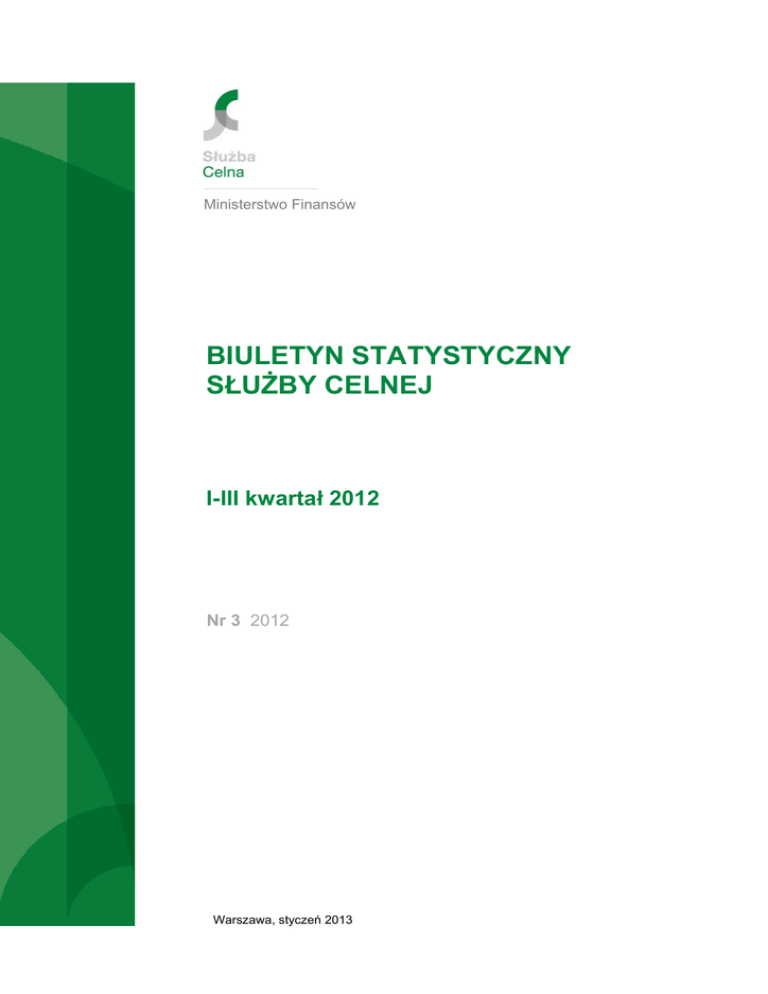 Ministerstwo Finansów BIULETYN STATYSTYCZNY SŁUŻBY CELNEJ I-III kwartał 2012 Nr 3 2012 Warszawa, styczeń 2013 Biuletyn Statystyczny Służby Celnej Spis treści Uwagi wstępne 3 I. Wpływy budżetowe pobrane przez Służbę Celną I.1 Wpływy z cła, podatków i innych tytułów za I-III kwartał lat 2010-2012 I.2 Wpływy za I-III kwartał lat 2011-2012 wg izb celnych - tabela I.3 Wpływy z cła, podatków i innych tytułów za I-III kwartał lat 2011-2012 wg izb celnych -wykres I.4 Wpływy z cła i podatków w kolejnych kwartałach lat 2009-2012 - wykres I.6 Podatek Akcyzowy I.6.1 Dochody z podatku akcyzowego za I-III kwartał lat 2010-2012 I.6.2 Struktura dochodów z podatku akcyzowego w I-III kwartale 2012r I.6.3 Dochody z podatku akcyzowego w poszczególnych kwartałach lat 2008-2012 I.7 Liczba Przyjętych deklaracji akcyzowych 4 4 5 6 7 8 8 9 10 17 II. Wydatki budżetowe Izb Celnych II.1 Rozdział 75013 – Izby Celne i Urzędy Celne ze sprawozdania z działalności finansowej GUC-2 – wydatki – ogółem - tabela II.2 Rozdział 75095 – Izby Celne i Urzędy Celne ze sprawozdania z działalności finansowej GUC-2 – pozostała działalność II.3 Rozdział 75014 – Izby Celne i Urzędy Celne ze sprawozdania z działalności finansowej GUC-2 – egzekucja administracyjna II.4 Rozdział 75076 – Izby Celne i Urzędy Celne ze sprawozdania z działalności finansowej GUC-2 – pozostałe wydatki II.6 Wydatki budżetowe izb celnych. II.7 Wydatki budżetowe izb celnych – przypadające na 1 osobę w I-III kwartale 2012r. 19 18 22 22 23 24 24 III. Stan osobowy oraz etatowy w jednostkach organizacyjnych Służby Celnej IIII.1 Obsada osobowa i etatowa w jednostkach organizacyjnych Służby Celnej wg stanu na koniec III kwartału 2012r. 25 25 IV. Dozór i kontrola celna sprawowane przez organy celne IV.1 Liczba zgłoszeń celnych przyjętych do procedur celnych i liczba powrotnych wywozów IV.2 Procedura uproszczona - liczba przyjętych uzupełniających zgłoszeń celnych. IV.3a Liczba pozycji w przyjętych zgłoszeniach celnych. IV.3b Liczba pozycji w uzupełniających zgłoszeniach celnych IV.4 Liczba przyjętych zgłoszeń celnych, w których przed zwolnieniem towaru przeprowadzono kontrole. IV.5 Liczba wystawionych potwierdzeń wywozu towarów IV.6 Liczba pozwoleń na stosowanie gospodarczych procedur celnych i procedury uproszczonej IV.7 Tranzyt towarów przez polski obszar celny IV.8 Wydziały zwalczania przestępczości celnej IV.9 Komórki dozoru IV.10 Efekty działań kontrolnych przeprowadzonych przez funkcjonariuszy Oddziałów Celnych 29 30 33 35 36 38 39 40 43 46 50 53 V. Ruch osób i środków transportu przez przejścia graniczne V.1 Ruch graniczny osób na podstawie paszportów w latach 2010-2012 V.2.Ruch graniczny środków transportu w latach 2010-2012 56 56 59 VI. Składy celne, miejsca uznane 74 VI.1 Liczba miejsc uznanych i wyznaczonych, funkcjonujących w I-III kwartale 2012r. 74 VI.2 Liczba składów celnych, wolnych obszarów celnych, składów wolnocłowych i magazynów czasowego składowania istniejących w okresie I-III kwartału 2012r. 76 VII. Likwidacja towarów VII.1 Przychody z likwidacji ogółem. VII.2 Postępowanie likwidacyjne ogółem VIII. Dozór podatkowy VIII.1 Dozór podatkowy w kasynach gry VIII.2 Dozór podatkowy w salonach gier na automatach VIII.3 Dozór podatkowy w punktach gier na automatach o niskich wygranych VIII.4 Kontrola oleju napędowego i opałowego oraz paliwa żeglugowego 77 77 79 80 80 81 82 83 Departament Służby Celnej Biuletyn Statystyczny Służby Celnej IX. INTRASTAT IX.1 Ilość deklaracji INTRASTAT przyjętych w I-III kwartale 2012r. 87 87 X. Wspólna Polityka Rolna 89 X.1 Liczba przyjętych zgłoszeń celnych, przeprowadzonych kontroli i wystawionych protokołów – ogółem 89 X.2 Liczba przyjętych zgłoszeń celnych, przeprowadzonych kontroli i wystawionych protokołów wg IC 90 XI. Postępowanie w ramach I i II instancji XI.1 Postępowanie w ramach I-szej instancji w urzędach i izbach celnych XI.2 Postępowanie w ramach II-giej instancji w izbach celnych XI.3 Skargi do Wojewódzkich Sądów Administracyjnych i skargi kasacyjne do Naczelnego Sądu Administracyjnego 96 96 100 XII. Zaległości wymagalne administracji celnej XII.1 Udział zaległości we wpływach XII.2. Zaległości wymagalne z tytułu ceł XII.3. Zaległości z tytułu podatku akcyzowego XII.4 Zaległości z tytułu podatku od towarów i usług XII.5 Zaległości z tytułu grzywien i mandatów XII.6 Zaległości z tytułu podatków i opłat od gier 111 112 117 121 123 124 125 XIII. Postępowanie w sprawach o przestępstwa skarbowe i wykroczenia skarbowe XIII.1 Liczba spraw w podziale na izby celne XIII.2 Wartość zajętych towarów i środków płatniczych w podziale na izby celne XIII.3 Średnia wartość zajętych towarów i środków płatniczych w podziale na izby celne XIII.4 Towary zajęte w sprawach karnych skarbowych i mandatowych XIII.5 Środki płatnicze zajęte - ogółem XIII.6 Zestawienie ilości zajętych papierów w podziale na izby celne XIII.7 Zestawienie ilości zajętych wyrobów alkoholowych w podziale na izby celne 126 126 127 130 133 139 140 140 100 Departament Służby Celnej Biuletyn Statystyczny Służby Celnej UWAGI WSTĘPNE Biuletyn Statystyczny Służby Celnej został opracowany w Departamencie Służby Celnej Ministerstwa Finansów. Zawiera on podstawowe informacje dotyczące Służby Celnej w I-III kwartale lat 2011 i 2012. Zestawienia opracowano na podstawie danych otrzymywanych z izb celnych, Ministerstwa Finansów i Głównego Urzędu Statystycznego. Prezentowane dane odnoszą się zbiorczo do całej Służby Celnej bądź ujęte są w podziale na izby celne. W niektórych tabelach w przypadku nie wystąpienia danego zjawiska pozostawiono puste pole. W tabelach i wykresach izby celne uszeregowane są wg kolejności alfabetycznej. 3 Departament Służby Celnej Biuletyn Statystyczny Służby Celnej I. WPŁYWY BU