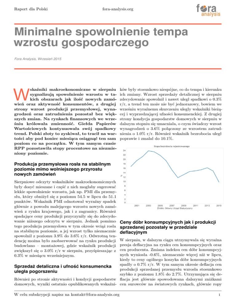 Raport dla Polski fora-analysis.org Minimalne spowolnienie tempa wzrostu gospodarczego Fora Analysis, Wrzesień 2015 skaźniki makroekonomiczne w sierpniu sygnalizują spowolnienie wzrostu w takich obszarach jak ilość nowych zamówień oraz aktywność konsumentów, z drugiej strony wzrost produkcji przemysłowej, wynagrodzeń oraz zatrudnienia pozostał bez większych zmian. Na rynkach finansowych we wrześniu królowała zmienność. Giełda Papierów Wartościowych kontynuowała swój spadkowy trend. Polski złoty to zyskiwał, to tracił na wartości aby pod koniec miesiąca osiągnąć ten sam poziom co na początku. W tym samym czasie RPP pozostawiła stopy procentowe na niezmieniony poziomie. W ków były stosunkowo niespójne, co do tempa i kierunku ich zmiany. Wzrost sprzedaży detalicznej w sierpniu zdecydowanie spowolnił i nawet uległ spadkowi o 0.3% r/r, a trend ten może nie być jednorazowy, bowiem we wrześniu wyraźnemu skurczeniu uległy wskaźniki bieżącej i wyprzedzającej ufności konsumenckiej. Z drugiej strony kondycja gospodarstw domowych w sierpniu w dalszym stopniu się umacniała, o czym świadczy wzrost wynagrodzeń o 3.6% połączony ze wzrostem zatrudnienia o 1.0% r/r. Również wskaźnik bezrobocia uległ poprawie i zmalał do 10.1%. Produkcja przemysłowa rosła na stabilnym poziomie mimo wolniejszego przyrostu nowych zamówień Sierpniowe odczyty wskaźników makroekonomicznych były dosyć mieszane i część z nich mogłaby sugerować lekkie spowolnienie wzrostu, jak np. PMI dla przemysłu, który obniżył się z poziomu 54.5 w lipcu do 51.1 punktów. Wskaźnik PMI odnotował wyraźny spadek głównie z powodu malejącego wzrostu nowych zamówień z rynku krajowego, jak i z zagranicy. Również spadające ceny produkcji przyczyniły się do zdecydowanie niższego odczytu w sierpniu. Jednak pomimo tego produkcja przemysłowa w tym okresie wciąż rosła na stabilnym poziomie, a jej wzrost tylko nieznacznie spowolnił z poziomu 3.9% do 3.6% r/r. Odwrotną tendencję można było zaobserwować na rynku produkcji budowlano – montażowej, gdzie wskaźnik produkcji zwiększył się o 3.0% r/r w sierpniu, przyśpieszając z 0.3% w miesiącu wcześniejszym. Ceny dóbr konsumpcyjnych jak i produkcji sprzedanej pozostały w przedziale deflacyjnym W sierpniu, w dalszym ciągu utrzymywała się wyraźna presja deflacyjna na rynku cen konsumpcyjnych oraz cen producenta. Zmiana indeksu cen dóbr konsumpcyjnych wyniosła -0.6%, nieznacznie więcej niż w lipcu, kiedy to ceny ogólnego koszyka dóbr konsumpcyjnych spadły o 0.7% r/r. W tym samym okresie deflacja cen Sprzedaż detaliczna i ufność konsumencka produkcji sprzedanej przemysłu wzrosła stosunkowo uległa pogorszeniu szybko z poziomu 1.8% do 2.7%. Utrzymująca się deRównież po stronie aktywności i kondycji gospodarstw flacja jest głównie spowodowana dalszymi zniżkami domowych, wyniki ostatnio opublikowanych wskaźni- cen surowców na światowych rynkach, głównie ropy W celu subskrypcji napisz na [email protected] 1 Raport dla Polski fora-analysis.org naftowej, co pomimo ogólnej tendencji spadkowej pol- coraz bardziej, do tego aż stopnia, że niektórzy ekonoskiej waluty prowadzi to wyraźnego obniżenia kosztów miści mówią o wzroście poniżej 5% w nadchodzących energii i paliw. latach. Przeciwwagą dla tych gospodarek mogą być kraje rozwinięte – głównie Stany Zjednoczone i strefa euro. Zwłaszcza ten ostatni region wydaje się być obiecujący. Rynki finansowe nadal w odwrocie Ostatnie dane wskazują, że wzrost gospodarczy nadal Giełda Papierów Wartościowych (GPW) odnotowała postępuje, natomiast wskaźniki wyprzedzające sygnalikolejne spadki we wrześniu. Głównym czynnikiem stoją- zują znaczne przyśpieszenie w najbliższych miesiącach. cym za tym były zawirowania na rynkach finansowych RPP przedstawiła również strategię polityki moneoraz wzrost niepewności. Jest to z jednej strony spo- tarnej na 2016 rok. Bez większych zaskoczeń nie ma wodowane oczekiwaniem na podniesienie przez bank większych zmian w strategii na przyszły rok. Warto centralny w Stanach Zjednoczonych stóp procentowych. jednak podkreślić, że cel inflacyjny NBP nadal wynoZ drugiej natomiast wyraźne spowolnienie wzrostu PKB si 2.5% (+/- 1 punkt procentowy). Z kolei wszystkie w gospodarkach wschodzących – w głównej mierze w operacje NBP będą przeprowadzane w sytuacji nadChinach. Główny indeks GPW stracił 2.2%, jednak płynności sektora bankowe, która z czasem będzie się wolumen obrotu był mniejszy o prawie 10% w porów- kurczyć. naniu do sierpnia. Najlepszymi sektorami okazały się media i sektor spożywczy, które wzrosły odpowiednio Walutowy roller coaster o 2.5% oraz 1.25%. Większość sektorów była jednak w odwrocie. Wśród nich szczególnie mocno traciły ener- Inwestorzy na rynku walutowym mogli czuć się jak getyka oraz sektor skupiający spółki z rynków Europy na kolejce górskiej we wrześniu. Początkowo polski złoty zyskiwał na wartości w stosunku do USD, EUR środkowej i wschodniej – po 5%. oraz CHF. W pewnym momencie aprecjacja złotówki względem tych walut osiągnęła nawet 2.5%. Jednakże w okolicach 20 wrześnie trend się odwrócił i polska waluta straciła prawie wszystkie „zyski”, które udało się wypracować od początku miesiąca. Pod koniec kurs EUR/PLN oraz USD/PLN pozostał bez zmian. Jedynie w stosunku do franka szwajcarskiego polska złotówka umocniła się o blisko 1%. Polityka monetarna pozostaje bez zmian Na swoim posiedzeniu we wrześniu Rada Po;ityki Pieniężnej (RPP) pozostawiła stopy procentowe na niezmienionym poziomie. Podobnie jak w poprzednich miesiącach, czynniki wewnętrzne jak i zewnętrzne wspierały tą decyzję. Jedynym wydarzeniem, które mogło sugerować podwyżkę stóp procentowych było lekkie spowolnienie wzrostu gospodarczego w II kwartale 2015 roku. Jednakże RPP jest zdania, że jest to t