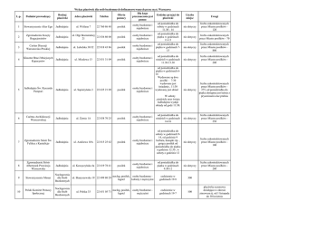 Wykaz placówek dla osób bezdomnych dofinansowywanych przez m.st. Warszawa Dla kogo Oferta Godziny przyjęć do Adres placówki Telefon przeznaczona jest pomocy placówki pomoc od poniedziałku do osoby bezdomne i ul. Wiślana 7 22 760 86 40 posiłek soboty w godzinach najuboższe 11.30 - 14 od poniedziałku do ul. Olgi Boznańskiej osoby bezdomne i 22 836 80 00 posiłek piątku w godzinach 21 najuboższe 11-13 L.p. Podmiot prowadzący Rodzaj placówki 1 Stowarzyszenie Alter Ego Jadłodajnia 2 Zgromadzenie Księży Rogacjonistów Jadłodajnia 3 Caritas Diecezji Warszawsko-Praskiej Jadłodajnia ul. Lubelska 30/32 22 818 43 86 posiłek osoby bezdomne i najuboższe 4 Klasztor Braci Mniejszych Kapucynów Jadłodajnia ul. Miodowa 13 22 831 31 09 posiłek osoby bezdomne i najuboższe 5 Jadłodajnia Św. Ryszarda Pampuri Jadłodajnia ul. Sapieżyńska 3 22 635 21 09 posiłek Liczba miejsc Uwagi nie dotyczy liczba zakontraktowanych przez Miasto posiłków 120 nie dotyczy liczba zakontraktowanych przez Miasto posiłków - 70 od poniedziałku do piątku w godzinach 715 nie dotyczy liczba zakontraktowanych przez Miasto posiłków 800 od poniedziałku do niedzieli w godzinach 11.30-13.30 nie dotyczy liczba zakontraktowanych przez Miasto posiłków 200 nie dotyczy liczba zakontraktowanych przez Miasto posiłków 275, od poniedziałku do piątku dostępna jest łaźnia z prysznicami oraz pralnia od poniedziałku do piątku w godzinach 614 Wydawane są dwa posiłki : 7:30 wydawane jest śniadanie , 11:30 osoby bezdomne i wydawany jest obiad najuboższe W soboty ,niedziele oraz święta Jadłodajnia wydaje obiady od godz 11:30. 6 Carittas Archidiecezji Warszawskiej Jadłodajnia ul. Żytnia 1A 22 838 70 25 posiłek osoby bezdomne i najuboższe od poniedziałku do niedzieli w godzinach 14-16 nie dotyczy liczba zakontraktowanych przez Miasto posiłków 250 nie dotyczy liczba zakontraktowanych przez Miasto posiłków 100 liczba zakontraktowanych przez Miasto posiłków 200 22 815 25 62 posiłek osoby bezdomne i najuboższe od poniedziałku do soboty w godzinach 914, od godzinie 9 herbata, kanapki itp. , gorący posiłek od poniedziałku do piątku o godzinie 12.30 , w soboty o godzinie 12 ul. Kawęczyńska 4a 22 619 78 41 posiłek osoby bezdomne i najuboższe od poniedziałku do piątku w godzinach 9.30-12 nie dotyczy Noclegownia nocleg, posiłek, osoby bezdomne dla Osób ul. Skaryszewska 19 22 499 80 29 kąpiel kobiety i mężczyźni Bezdomnych codziennie w godzinach 19-8 300 Noclegownia dla Osób Bezdomnych codziennie w godzinach 19-7 7 Zgromadzenie Sióstr Św. Feliksa z Kantalicjo Jadłodajnia 8 Zgromadzenie Sióstr Albertynek Prowincja Warszawska Jadłodajnia 9 Stowarzyszenie Monar 10 Polski Komitet Pomocy Społecznej ul. Azaliowa 10A ul. Polska 33 nocleg, posiłek, osoby bezdomne 22 651 05 71 kąpiel mężczyźni 100 placówka sezonowa działająca w okresie zimowym tj. od 1 listopada do 30 kwietnia 11 Zgromadzenie Małe Dzieło Boskiej Opatrzności Orioniści Schronisko ul. Witosa 46 Czarna dla Osób 22 787 81 00 k. Wołomina Bezdomnych całodobowy pobyt, wyżywienie, kąpiel osoby bezdomne mężczyźni 50 miejsc - w miesiącach od wymagane skierowanie z listopada do od poniedziałku do Biura Pomocy i Projektów kwietnia, 30 piątku w godzinach od Społecznych Urzędu m.st. miejsc - w 8 do 18 Warszawy lub miesiącach od warszawskiego OPS-u maja do października 12 Kamiliańska Misja Pomocy Społecznej Schronisko dla Osób ul. Traktorzystów 26 22 478 30 22 Bezdomnych całodobowy pobyt, wyżywienie, kąpiel osoby bezdomne mężczyźni od poniedziałku do piątku w godzinach od 7 do 18 100 Stowarzyszenie Penitencjarne Patronat Schronisko dla Osób Bezdomnych 22 813 22 15 całodobowy pobyt, wyżywienie, kąpiel osoby bezdomne mężczyźni którzy od poniedziałku do opuścili w ciągu piątku w godzinach od ostatnich 3 miesięcy 8 do 18 zakład karny lub areszt śledczy 23 Wspólnota Chleb Życia Schronisko dla Osób Bezdomnych 22 838 44 50 całodobowy pobyt, wyżywienie, kąpiel od poniedziałku do piątku w godzinach od 8 do 18 40 15 Wspólnota Chleb Życia Schronisko dla Osób Bezdomnych 22 846 66 44 całodobowy pobyt, wyżywienie, kąpiel od poniedziałku do osoby bezdomne piątku w godzinach od kobiety i mężczyźni 8 do 18 25 16 Caritas Archidiecezji Warszawskiej Schronisko dla Osób Bezdomnych 22 836 85 73 całodobowy pobyt, wyżywienie, kąpiel osoby bezdomne mężczźni od poniedziałku do piątku w godzinach od 8 do 18 44 22 760 86 40 całodobowy pobyt, wyżywienie, kąpiel osoby bezdomne mężczyźni od poniedziałku do piątku w godzinach od 8 do 18 24 22 838 70 25 całodobowy pobyt, wyżywienie, kąpiel od poniedziałku do osoby bezdomne piątku w godzinach od kobiety i mężczyźni 8 do 18 142 22 619 85 01 całodobowy pobyt, wyżywienie, kąpiel osoby bezdomne młodzi mężczyźni od 18 do 35 lat od poniedziałku do piątku w godzinach od 8 do 18 20 22 425 51 93 całodobowy pobyt, wyżywienie, kąpiel osoby bezdomne mężczyźni od poniedziałku do piątku w godzinach od 8 do 18 50 13 14 17 Schronisko Stowarzyszenie Alter Ego dla Osób Bezdomnych 18 Caritas Archidiecezji Warszawskiej Schronisko dla Osób Bezdomnych 19 Stowarzyszenie Otwarte Drzwi Schronisko dla Osób Bezdomnych Stowarzyszenie Monar Schronisko dla Osób Bezdomnych 20 ul. Siennicka 48 ul. Stawki 27 ul. Łopuszańska 17 ul. Wolska 172 ul. Wiślana 7 ul. Żytnia 1A ul. Targowa 82 ul. Kijowska 22 osoby bezdomne kobiety strome schody utrudniające pobyt w placówce osób niepełnosprawnych ruchowo 21 22 23 Stowarzyszenie Monar Schronisko dla Osób Bezdomnych Schronisko Mokotowskie Hospicjum Specjalistyczn Świętego Krzyża e dla Osób Bezdomnych Schronisko Specjalistyczn Stowarzyszenie Antidotum e dla Osób Bezdomnych 22 676 99 97 ul. Marywilska 44A 668 619 397 całodobowy pobyt, wyżywienie, kąpiel od poniedziałku do osoby bezdomne piątku w godzinach od kobiety i mężczyźni 8 do 18 ul. Dojazdowa 3 całodobowy pobyt, 22 