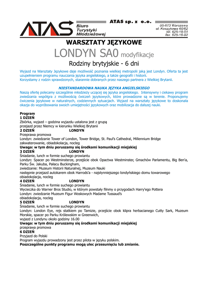 WARSZTATY JĘZYKOWE LONDYN SA0 modyfikacje Rodziny brytyjskie - 6 dni Wyjazd na Warsztaty Językowe daje możliwość poznania wielkiej metropolii jaką jest Londyn. Oferta ta jest uzupełnieniem programu nauczania języka angielskiego, a także geografii i historii. Korzystamy z rodzin sprawdzonych, starannie dobranych przez naszego partnera z Wielkiej Brytanii. NIESTANDARDOWA NAUKA JĘZYKA ANGIELSKIEGO Naszą ofertę polecamy szczególnie młodzieży uczącej się języka angielskiego. Intensywny i ciekawy program zwiedzania współgra z możliwością ćwiczeń językowych, które prowadzone są w terenie. Proponujemy ćwiczenia językowe w naturalnych, codziennych sytuacjach. Wyjazd na warsztaty językowe to doskonała okazja do wypróbowania swoich umiejętności językowych oraz mobilizacja do dalszej nauki. Program 1 DZIEŃ Zbiórka, wyjazd – godzina wyjazdu ustalona jest z grupą przejazd przez Niemcy w kierunku Wielkiej Brytanii 2 DZIEŃ LONDYN Przeprawa promowa Londyn: zwiedzanie Tower of London, Tower Bridge, St. Paul’s Cathedral, Millennium Bridge zakwaterowanie, obiadokolacja, nocleg Uwaga: w tym dniu poruszamy się środkami komunikacji miejskiej 3 DZIEŃ LONDYN Śniadanie, lunch w formie suchego prowiantu Londyn: Spacer po Westminsterze, przejście obok Opactwa Westminster, Gmachów Parlamentu, Big Ben'a, Parku Św. Jakuba, Pałacu Buckingham, zwiedzanie: Muzeum Historii Naturalnej, Muzeum Nauki następnie przejazd autokarem obok Harrods'a - najsłynniejszego londyńskiego domu towarowego obiadokolacja, nocleg 4 DZIEŃ LONDYN Śniadanie, lunch w formie suchego prowiantu Wycieczka do Warner Bros Studio, w którym powstały filnmy o przygodach Harry'ego Pottera Londyn: zwiedzanie Muzeum Figur Woskowych Madame Tussaud’s obiadokolacja, nocleg 5 DZIEŃ LONDYN Śniadanie, lunch w formie suchego prowiantu Londyn: London Eye, rejs statkiem po Tamizie, przejście obok klipra herbacianego Cutty Sark, Muzeum Morskie, spacer po Parku Królewskim w Greenwich, wyjazd z Londynu około godziny 16.00 Uwaga: w tym dniu poruszamy się środkami komunikacji miejskiej przeprawa promowa 6 DZIEŃ Przyjazd do Polski Program wyjazdu prowadzony jest przez pilota w języku polskim. Poszczególne punkty programu mogą ulec przesunięciu lub zmianie. INFORMACJE O WARSZTATACH: Termin wyjazdu: 8-13.05.2017, 6 dni Wiek uczestników: minimum 12 lat Cena warsztatów: (do ceny warsztatów należy doliczyć opłatę za transport) Warsztaty - cena podawana na osobę* 39-42 uczestników + 3 nauczycieli 43-47 uczestników + 4 nauczycieli 48-51 uczestników + 4 nauczycieli 910 PLN 870 PLN 850 PLN Maj - Czerwiec 2017 *W przypadku innej liczebności grup kalkulacja będzie przygotowana na zamówienie. Transport: CENA podawana na osobę Autokar 300 PLN Dopłaty: - dobrowolne ubezpieczenie od kosztów rezygnacji – 3% całkowitej ceny imprezy (w ciągu 3 dni roboczych od podpisania umowy) - 100 pln/osobę powyżej 19 roku życia oraz koszty wstępów i realizacji programu 145,- GBP - ubezpieczenie od chorób przewlekłych (nie objęte głównym ubezpieczeniem) – ok. 15 PLN/dzień Świadczenia: przejazd komfortowym autokarem przeprawa promowa zakwaterowanie: 3 noclegi w Londynie wyżywienie: 3 śniadania, 3 packed lunch, 3 obiadokolacje zeszyt ćwiczeń opieka pilota ubezpieczenia NNW i KL, bagaż AXA Zakwaterowanie: Zakwaterowanie u rodzin stwarza okazję do poznania zwyczajów panujących w Anglii. Rodziny są sprawdzone i starannie dobrane przez naszego partnera w Wielkiej Brytanii. Uczestnicy są zakwaterowani na obrzeżach Londynu. Kwaterujemy u rodzin z klasy średniej, zróżnicowanych kulturowo i etnicznie. Uczestnicy zakwaterowani są w pokojach 2-4 osobowych. Ze względu na typ zakwaterowania i bezpieczeństwo uczestników nie przewidujemy żadnych wyjść wieczornych, szczególnie indywidualnych. Wyżywienie W miejscu zakwaterowania uczestnicy otrzymują następujące posiłki: śniadania: płatki na mleku, tosty z dżemem, sok, herbata lunch: 2 kanapki, owoc, batonik, chipsy, napój (lunch wydawany jest w formie suchego prowiantu) obiadokolacje: jednodaniowy ciepły posiłek, herbata. Cena nie obejmuje: - biletów wstępów i realizacji programu: Wiek młodzieży liczony rocznikowo wyjazd w 2017 Młodzież młodsza < 16 lat 95 GBP Młodzież starsza ≥16 lat 125 GBP - 5 € – na toalety podczas przejazdu - wyżywienia podczas przejazdów (radzimy zabrać suchy prowiant na przejazd oraz ok. 50 PLN na posiłki) UWAGA: dokumentem uprawniającym do przekroczenia granicy jest ważny paszport lub dowód osobisty, prosimy każdego uczestnika o zabranie 1 średniej wielkości bagażu głównego oraz 1 sztuki bagażu podręcznego NAUKA JĘZYKA - ORGANIZATOR ATAS Sp. Z O.O.