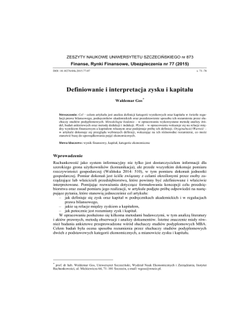 ZESZYTY NAUKOWE UNIWERSYTETU SZCZECIŃSKIEGO nr 873 Finanse, Rynki Finansowe, Ubezpieczenia nr 77 (2015) DOI: 10.18276/frfu.2015.77-07 s. 71–78 Definiowanie i interpretacja zysku i kapitału Waldemar Gos ∗ Streszczenie: Cel – celem artykułu jest analiza definicji kategorii wynikowych oraz kapitału w świetle regulacji prawa bilansowego, podręczników akademickich oraz przedstawienie sposobu ich rozumienia przez słuchaczy studiów podyplomowych. Metodologia badania – w opracowaniu wykorzystano metodę analizy źródeł, badań ankietowych oraz metodę dedukcji i indukcji. Wynik – w opracowaniu wskazuje się na relacje między wynikiem finansowym a kapitałem własnym oraz podejmuje próbę ich definicji. Oryginalność/Wartość – w artykule dokonuje się przeglądu wybranych definicji, wskazując na ich różnorodne rozumienie, co może stanowić bazę do uporządkowania pojęć ekonomicznych. Słowa kluczowe: wynik finansowy, kapitał, kategorie ekonomiczne Wprowadzenie Rachunkowość jako system informacyjny nie tylko jest dostarczycielem informacji dla szerokiego grona użytkowników (komunikacja), ale przede wszystkim dokonuje pomiaru rzeczywistości gospodarczej (Walińska 2014: 510), w tym pomiaru dokonań jednostki gospodarczej. Pomiar dokonań jest ściśle związany z celami określonymi przez osoby zarządzające lub właścicieli przedsiębiorstwa, które powinny być zdefiniowane i właściwie interpretowane. Pomijając rozważania dotyczące formułowania koncepcji celu przedsiębiorstwa oraz zasad pomiaru jego realizacji, w artykule podjęto próbę odpowiedzi na następujące pytania, które stanowią jednocześnie cel artykułu: – jak definiuje się zysk oraz kapitał w podręcznikach akademickich i w regulacjach prawa bilansowego, – jakie są relacje między zyskiem a kapitałem, – jak potocznie jest rozumiany zysk i kapitał. W opracowaniu posłużono się kilkoma metodami badawczymi, w tym analizą literatury i aktów prawnych, metodą obserwacji i analizy dokumentów. Istotne znaczenie miały również badania ankietowe przeprowadzone wśród słuchaczy studiów podyplomowych MBA. Celem badań była ocena sposobu rozumienia przez słuchaczy studiów podyplomowych dwóch z podstawowych kategorii ekonomicznych, a mianowicie zysku i kapitału. ∗ prof. dr hab. Waldemar Gos, Uniwersytet Szczeciński, Wydział Nauk Ekonomicznych i Zarządzania, Instytut Rachunkowości, ul. Mickiewicza 64, 71–101 Szczecin, e-mail: [email protected]. 72 Waldemar Gos 1. Definiowanie wyniku finansowego Każda nauka wypracowuje swój specyficzny język. Takim językiem posługuje się również rachunkowość. Można postawić tezę, że definicje podstawowych kategorii ekonomicznych sformułowane w rachunkowości są spójne. Dotyczy to przykładowo definicji: aktywów, zobowiązań, przychodów, kosztów. Odpowiedzi na pytania: czym jest zysk jednostki gospodarczej, skąd się bierze oraz jak go mierzyć, należą do żywotnych problemów teorii rachunkowości oraz ekonomii. Warto podkreślić, że kategoria zysku nie doczekała się powszechnie przyjętej definicji w naukach ekonomicznych (Wójtowicz 2010: 52). Analizując źródła internetowe można przykładowo odszukać następujące określenia: − wynik finansowy (wynik księgowy, wynik działalności) można zdefiniować jako porównanie dwóch strumieni zasobów wyrażonych w jednostkach pieniężnych: wpływających do firmy, które są zużywane w prowadzonej przez nią działalności gospodarczej (koszty) oraz wypływających z niej, zazwyczaj w formie sprzedawanych produktów (materialnych i niematerialnych) i otrzymywanych za nie aktywów pieniężnych lub wierzytelności (przychody) w okresie sprawozdawczym (encyklopedia zarządzania: www.mifiles.pl/index.php, 12.02.2015), − zyskiem określa się dodatni bilans finansowy, który stanowi realny zarobek przedsiębiorstwa; jest to jednocześnie nadwyżka sprzedaży nad wydatkami, która stanowi różnicę przychodów i kosztów; jest źródłem dochodów właścicieli przedsiębiorstw oraz jego finansowania i rozwoju (www.księgafirm.pl, 15.02.2015), − zyskiem ekonomicznym jest różnica między przychodami ze sprzedaży a całkowitymi kosztami ekonomicznymi, będącymi sumą kosztów explicite i implicite (www.cotojestinfo.pl, 15.02.2015). Próbując zdefiniować i zinterpretować wynik finansowy można posłużyć się zarówno literaturą, jak i regulacjami prawa bilansowego. Z przeglądu literatury wynika wniosek, że najczęściej wynik finansowy określa się jako różnicę między przychodami a kosztami (WF = P – K). Jeżeli przychody są wyższe od kosztów, to jednostka osiągnęła zysk. W odwrotnej sytuacji występuje strata. Niestety tak zdefiniowany wynik finansowy nie określa jego istoty. Nie można wskazać, o czym on informuje. Dlatego, dla poprawności zdefiniowania wyniku finansowego warto przytoczyć definicje przychodów i kosztów określone w ustawie o rachunkowości, a mianowicie: 1. Przychody i zyski oznaczają: – uprawdopodobnione powstanie w okresie sprawozdawczym korzyści ekonomicznych, – o wiarygodnie określonej wartości, – w formie zwiększenia aktywów albo zmniejszenia wartości zobowiązań, – które doprowadzą do wzrostu kapitału własnego lub zmniejszenia jego niedoboru w inny sposób niż wniesienie środków przez udziałowców lub właścicieli. 2. Koszty i straty wyrażają: – uprawdopodobnione zmniejszenia w okresie sprawozdawczym korzyści ekonomicznych, – o wiarygodnie określonej wartości, – w formie zmniejszenia wartości aktywów albo zwiększenia wartości zobowiązań i rezerw, Definiowanie i interpretacja zysku i kapitału 73 – które doprowadzą do zmniejszenia kapitału własnego lub zwiększenia jego niedoboru w inny sposób niż wycofanie środków przez udziałowców lub właścicieli. Na podstawie określeń przychodów i kosztów można stwierdzić, że wynik finansowy inf