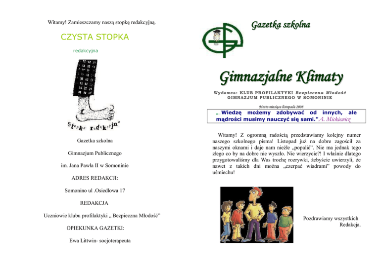 Witamy! Zamieszczamy naszą stopkę redakcyjną. Gazetka szkolna CZYSTA STOPKA redakcyjna Gimnazjalne Klimaty Wy da wc a : KLU B P R OF ILAKT Y KI Bezp ieczn a M ło d oś ć G IMN AZJU M P U BLIC ZN EG O W S O MON IN IE Motto miesiąca listopada 2008 „.Wiedzę możemy zdobywać od innych, ale mądrości musimy nauczyć się sami."A. Mickiewicz Gazetka szkolna Gimnazjum Publicznego im. Jana Pawła II w Somoninie Witamy! Z ogromną radością przedstawiamy kolejny numer naszego szkolnego pisma! Listopad już na dobre zagościł za naszymi oknami i daje nam nieźle „popalić”. Nie ma jednak tego złego co by na dobre nie wyszło. Nie wierzycie?! I właśnie dlatego przygotowaliśmy dla Was trochę rozrywki, żebyście uwierzyli, że nawet z takich dni można „czerpać wiadrami” powody do uśmiechu! ADRES REDAKCJI: Somonino ul .Osiedlowa 17 REDAKCJA Uczniowie klubu profilaktyki „ Bezpieczna Młodość” OPIEKUNKA GAZETKI: Ewa Littwin- socjoterapeuta Pozdrawiamy wszystkich Redakcja. Listopadowy numer zawiera: 1. Jan Paweł II – wychowawca młodych 2. Wywiad z Panią Beatą Okroy 3. Odkrywamy talenty 4. Wszystko o wsiach i ich mieszkańcach 5. Czy warto kupować w lumpeksach? 6. Dlaczego młodzież w młodym wieku sięga po papierosy? 7. Wywiad z Panią Krystyną Szwaba 8. Lekcja historii … „Jan Paweł II - wychowawca młodych” Z pewnością prawie każdy człowiek posiada swój ideał, którego chciałby naśladować. Ja również taką osobę sobie wybrałem. Jest nią Jan Paweł II. To właśnie on jako pierwszy papież w historii jeździł na pielgrzymki do innych krajów Europy. Na każdej z nich zawsze gorąco dziękował wszystkim za przybycie, a w szczególności młodym, w których widział przyszłość Kościoła, chrześcijaństwa i świata. W każdym kraju zawsze zostawiał jakąś myśl, hasło, które rozpamiętuje się przez długie lata i jest przekazywane z pokolenia na pokolenie. Często nawet, jak w przypadku Polski, jego nauki zmieniły losy narodu i napełniły ludzi wewnętrzną siła, która pomagała im walczyć z przeciwnościami i wrogiem. Jan Paweł II w swoim życiu bardzo dużo cierpiał. Najpierw wcześnie stracił swoją rodzinę, później jak inni, musiał zmagać się z okupantem. Kiedy zaś został papieżem przeżył zapach, który został wykonany na niego przez tureckiego zamachowcy 13 maja 1981roku. To właśnie wydarzenie było początkiem wielkich 9. 21 listopada – Światowy Dzień Życzliwości problemów zdrowotnych Ojca Świętego. Kilka lat po tym zachorował na nieuleczalną 10. Mamy samorząd chorobę Parkinsona, z którą zmagał się aż do śmierci. Cierpienie i ból przyjmował jako 11. Moja klasa 1D swój krzyż, mimo swojego wieku. Na pierwszym miejscu stawiał jednak Matkę Boską, 12. Trochę humoru przeznaczenie wydawane przez Boga. Zawsze powtarzał, że każdy musi nieść w życiu której zawierzył całą swoją pielgrzymkę na ziemi. Zawsze starał się, gdy miał taką możliwość, spotykać się z wiernymi z całego świata. Jestem dymny, że jestem uczniem gimnazjum, którego patronem jest Jan Paweł II, gdyż podczas swojego pontyfikatu, trwającego 27 lat, przekazał wszystkim wiernym, w tym także i młodym ludziom, swoją wiedzę na temat religii i postępowaniu godne byciem uczniem Jezusa. Każdy więc powinien czynić jak on nakazał i jego nauką zarażać innych, a na pewno świat stanie się lepszym. Napisał: Arkadiusz Piernicki Odkrywamy talenty … Wywiad z Panią Beatą Okroy! 1. Dlaczego wybrała Pani zawód nauczyciela? Zawód ten wybrałam, ponieważ lubię pracę z młodzieżą i dzielić się wiedzą, którą posiadam. 2. Dlaczego to akurat matematyka, fizyka i chemia stały się Pani pasją? Mówią, że mam ścisły umysł. A co to się za tym kryje... 3. Jaki był Pani stosunek do matematyki, fizyki i chemii w czasach młodzieńczych? Od dawna powtarzam uczniom, że lubiłam od zawsze te przedmioty. A najbardziej matematykę, potem chemię i fizykę. 4.Czy zawsze była Pani dobra z matematyki, fizyki i chemii? Nie tylko z tych trzech przedmiotów. :-) 5. Jaka dziedzina wiedzy jest Pani słabym punktem? Literatura piękna. 6. Co pani sądzi o egzaminie gimnazjalnym? Czy myśli Pani, że jest to dobra forma sprawdzenia wiadomości? Reforma szkolna przyniosła wiele zmian, które musimy przyjąć i zaakceptować. 7. Skąd Pani pochodzi? Gdzie Pani uczęszczała do szkoły? Mieszkam od dziecka w Goręczynie, tam też chodziłam do szkoły podstawowej, liceum zakończyłam w Kartuzach, a studia w Gdańsku. 8. Co chciałaby Pani zmienić w naszej szkole? Jeśli mogłabym coś zmienić, to podejście do nauczyciela. 9. Jakie jest Pani hobby? Chemia żywności, biochemia i film SCI. Kawa To kolejna, mocna kawa, Czarna jak piekielna zjawa, Twarz wygina, zmysły psuje, Przypływ mocy, już ją czuję. Na tą kartkę, wszystkie wizje, Rozpoczynam mózgu rewizje, Science Fiction czy Fantasy, Drożdżóweczki czy też zrazy. Chaos myśli niepojęty, Wyraz twarzy wciąż wygięty, To jest kawa, o tak działa, A to dawka była mała. Tyle słów, sensu żadnego, Ta moc rozbudzi każdego, Zabawne są te słowa, A linijka następna, nowa. Prawda o szkole Jak wygląda prawdziwa szkoła? Uczniowie mówią, że to niewola! Ciemne korytarze, stracony czas, żadnego pożytku z niej nie masz. Zaś nauczyciele z niej pożytek mają, pieniądze za ściemnianie dostają. Połowę tylko prawdy powiedzą, bo całej sami nie wiedzą. Prac domowych dużo zadają i tak tego nigdy nie oceniają. Więc pomyślcie, po co je zadawać, lepiej na inny temat porozmawiać. Uczniowie będą z tego zadowoleni i na 100% nauczyciele zostaną wynagrodzeni. Nie o zdradzie czy miłości, Nie o dobrze czy też złości, Tylko o kofeinie, Pisze na tej krainie 10. Jak spędza Pani wolny czas? Na sportowo- treningi koszykówki. 11. Z którą klasą najlepiej się Pani pracuje? Lubię pracować w tych klasach, w których uczę. DZIĘK