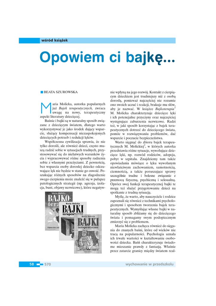 wÊród ksià˝ek Opowiem ci bajk´... BEATA SZUROWSKA M aria Molicka, autorka popularnych ju˝ Bajek terapeutycznych, zwraca uwag´ na nowy, terapeutyczny aspekt literatury dzieci´cej. BaÊnie i bajki sà w naturalny sposób zwiàzane z dzieci´cym Êwiatem, dlatego warto wykorzystywaç je jako Êrodek dajàcy wsparcie, s∏u˝àcy kompensacji niezaspokojonych dzieci´cych potrzeb i redukcji l´ków. Wspó∏czesna cywilizacja sprawia, ˝e nie tylko doroÊli, ale równie˝ dzieci, cz´sto muszà radziç sobie w sytuacjach trudnych, przystosowywaç si´ do nie∏atwych warunków ˝ycia i wypracowywaç ró˝ne sposoby radzenia sobie z w∏asnymi prze˝yciami. Z pewnoÊcià, bez wsparcia osoby doros∏ej dziecko odczuwajàce l´k nie b´dzie w stanie go oswoiç. Poszukujàc ró˝nych sposobów na z∏agodzenie swego cierpienia mo˝e znaleêç si´ w pu∏apce patologicznych strategii (np. agresja, izolacja, bunt, objawy nerwicowe), które negatyw- 58 570 nie wp∏ynà na jego rozwój. Kontakt z cierpiàcym dzieckiem jest trudniejszy ni˝ z osobà doros∏à, poniewa˝ najcz´Êciej nie rozumie ono swoich uczuç i reakcji, brakuje mu s∏ów, aby je nazwaç. W ksià˝ce Bajkoterapia1 M. Molicka charakteryzuje dzieci´ce l´ki i ich potencjalne przyczyny oraz najcz´Êciej wyst´pujàce zaburzenia nerwicowe. Radzi te˝, w jaki sposób korzystajàc z bajek terapeutycznych dotrzeç do dzieci´cego Êwiata, pomóc w rozwiàzywaniu problemów, daç wsparcie i poczucie bezpieczeƒstwa. Warto si´gnàç do zbioru bajek terapeutycznych M. Molickiej2, w których autorka przedstawia ró˝ne sytuacje, wywo∏ujàce dzieci´ce l´ki, np. rozwód rodziców, adopcja, pobyt w szpitalu. Znajdziemy tam tak˝e opowiadania mówiàce o l´ku wywo∏anym niew∏aÊciwym zachowaniem, samotnoÊcià, ciemnoÊcià, a tak˝e poruszajàce sprawy szczególnie trudne i bolesne zwiàzanie z przemocà fizycznà, psychicznà i seksualnà. Oprócz swej funkcji terapeutycznej bajki te mogà te˝ s∏u˝yç przygotowaniu dzieci na spotkanie z trudnà sytuacjà. MyÊl´, ˝e warto, aby nauczyciele i rodzice zapoznali si´ równie˝ z technikami psychologicznymi i sposobem tworzenia bajek terapeutycznych. WymyÊlajàc w∏asne bajki w naturalny sposób zbli˝amy si´ do dzieci´cego Êwiata i pomagamy swym podopiecznym zmierzyç si´ z problemem. Maria Molicka zach´ca równie˝ do si´gania do znanych baÊni, które od wieków nie tracà na popularnoÊci. Psychologia uzna∏a ich trwa∏e wartoÊci w kszta∏towaniu osobowoÊci dziecka. Baʃ charakteryzuje Êwiadome mieszanie prawdy z fantazjà. W∏aÊnie przez zatarcie granicy mi´dzy Êwiatem real- wychowanie w przedszkolu wÊród ksià˝ek nym i fantastycznym dziecko styka si´ po raz pierwszy z poetyckà wizjà Êwiata, gdzie razem z baÊniowym bohaterem (który zawsze ostatecznie radzi sobie z trudnà sytuacjà) prze˝ywa wspania∏e przygody, a oswajajàc si´ z zagro˝eniem w naturalny sposób uwalnia si´ od l´ku. Nie wolno odebraç dziecku baÊni, bo ona dzi´ki swojemu czarowi zaspokaja jego podstawowe potrzeby psychiczne i odgrywa znaczàcà rol´ w prawid∏owym rozwoju dzieci´cej osobowoÊci. Mam nadziej´, ˝e lektura ksià˝ek M. Molickiej pomo˝e zrozumieç rodzicom i nauczycielom, ˝e w∏aÊciwie dobrana, adekwatna do wieku i problemów dziecka literatura pomaga poznawaç inne sposoby myÊlenia i dzia∏ania, daje wsparcie w sytuacjach trudnych, kompensuje niezaspokojone potrzeby, relaksuje, kszta∏tuje pozytywny obraz w∏asnej osoby i daje si∏´ do radzenia sobie w otaczajàcym Êwiecie. M. Molicka, Bajkoterapia, Poznaƒ 2002, Media Rodzina. M. Molicka, Bajki terapeutyczne, Poznaƒ 1999, cz´Êç 2 – 2003, Media Rodzina. 1 2 e i z D cko w Êwiecie mediów HANNA RATYƒSKA K sià˝ka sk∏ada si´ z kilkunastu rozdzia∏ów opracowanych przez ró˝nych autorów, którzy poszukujà odpowiedzi na pytania, jaki obraz dziecka wy∏ania si´ z przekazów medialnych, a jednoczeÊnie, co wspó∏czesna kultura proponuje dzieciom. Prawie wszystkie przedstawione teksty powsta∏y na podstawie badaƒ socjologicznych prowadzonych na ogó∏ w latach 2001–2003. Ich tematy sà dosyç zró˝nicowane, o czym Êwiadczà m.in. tytu∏y rozdzia∏ów: Wizerunek dziecka w reklamie telewizyjnej, Obraz dziecka w prasie i telewizji, Dziecko we wspó∏czesnej kulturze Zachodu, Nowa przestrzeƒ dziecka we wspó∏czesnej kulturze. 9/2004 Nauczyciele przedszkoli obserwujàc stale zabawy i zaj´cia dzieci wiedzà doskonale, mo˝e lepiej ni˝ inni, jak wielki wp∏yw wywiera telewizja na ich podopiecznych. Rodzi to wiele pytaƒ i niepokojów, na które w ksià˝ce nie znajdziemy prostych odpowiedzi. Natomiast jej lektura pomo˝e w sposób krytyczny odnieÊç si´ do pewnych medialnych zjawisk, jak równie˝ zwraca uwag´ na fakty, które mogà niepokoiç dzieci i rodziców. I tak na przyk∏ad autorka rozdzia∏u Wizerunek medialny dziecka niepe∏nosprawnego na podstawie analizy programów telewizyjnych i artyku∏ów prasowych na ten temat zastanawia si´, czy wizerunek takiego dziecka jest konsekwencjà potocznych poj´ç, czy ma moc kreacyjnà. Autorka zwraca uwag´ na dwa warianty tych przekazów: komercyjny, wÊród 571 59