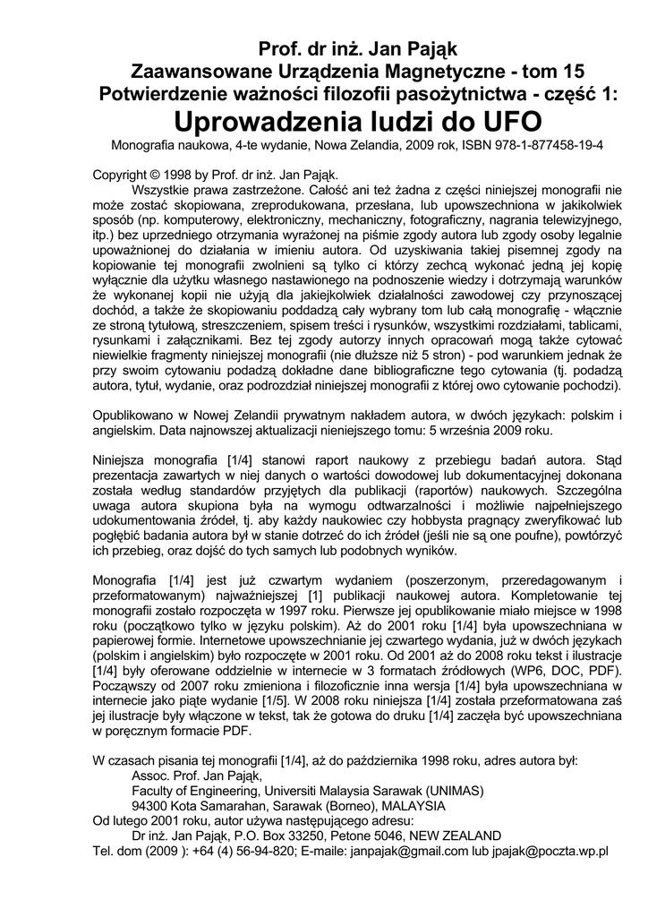 Prof. dr inż. Jan Pająk Zaawansowane Urządzenia Magnetyczne - tom 15 Potwierdzenie ważności filozofii pasożytnictwa - część 1: Uprowadzenia ludzi do UFO Monografia naukowa, 4-te wydanie, Nowa Zelandia, 2009 rok, ISBN 978-1-877458-19-4 Copyright © 1998 by Prof. dr inż. Jan Pająk. Wszystkie prawa zastrzeżone. Całość ani też żadna z części niniejszej monografii nie może zostać skopiowana, zreprodukowana, przesłana, lub upowszechniona w jakikolwiek sposób (np. komputerowy, elektroniczny, mechaniczny, fotograficzny, nagrania telewizyjnego, itp.) bez uprzedniego otrzymania wyrażonej na piśmie zgody autora lub zgody osoby legalnie upoważnionej do działania w imieniu autora. Od uzyskiwania takiej pisemnej zgody na kopiowanie tej monografii zwolnieni są tylko ci którzy zechcą wykonać jedną jej kopię wyłącznie dla użytku własnego nastawionego na podnoszenie wiedzy i dotrzymają warunków że wykonanej kopii nie użyją dla jakiejkolwiek działalności zawodowej czy przynoszącej dochód, a także że skopiowaniu poddadzą cały wybrany tom lub całą monografię - włącznie ze stroną tytułową, streszczeniem, spisem treści i rysunków, wszystkimi rozdziałami, tablicami, rysunkami i załącznikami. Bez tej zgody autorzy innych opracowań mogą także cytować niewielkie fragmenty niniejszej monografii (nie dłuższe niż 5 stron) - pod warunkiem jednak że przy swoim cytowaniu podadzą dokładne dane bibliograficzne tego cytowania (tj. podadzą autora, tytuł, wydanie, oraz podrozdział niniejszej monografii z której owo cytowanie pochodzi). Opublikowano w Nowej Zelandii prywatnym nakładem autora, w dwóch językach: polskim i angielskim. Data najnowszej aktualizacji nieniejszego tomu: 5 września 2009 roku. Niniejsza monografia [1/4] stanowi raport naukowy z przebiegu badań autora. Stąd prezentacja zawartych w niej danych o wartości dowodowej lub dokumentacyjnej dokonana została według standardów przyjętych dla publikacji (raportów) naukowych. Szczególna uwaga autora skupiona była na wymogu odtwarzalności i możliwie najpełniejszego udokumentowania źródeł, tj. aby każdy naukowiec czy hobbysta pragnący zweryfikować lub pogłębić badania autora był w stanie dotrzeć do ich źródeł (jeśli nie są one poufne), powtórzyć ich przebieg, oraz dojść do tych samych lub podobnych wyników. Monografia [1/4] jest już czwartym wydaniem (poszerzonym, przeredagowanym i przeformatowanym) najważniejszej [1] publikacji naukowej autora. Kompletowanie tej monografii zostało rozpoczęta w 1997 roku. Pierwsze jej opublikowanie miało miejsce w 1998 roku (początkowo tylko w języku polskim). Aż do 2001 roku [1/4] była upowszechniana w papierowej formie. Internetowe upowszechnianie jej czwartego wydania, już w dwóch językach (polskim i angielskim) było rozpoczęte w 2001 roku. Od 2001 aż do 2008 roku tekst i ilustracje [1/4] były oferowane oddzielnie w internecie w 3 formatach źródłowych (WP6, DOC, PDF). Począwszy od 2007 roku zmieniona i filozoficznie inna wersja [1/4] była upowszechniana w internecie jako piąte wydanie [1/5]. W 2008 roku niniejsza [1/4] została przeformatowana zaś jej ilustracje były włączone w tekst, tak że gotowa do druku [1/4] zaczęła być upowszechniana w poręcznym formacie PDF. W czasach pisania tej monografii [1/4], aż do października 1998 roku, adres autora był: Assoc. Prof. Jan Pająk, Faculty of Engineering, Universiti Malaysia Sarawak (UNIMAS) 94300 Kota Samarahan, Sarawak (Borneo), MALAYSIA Od lutego 2001 roku, autor używa następującego adresu: Dr inż. Jan Pająk, P.O. Box 33250, Petone 5046, NEW ZEALAND Tel. dom (2009 ): +64 (4) 56-94-820; E-maile: [email protected] lub [email protected] 2 STRESZCZENIE tomu 15 monografii [1/4] "Zaawansowane urządzenia magnetyczne", ISBN 978-1-877458-19-4 Przyglądnij się dokładniej swoim bliskim i znajomym. Może ci się wydawać, że znasz ich przejścia i najważniejsze powiązania. Ale czy jest tak naprawdę? Wszakże, zgodnie z moimi badaniami, istnieje ukryty składnik ich życia, z obecności którego nawet oni sami nie zdają sobie sprawy. Podobnie bowiem jak ty sam (a także i ja), oni wszyscy są "nieświadomymi ofiarami powtarzalnych uprowadzeń do UFO", czyli osobami systematycznie uprowadzanymi do UFO bez swojej wiedzy i woli, jednak nie mającymi najmniejszego pojęcia o istnieniu tych uprowadzeń. Nocami, najczęściej pomiędzy 2 a 5 nad ranem, gdy pogrążeni oni są w głębokim śnie, do ich sypialni wnika niewidzialny wehikuł UFO z grupą nieziemsko wyglądających istot. Umieszczają one na stole operacyjnym swego statku zahipnotyzowaną uprzednio przez siebie osobę na jaką właśnie przyszła kolej do uprowadzenia i do eksploatacji biologicznej. Poczym poddają ją różnorodnym zabiegom eksploatacyjnym, o przebiegu których ciągle niewiele nam jeszcze wiadomo. W niemal wszystkich przypadkach zabiegi te są bolesne i upokarzające. Bardzo często też kończą się one zgwałceniem tej osoby przez UFOnautę lub UFOnautkę. Potem, z użyciem specjalnej hipnotyzującej maszyny dokładnie wymazują kluczowe fakty z jej pamięci. Przez to nie jest ona w stanie niczego sobie potem przypomnieć. Ponadto całe uprowadzenie ukrywają poza sztucznie zaindukowanym "snem maskującym". W normalnych więc okolicznościach, po uprowadzeniu pozostaje ofiarze jedynie niewielka migrena, a tylko niekiedy również inne następstwa - np. przesterowanie czy nawet przepalenie któregoś z pobliskich urządzeń elektrycznych. Kim więc są owe "nieświadome ofiary systematycznych uprowadzeń do UFO"? Ano, do ich grupy należy każdy z nas, włączając w to i ciebie czytelniku, a także wszystkie osoby jakie najbardziej kochasz. Każdy z nas jest bowiem powtarzalnie zabierany na pokład UFO, nie mając o tym najmniejszego pojęcia. Niniejszy zaś rozdział udowodni ci to ponad wszelką wątpliwość. Zabieranie to nie następuje tylko raz w życiu
