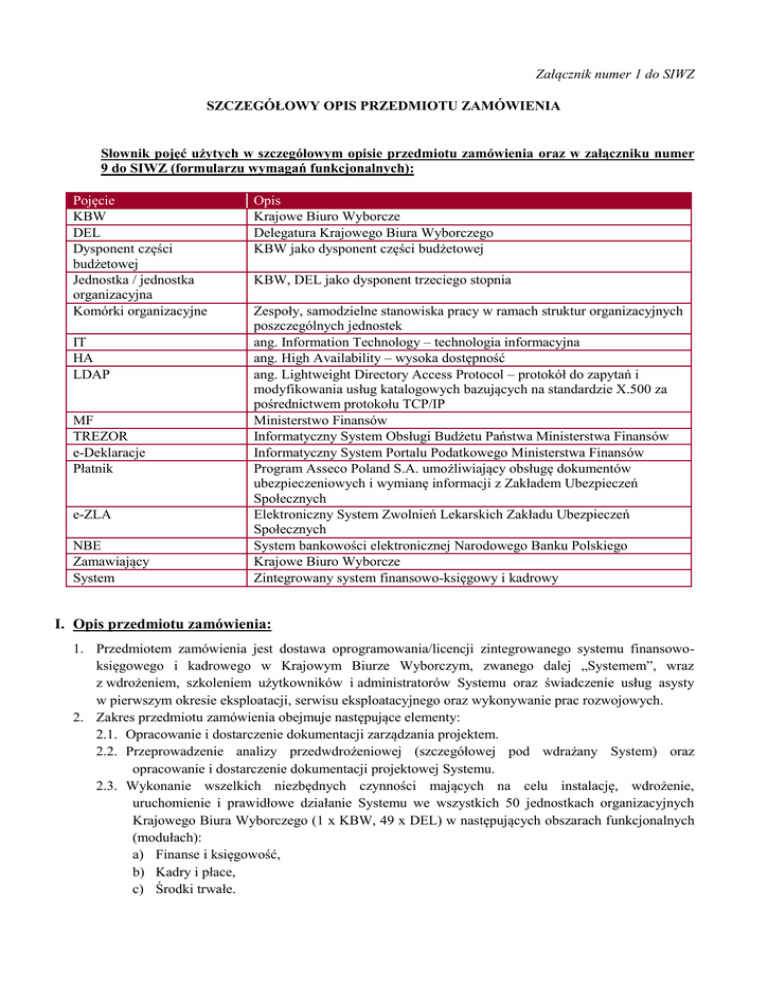 Załącznik numer 1 do SIWZ SZCZEGÓŁOWY OPIS PRZEDMIOTU ZAMÓWIENIA Słownik pojęć użytych w szczegółowym opisie przedmiotu zamówienia oraz w załączniku numer 9 do SIWZ (formularzu wymagań funkcjonalnych): Pojęcie KBW DEL Dysponent części budżetowej Jednostka / jednostka organizacyjna Komórki organizacyjne IT HA LDAP MF TREZOR e-Deklaracje Płatnik e-ZLA NBE Zamawiający System Opis Krajowe Biuro Wyborcze Delegatura Krajowego Biura Wyborczego KBW jako dysponent części budżetowej KBW, DEL jako dysponent trzeciego stopnia Zespoły, samodzielne stanowiska pracy w ramach struktur organizacyjnych poszczególnych jednostek ang. Information Technology – technologia informacyjna ang. High Availability – wysoka dostępność ang. Lightweight Directory Access Protocol – protokół do zapytań i modyfikowania usług katalogowych bazujących na standardzie X.500 za pośrednictwem protokołu TCP/IP Ministerstwo Finansów Informatyczny System Obsługi Budżetu Państwa Ministerstwa Finansów Informatyczny System Portalu Podatkowego Ministerstwa Finansów Program Asseco Poland S.A. umożliwiający obsługę dokumentów ubezpieczeniowych i wymianę informacji z Zakładem Ubezpieczeń Społecznych Elektroniczny System Zwolnień Lekarskich Zakładu Ubezpieczeń Społecznych System bankowości elektronicznej Narodowego Banku Polskiego Krajowe Biuro Wyborcze Zintegrowany system finansowo-księgowy i kadrowy I. Opis przedmiotu zamówienia: 1. Przedmiotem zamówienia jest dostawa oprogramowania/licencji zintegrowanego systemu finansowoksięgowego i kadrowego w Krajowym Biurze Wyborczym, zwanego dalej „Systemem”, wraz z wdrożeniem, szkoleniem użytkowników i administratorów Systemu oraz świadczenie usług asysty w pierwszym okresie eksploatacji, serwisu eksploatacyjnego oraz wykonywanie prac rozwojowych. 2. Zakres przedmiotu zamówienia obejmuje następujące elementy: 2.1. Opracowanie i dostarczenie dokumentacji zarządzania projektem. 2.2. Przeprowadzenie analizy przedwdrożeniowej (szczegółowej pod wdrażany System) oraz opracowanie i dostarczenie dokumentacji projektowej Systemu. 2.3. Wykonanie wszelkich niezbędnych czynności mających na celu instalację, wdrożenie, uruchomienie i prawidłowe działanie Systemu we wszystkich 50 jednostkach organizacyjnych Krajowego Biura Wyborczego (1 x KBW, 49 x DEL) w następujących obszarach funkcjonalnych (modułach): a) Finanse i księgowość, b) Kadry i płace, c) Środki trwałe. 2.4. Dostawę wszelkiego wymaganego oprogramowania niezbędnego do zapewnienia wdrożenia i prawidłowego funkcjonowania Systemu centralnego z dostępem poprzez WAN/LAN dla 90 użytkowników, w tym w szczególności systemów operacyjnych, oprogramowania aplikacyjnego, bazodanowego (bez ograniczeń dla liczby użytkowników), narzędziowego wraz z licencjami oraz instalację i konfigurację tego oprogramowania. Zamawiający nie wymaga dostarczenia oprogramowania wirtualizacyjnego, przy czym System powinien działać poprawnie i wydajnie na posiadanym przez Zamawiającego serwerze wirtualnym pod kontrolą oprogramowania VMware spełniającym warunki opisane w części WYMAGANIA TECHNICZNE . SERWER. Zamawiający nie wymaga dostarczenia systemu operacyjnego na komputery użytkowników, przy czym zaproponowane rozwiązanie musi pracować na stacjach roboczych działających pod kontrolą systemu Microsoft Windows 7/8/10 (wersje 32- i 64-bitowe), spełniających warunki opisane w części VI WYMAGANIA TECHNICZNE . STACJA KLIENCKA . 2.5. Konfigurację infrastruktury sprzętowej składającej się w szczególności z serwera, macierzy dyskowych i innych urządzeń niezbędnych do wdrożenia, uruchomienia oraz prawidłowego działania Systemu. Zamawiający zapewni sprzęt spełniający wymagania dotyczące funkcjonalności i dostępności określone w części WYMAGANIA TECHNICZNE . SERWER. 2.6. Wykonanie i dostarczenie dokumentacji użytkowej oraz dokumentacji powdrożeniowej Systemu, w tym dokumentacji, o której mowa w art. 10 ust. 1 pkt 3 lit. b i c oraz pkt 4 ustawy z dnia 29 września 1994 r. o rachunkowości (Dz. U. z 2016 r. poz. 1047) w zakresie dokumentacji przewidzianej dla ksiąg rachunkowych prowadzonych przy użyciu komputera. 2.7. Opracowanie Planu Migracji – przygotowanie i przeprowadzenie migracji danych z obecnie wykorzystywanych przez Zamawiającego systemów informatycznych do nowego Systemu. Zamawiający informuje, że aktualnie użytkuje systemy następujących producentów (jako producenta przyjęto podmiot, który był nim w dniu zakupu licencji): a) „ALBIT” ARKADIUSZ LUĆKO; b) „ARISCO” SP. Z O.O.; c) „ETOB” SP. Z O.O.; d) „INSERT” S.A.; e) IPC Soft Bielsko-Biała; f) „USŁUGI INFORMATYCZNE INFO-SYSTEM” ROMAN I TADEUSZ GROSZEK SP. J.; g) ASSECO BUSINESS SOLUTIONS S.A.; h) BIURO USŁUG INFORMATYCZNYCH T-SOFT S.C. WOJCIECH TCHÓRZEWSKI, CECYLIA TCHÓRZEWSKA; i) COMARCH S.A.; j) E-Serwis Henryk Rachuba; k) MACROLOGIC S.A.; l) MARZENNA GROCHOWSKA PRZEDSIĘBIORSTWO INFORMATYCZNE „MAGRO”; m) MATRIX.PL S.A; n) MIKROBIT SP. Z O.O.; o) PIOTR RACZYŃSKI POLSOFT – SYSTEMY INFORMATYCZNE; p) PIWOWARCZYK MAREK „EMPI” PRZEDSIĘBIORSTWO USŁUGOWO-HANDLOWE; q) PRZEDSIĘBIORSTWO INFORMATYKI „ETOB-RES” SP. Z O.O.; r) PRZEDSIĘBIORSTWO TECHNICZNO-HANDLOWE BDF-ELIN SP. Z O.O.; s) QNT SYSTEMY INFORMATYCZNE SP. Z O.O.; t) REKORD SI SP. Z O.O.; u) RESET 2 SP. Z O.O.; v) SAGE SP. Z O.O.; w) SOFTHARD S.A.; x) STREAMSOFT SP. Z O.O. SP. K.; y) TADEUSZ SKOWRONEK USŁUGI KOMPUTEROWE – OPROGRAMOWANIE; z) UNIFACTOR S.A.; aa) UNIKOM JÓZEF SZPAKOWSKI; bb) WOLTERS KLUWER S.A.; cc) ZAKŁAD ZASTOSOWAŃ INFORMATYKI FINSOFT-PLUS S. C. MARCIN DUTKIEWICZ, MACIEJ DUTKIEWICZ. Szczegółowy wykaz użytkowanych systemów w poszczególnych jednostkach zawiera Załącznik numer 1a do SIWZ. Zamawiający informuje, że nie posiada wsparcia producentów aktualnie wykorzystywanego oprogramowania w celu przygotowania danych do migracji. Wszystkie
