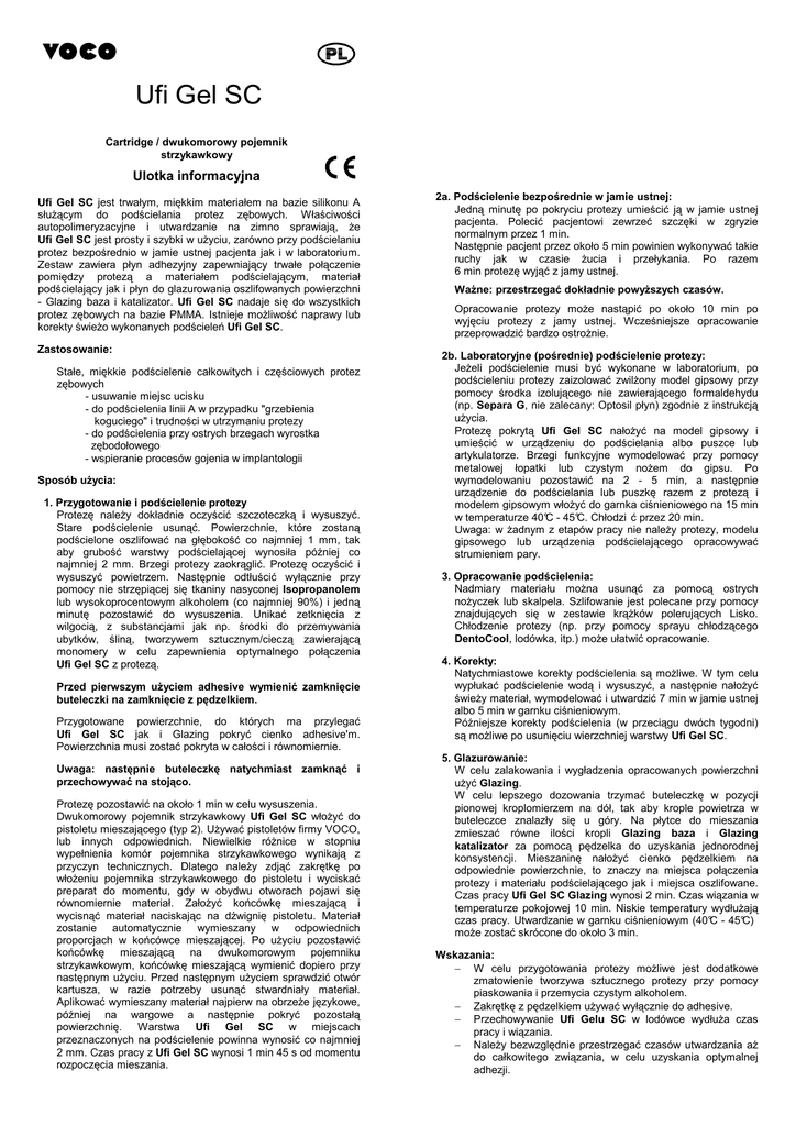 Ufi Gel SC Cartridge / dwukomorowy pojemnik strzykawkowy Ulotka informacyjna Ufi Gel SC jest trwałym, miękkim materiałem na bazie silikonu A słuŜącym do podścielania protez zębowych. Właściwości autopolimeryzacyjne i utwardzanie na zimno sprawiają, Ŝe Ufi Gel SC jest prosty i szybki w uŜyciu, zarówno przy podścielaniu protez bezpośrednio w jamie ustnej pacjenta jak i w laboratorium. Zestaw zawiera płyn adhezyjny zapewniający trwałe połączenie pomiędzy protezą a materiałem podścielającym, materiał podścielający jak i płyn do glazurowania oszlifowanych powierzchni - Glazing baza i katalizator. Ufi Gel SC nadaje się do wszystkich protez zębowych na bazie PMMA. Istnieje moŜliwość naprawy lub korekty świeŜo wykonanych podścieleń Ufi Gel SC. Zastosowanie: Stałe, miękkie podścielenie całkowitych i częściowych protez zębowych - usuwanie miejsc ucisku - do podścielenia linii A w przypadku "grzebienia koguciego" i trudności w utrzymaniu protezy - do podścielenia przy ostrych brzegach wyrostka zębodołowego - wspieranie procesów gojenia w implantologii Sposób uŜycia: 1. Przygotowanie i podścielenie protezy Protezę naleŜy dokładnie oczyścić szczoteczką i wysuszyć. Stare podścielenie usunąć. Powierzchnie, które zostaną podścielone oszlifować na głębokość co najmniej 1 mm, tak aby grubość warstwy podścielającej wynosiła później co najmniej 2 mm. Brzegi protezy zaokrąglić. Protezę oczyścić i wysuszyć powietrzem. Następnie odtłuścić wyłącznie przy pomocy nie strzępiącej się tkaniny nasyconej Isopropanolem lub wysokoprocentowym alkoholem (co najmniej 90%) i jedną minutę pozostawić do wysuszenia. Unikać zetknięcia z wilgocią, z substancjami jak np. środki do przemywania ubytków, śliną, tworzywem sztucznym/cieczą zawierającą monomery w celu zapewnienia optymalnego połączenia Ufi Gel SC z protezą. Przed pierwszym uŜyciem adhesive wymienić zamknięcie buteleczki na zamknięcie z pędzelkiem. Przygotowane powierzchnie, do których ma przylegać Ufi Gel SC jak i Glazing pokryć cienko adhesive'm. Powierzchnia musi zostać pokryta w całości i równomiernie. Uwaga: następnie buteleczkę natychmiast zamknąć i przechowywać na stojąco. Protezę pozostawić na około 1 min w celu wysuszenia. Dwukomorowy pojemnik strzykawkowy Ufi Gel SC włoŜyć do pistoletu mieszającego (typ 2). UŜywać pistoletów firmy VOCO, lub innych odpowiednich. Niewielkie róŜnice w stopniu wypełnienia komór pojemnika strzykawkowego wynikają z przyczyn technicznych. Dlatego naleŜy zdjąć zakrętkę po włoŜeniu pojemnika strzykawkowego do pistoletu i wyciskać preparat do momentu, gdy w obydwu otworach pojawi się równomiernie materiał. ZałoŜyć końcówkę mieszającą i wycisnąć materiał naciskając na dźwignię pistoletu. Materiał zostanie automatycznie wymieszany w odpowiednich proporcjach w końcówce mieszającej. Po uŜyciu pozostawić końcówkę mieszającą na dwukomorowym pojemniku strzykawkowym, końcówkę mieszającą wymienić dopiero przy następnym uŜyciu. Przed następnym uŜyciem sprawdzić otwór kartusza, w razie potrzeby usunąć stwardniały materiał. Aplikować wymieszany materiał najpierw na obrzeŜe językowe, później na wargowe a następnie pokryć pozostałą powierzchnię. Warstwa Ufi Gel SC w miejscach przeznaczonych na podścielenie powinna wynosić co najmniej 2 mm. Czas pracy z Ufi Gel SC wynosi 1 min 45 s od momentu rozpoczęcia mieszania. 2a. Podścielenie bezpośrednie w jamie ustnej: Jedną minutę po pokryciu protezy umieścić ją w jamie ustnej pacjenta. Polecić pacjentowi zewrzeć szczęki w zgryzie normalnym przez 1 min. Następnie pacjent przez około 5 min powinien wykonywać takie ruchy jak w czasie Ŝucia i przełykania. Po razem 6 min protezę wyjąć z jamy ustnej. WaŜne: przestrzegać dokładnie powyŜszych czasów. Opracowanie protezy moŜe nastąpić po około 10 min po wyjęciu protezy z jamy ustnej. Wcześniejsze opracowanie przeprowadzić bardzo ostroŜnie. 2b. Laboratoryjne (pośrednie) podścielenie protezy: JeŜeli podścielenie musi być wykonane w laboratorium, po podścieleniu protezy zaizolować zwilŜony model gipsowy przy pomocy środka izolującego nie zawierającego formaldehydu (np. Separa G, nie zalecany: Optosil płyn) zgodnie z instrukcją uŜycia. Protezę pokrytą Ufi Gel SC nałoŜyć na model gipsowy i umieścić w urządzeniu do podścielania albo puszce lub artykulatorze. Brzegi funkcyjne wymodelować przy pomocy metalowej łopatki lub czystym noŜem do gipsu. Po wymodelowaniu pozostawić na 2 - 5 min, a następnie urządzenie do podścielania lub puszkę razem z protezą i modelem gipsowym włoŜyć do garnka ciśnieniowego na 15 min w temperaturze 40°C - 45°C. Chłodzi ć przez 20 min. Uwaga: w Ŝadnym z etapów pracy nie naleŜy protezy, modelu gipsowego lub urządzenia podścielającego opracowywać strumieniem pary. 3. Opracowanie podścielenia: Nadmiary materiału moŜna usunąć za pomocą ostrych noŜyczek lub skalpela. Szlifowanie jest polecane przy pomocy znajdujących się w zestawie krąŜków polerujących Lisko. Chłodzenie protezy (np. przy pomocy sprayu chłodzącego DentoCool, lodówka, itp.) moŜe ułatwić opracowanie. 4. Korekty: Natychmiastowe korekty podścielenia są moŜliwe. W tym celu wypłukać podścielenie wodą i wysuszyć, a następnie nałoŜyć świeŜy materiał, wymodelować i utwardzić 7 min w jamie ustnej albo 5 min w garnku ciśnieniowym. Późniejsze korekty podścielenia (w przeciągu dwóch tygodni) są moŜliwe po usunięciu wierzchniej warstwy Ufi Gel SC. 5. Glazurowanie: W celu zalakowania i wygładzenia opracowanych powierzchni uŜyć Glazing. W celu lepszego dozowania trzymać buteleczkę w pozycji pionowej kroplomierzem na dół, tak aby krople powietrza w buteleczce znalazły się u góry. Na płytce do mieszania zmieszać równe ilości kropli Glazing baza i Glazing kataliza