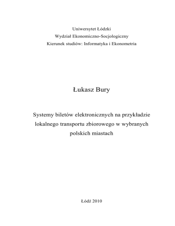 Uniwersytet Łódzki Wydział Ekonomiczno-Socjologiczny Kierunek studiów: Informatyka i Ekonometria Łukasz Bury Systemy biletów elektronicznych na przykładzie lokalnego transportu zbiorowego w wybranych polskich miastach Łódź 2010 Wstęp ................................................................................................................................ 3 1. Krótka historia systemów biletowych ........................................................................ 5 2. Bilety magnetyczne – Warszawski system biletów magnetycznych........................ 7 3. Bilety z wbudowanym mikroprocesorem ................................................................ 10 3.1. Historia i strona techniczna ................................................................ 10 3.2. Jeszcze bilety elektroniczne czy już karty miejskie? ........................ 13 3.3. Legitymacje jako bilety elektroniczne ............................................... 17 3.4. Warszawska Karta Miejska................................................................. 18 3.5. Wady i zalety wdrażania kart elektronicznych .................................. 20 4. Bilety SMS................................................................................................................. 23 4.1. Początki na świecie ............................................................................. 24 4.2. Bilety SMS w Polsce........................................................................... 25 4.2.1. AS Kontakt ...................................................................... 26 4.2.2. System „Płać komórką” .................................................. 27 5. Bilety kupowane przez Internet – moBiLET ........................................................... 29 6. Zalety i wady biletów kupowanych przez telefon ................................................... 31 7. Kierunek rozwoju biletów elektronicznych ............................................................. 34 Bibliografia .................................................................................................................... 39 Netografia....................................................................................................................... 41 2 Wstęp Świat ciągle rozwija się, stale wymyślane są nowe wynalazki, coś się zmienia. Wiele przedmiotów codziennego użytku jest rzeczą tak naturalną, że nie zauważamy, jak wielkie zmiany w nich zachodzą. Przedmiot banalny – bilet. Najbardziej powszechny w formie papierowej, wyraz zawarcia umowy między przewoźnikiem a pasażerem. On także ewoluował na przestrzeni lat i wraz z rozwojem techniki pojawiał się w coraz praktyczniejszych formach. Obecnie coraz częściej mamy do czynienia z biletami elektronicznymi. W Polsce pierwszym miastem, które wprowadziło bilety z paskiem magnetycznym oraz plastikowe karty miejskie była Warszawa – odpowiednio 1 października 2000 i 2001 roku. Od tego czasu, w ciągu niespełna dekady systemy biletowe oparte na nowoczesnych rozwiązaniach zostały wprowadzone w niemal 30 polskich miastach. Jak można podzielić bilety elektroniczne? Czym różnią się od strony technicznej i praktycznej? Dlaczego tak szybko rozpowszechniają się? Jakie niosą ze sobą problemy a jakie udogodnienia? Jakie oszczędności lub dodatkowe koszty generują u przewoźników, którzy zdecydowali się na ich wprowadzenie? Jak wpłynęły na wizerunek firm? Ta praca próbuje odpowiedzieć na te pytania i podsumować opłacalność takich reform na przykładzie polskich miast, które mają już je za sobą. Tematyka pracy jest ściśle związana z zainteresowaniami autora, który prywatnie jest posiadaczem jednej z większych w kraju kolekcji biletów komunikacji miejskiej. W zamyśle istotną grupą jej odbiorców mają być osoby interesujące się tym zagadnieniem. Głównym argumentem w wyborze tego tematu był fakt braku szerszego opracowania tego zagadnienia a także jego aktualność, ponieważ z roku na rok powiększa się grono polskich miast dysponujących „kartami miejskimi”. W pracy zostały omówione wszystkie rodzaje biletów elektronicznych, jakie obecnie występują na świecie w systemach komunikacji miejskiej wraz z krótką historią. Zgodnie z tytułem, skupiłem się na sytuacji w Polsce, opisując działające systemy w wybranych miastach. Starałem się opisać ich wady i zalety w odniesieniu do klasycznych papierowych biletów. Osobny rozdział został poświęcony 3 rozważaniom na temat ich dalszego rozwoju i ewolucji nowoczesnych biletów w Polsce. Informacje wykorzystane w tej pracy pochodzą głównie z materiałów konferencyjnych, artykułów zamieszczanych w fachowej prasie oraz ulotek reklamowych, ponieważ najprawdopodobniej nie istnieje obecnie książka w języku polskim dotycząca tej tematyki. Celem przedstawionej pracy jest uzupełnienie tego braku i uporządkowanie wiedzy na temat różnych systemów działających w Polsce. W związku z tym, że w dziedzinie biletów elektronicznych zmiany zachodzą bardzo szybko, autor postanowił przedstawić sytuację na dzień 1 stycznia 2010 roku. Praca, poza krótkim opisem historii systemów biletowych, ma charakter empiryczny. Składa się na nią 7 części, odpowiednio do rodzajów opisanych biletów elektronicznych (ze względu na przedstawione zagadnienie nie są to typowe rozdziały). 4 1. Krótka historia systemów biletowych Firmy zajmujące się przewozami, jak każde inne firmy świadczące usługi, musiały w jakiś sposób pobierać opłaty. Na samym początku, pasażerowie płacili bezpośrednio pieniędzmi osobom obsługującym pojazdy. Taki system był zwykle stosowany w pierwszej połowie XIX wieku, gdy przedsiębiorstwa omnibusów konnych były stosunkowo niewielkie i właściciel firmy zatrudniał osoby, do których miał pełne zaufanie. W momencie rozrastania się firm przewozowych i potrzeby zatrudnienia „obcego” 