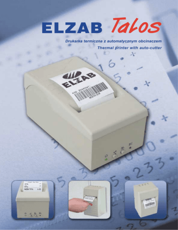Drukarka termiczna z automatycznym obcinaczem Thermal printer with auto-cutter Drukarka termiczna z automatycznym obcinaczem Thermal printer with auto-cutter Drukarka ELZAB Talos to idealne rozwiàzanie dla u˝ytkowników wykonujàcych wydruki potwierdzeƒ, pokwitowaƒ i autoryzacji, bonów, dowodów operacji, tekstów informacyjnych, rozliczeƒ i podsumowaƒ. Wspó∏pracuje z komputerem poprzez interfejs RS232 lub LPT. Wyposa˝ona jest w wytrzyma∏y i niezawodny mechanizm drukujàcy firmy Citizen. ELZAB Talos printer is an ideal solution for users performing the printouts of receipts, confirmations and authorisations, vouchers, coupons, information texts, settlements and summaries. Interface standards RS232 or LPT make it perfect for use with PC systems. It is equipped with durable and reliable Citizen printing mechanism. Najpopularniejsze miejsca zastosowania drukarki to kantory, stanowiska kasowe, hurtownie, laboratoria, banki, gastronomia, firmy kurierskie. S∏u˝yç mo˝e tak˝e do druku biletów wst´pu do kin, muzeów, teatrów lub na imprezy sportowe. The most common printer applications are exchange offices, retail and warehouse trade, laboratories, banks, hospitality and delivery services. It can be also applied for printouts of cinema, theatre and museum tickets or for sport events. Podstawowe atuty drukarki: – wydruki tekstów o ró˝nej wysokoÊci liter i liczbie znaków w linii, wydruki grafiki (on-line lub z pami´ci wewn´trznej), drukowanie kodów kreskowych, – automatyczne obcinanie papieru (pe∏ne lub cz´Êciowe – do odrywania), – du˝y pojemnik na papier – rolki o d∏ugoÊci 60 m, automatyczne zaciàganie papieru podczas zak∏adania nowej rolki, – praca w pozycji poziomej lub pionowej, mo˝liwoÊç zamocowania na Êcianie, – zasilanie i dane przesy∏ane jednym kablem, – przy po∏àczeniu RS232 maksymalna odleg∏oÊç od komputera do 100 m. The basic advantages of printer: – printouts of texts with different letters height and different number of characters per line, graphic printouts (on-line or from the internal memory), bar codes printing , – automatic cutting the paper (full or partial), – big paper container – rolls 60 m length, special construction make the paper loading much easier, – work in horizontal or vertical position, possibility of wall mounting, – power supply and data transmission realised by means of one cable, – when there is RS232 connection maximum distance from the computer is to 100 m. Istnieje mo˝liwoÊç rozwijania wersji specjalistycznych wed∏ug potrzeb konkretnych grup odbiorców. It is possibility of developing the specialistic versions after requirements of given groups of customers. DANE TECHNICZNE TECHNICAL DATA Wymiary: • g∏´bokoÊç: 161 mm • szerokoÊç: 95,4 mm • wysokoÊç: 84 mm Mechanizm producent: Citizen drukujàcy: technologia wydruku: termiczna Dane wydruków: • liczba znaków w linii 40 lub 20 • wysokoÊç znaków 3 mm lub ca∏kowita wielokrotnoÊç • zestaw znaków LATIN2 (mo˝liwoÊç wymiany na inny za pomocà komputera) • pr´dkoÊç wydruku tekstu do 22 wierszy na sekund´ • drukowanie kodów kreskowych • mo˝liwoÊç wydruku grafiki w rozdzielczoÊciach 200 dpi, 100 dpi, lub 50 dpi Materia∏y • szerokoÊç papieru termicznego eksploatacyjne: 57+1/-0 mm • d∏ugoÊç papieru termicznego (rolka) 60 m Obcinacz papieru: firmy Citizen, mo˝liwoÊç pe∏nego lub cz´Êciowego obci´cia papieru Pozycja pracy: pozioma lub pionowa Bufor dokumentu: 3,5 kB, mo˝liwoÊç rozbudowy do 64 kB Pami´ç grafiki: 64 kB Gniazda: RS232 (9,6 do 38,4 kB/sek., odleg∏oÊç od komputera do 100 m) lub LPT Zasilanie: 24 V (zewn´trzny zasilacz w komplecie) Kod wyrobu: 00130 – wersja ELZAB Talos RS (z kablem RS232) 00131 – wersja ELZAB Talos LPT (z kablem do LPT) Nasz dealer: Dimensions: • depth: 161 mm • width: 95,4 mm • height: 84 mm Printing producer: Citizen mechanism: technology of printout: thermal Printouts data: • number of characters per line 40 or 20 • height of characters 3 mm or multiple • set of characters LATIN2 (possibility of change by means of computer) • printing speed of text to 22 rows per second • printing the bar codes • possible resolutions of graphic printouts 200 dpi, 100 dpi or 50 dpi Operational • width of thermal paper 57+1/-0mm materials: • length of thermal paper (roll) 60 m Paper cutter: Citizen, possibility of full or partial paper cutting Work position: horizontal or vertical, possibility of wall mounting Data buffer: 3,5 kB, possibility of extension to 64 kB Memory of graphic: 64 kB Interface: RS232 (9,6 to 38,4 kB/sec., distance from PC to 100 m) or LPT Power supply: 24 V (external power supply) Order No.: 00130 – ELZAB Talos RS version (with RS232 cable) 00131 – ELZAB Talos LPT version (with LPT cable)