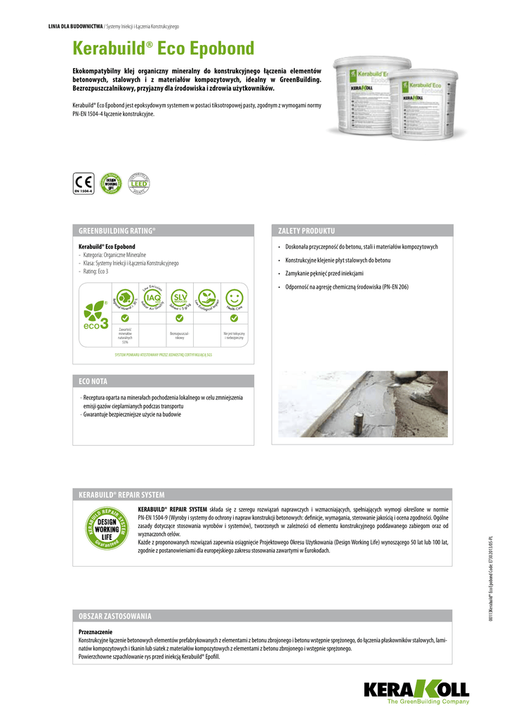 LINIA DLA BUDOWNICTWA / Systemy Iniekcji i Łączenia Konstrukcyjnego Kerabuild® Eco Epobond Ekokompatybilny klej organiczny mineralny do konstrukcyjnego łączenia elementów betonowych, stalowych i z materiałów kompozytowych, idealny w GreenBuilding. Bezrozpuszczalnikowy, przyjazny dla środowiska i zdrowia użytkowników. Kerabuild® Eco Epobond jest epoksydowym systemem w postaci tiksotropowej pasty, zgodnym z wymogami normy PN-EN 1504-4 łączenie konstrukcyjne. u ar a n te e NT R I BUTES STEM KERABU SY EN 1504-4 CO I REPAIR TO LD DESIGN WORKING LIFE G d PO INTS Zalety Produktu Kerabuild® Eco Epobond -- Kategoria: Organiczne Mineralne -- Klasa: Systemy Iniekcji i Łączenia Konstrukcyjnego -- Rating: Eco 3 • Doskonała przyczepność do betonu, stali i materiałów kompozytowych Zawartość minerałów naturalnych 53% ol / t≤5g Ec ct REDUCED ven pa r Air Qua kg y VOC lit % 30 • Odporność na agresję chemiczną środowiska (PN-EN 206) SLV Low oo • Zamykanie pęknięć przed iniekcjami Emissio IAQ S io 3 l M i n e r al ≥ Ind Reg na ow • Konstrukcyjne klejenie płyt stalowych do betonu n L GreenBuilding Rating® ological Im Bezrozpuszczalnikowy He alth Care Nie jest toksyczny i niebezpieczny SYSTEM POMIARU ATESTOWANY PRZEZ JEDNOSTKĘ CERTYFIKUJĄCĄ SGS ECO NOTA -- Receptura oparta na minerałach pochodzenia lokalnego w celu zmniejszenia emisji gazów cieplarnianych podczas transportu -- Gwarantuje bezpieczniejsze użycie na budowie REPAIR I LD u ar a n te e d STEM KERABU SY DESIGN WORKING LIFE G KERABUILD® REPAIR SYSTEM składa się z szeregu rozwiązań naprawczych i wzmacniających, spełniających wymogi określone w normie PN-EN 1504-9 (Wyroby i systemy do ochrony i napraw konstrukcji betonowych: definicje, wymagania, sterowanie jakością i ocena zgodności. Ogólne zasady dotyczące stosowania wyrobów i systemów), tworzonych w zależności od elementu konstrukcyjnego poddawanego zabiegom oraz od wyznaczonch celów. Każde z proponowanych rozwiązań zapewnia osiągnięcie Projektowego Okresu Użytkowania (Design Working Life) wynoszącego 50 lat lub 100 lat, zgodnie z postanowieniami dla europejskiego zakresu stosowania zawartymi w Eurokodach. Obszar zastosowania Przeznaczenie Konstrukcyjne łączenie betonowych elementów prefabrykowanych z elementami z betonu zbrojonego i betonu wstępnie sprężonego, do łączenia płaskowników stalowych, laminatów kompozytowych i tkanin lub siatek z materiałów kompozytowych z elementami z betonu zbrojonego i wstępnie sprężonego. Powierzchowne szpachlowanie rys przed iniekcją Kerabuild® Epofill. 00113Kerabuild® Eco Epobond Code: E730 2013/05-PL Kerabuild® Repair System Technologia użycia Sposób użycia Kerabuild® Eco Epobond przygotowuje się poprzez wymieszanie ręczne lub przy użyciu niskoobrotowego mieszadła mechanicznego, składnika A ze składnikiem B (proporcje przygotowane w opakowaniach 1:1) aż do momentu uzyskania miękkiej pasty o jednolitym kolorze. Ilość wyrabianej masy oraz temperatura otoczenia i podłoża mogą zmieniać czas urabialności: przy wysokich temperaturach lub dużych ilościach wyrabianego produktu czas urabialności ulega skróceniu. Nanoszenie Przed nałożeniem Kerabuild® Eco Epobond należy uzyskać odpowiednią szorstkość oraz oczyścić powierzchnię betonu przy użyciu szczotki albo, co jest zalecane, piaskowania, usuwając wszelkie pozostałości pyłów, tłuszczy, olejów oraz inne zanieczyszczenia, aż do uzyskania czystej i spójnej powierzchni. Powierzchnie metalowe, po usunięciu rdzy, olejów i lakierów, oczyścić ręcznie do stopnia St2 lub mechanicznie (piaskowanie) do stopnia Sa2, zgodnie z normą ISO 8501-1. Kerabuild® Eco Epobond nakłada się szpachelką. zaleca się nałożenie Kerabuild® Eco Epobond na obydwie łączone powierzchnie, zwracając szczególną uwagę na dokładne rozprowadzenie produktu na obszarach podłoża o zwiększonej nierówności. W celu spojenia spękanych konstrukcji poprzez iniekcje pod ciśnieniem Kerabuild® Epofill, po wykonaniu otworów do iniekcji i poszerzeniu szczeliny, usunąć pył i przystąpić do wypełnienia rysy masą Kerabuild® Eco Epobond, wprowadzając jednocześnie przewody iniekcyjne do wcześniej przygotowanych otworów. Czyszczenie Resztki Kerabuild® Eco Epobond usuwać z narzędzi rozpuszczalnikiem (alkohol etylowy, toluen, ksylen) przed stwardnieniem systemu. Wzór informacji technicznej dla projektantów Strukturalne łączenie powierzchni beton/beton, beton/stal, beton materiały kompozytowe, wykonywać z użyciem dwuskładnikowego, organicznego mineralnego ekokompatybilnego systemu w postaci pasty, do strukturalnego łączenia elementów betonowych, płyt stalowych i materiałów kompozytowych, nakłądanego szpachelką, posiadającego oznaczenie CE, GreenBuilding Rating® Eco 3 oraz spełniającego wymogi przewidziane przez normę EN 1504-4, typu Kerabuild® Eco Epobond produkcji Kerakoll. Wygląd Gęstość Przechowywanie Uwagi Opakowanie Proporcja mieszania Lepkość mieszanki Ciężar właściwy mieszanki Czas gotowości do pracy (1 kg): - od +5 °C - od +21 °C - od +30 °C Temperatura użycia Wydajność składnik A szara pasta, składnik B beżowa pasta część A 1650 kg/m3 – Składnik B 1720 kg/m3 ≈ 12 miesięcy w oryginalnym opakowaniu chronić przed mrozem, bezpośrednim działaniem promieni słonecznych i źródłami ciepła składnik A wiadro 1 kg, składnik B wiadro 1 kg składnik A : składnik B = 1 : 1 ≈ 1000000 mPas (wirnik 95 RPM 2,5) metoda Brookfielda ≈ 1700 kg/m3 ≥ 100 min ≥ 20 min ≥ 15 min od +5 °C do +30 °C ≈ 1,7 kg/m2 na mm warstwy Dane uzyskane w temp. +23 °C, przy wilgotności względnej 50% i przy braku wentylacji. Mogą ulegać zmianie w zależności od warunków panujących na budowie. 00113Kerabuild® Eco Epobond Code: E730 2013/05-PL Dane techniczne wg Normy Jakości Kerakoll DANE TECHNICZNE HIGH-Tech Właściwość Metoda badawcza wytrzymało