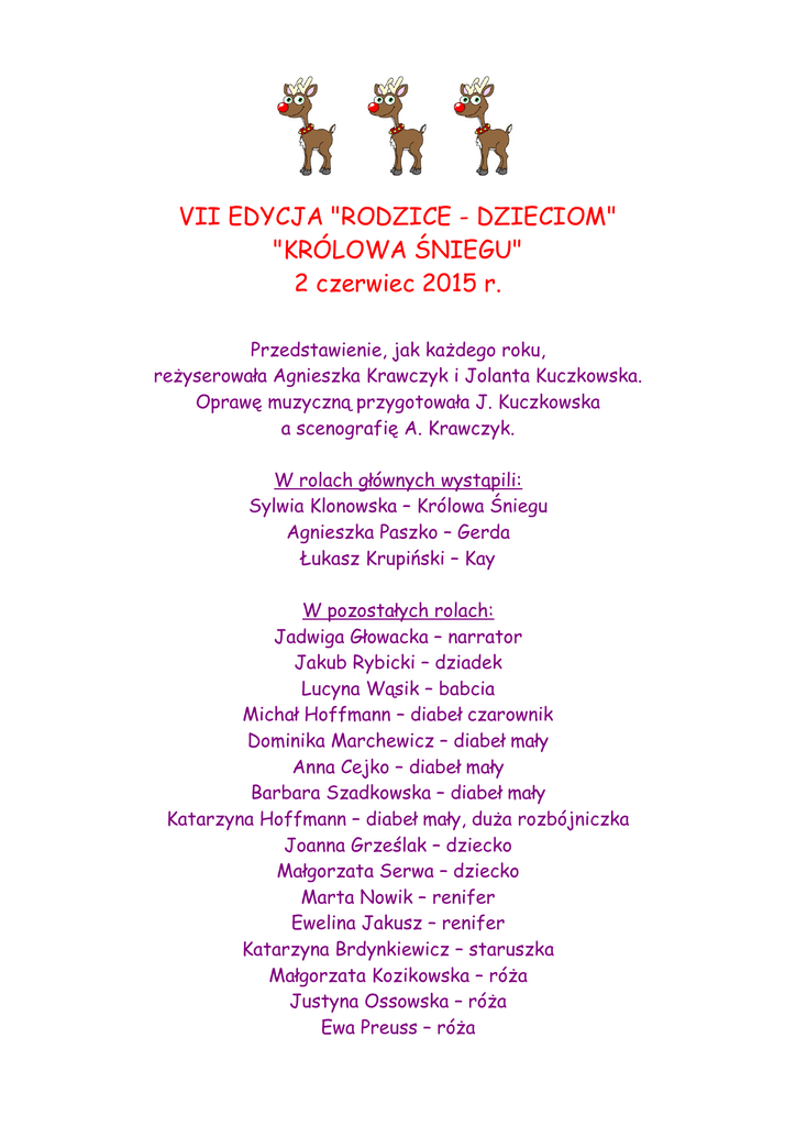 VII EDYCJA "RODZICE - DZIECIOM" "KRÓLOWA ŚNIEGU" 2 czerwiec 2015 r. Przedstawienie, jak każdego roku, reżyserowała Agnieszka Krawczyk i Jolanta Kuczkowska. Oprawę muzyczną przygotowała J. Kuczkowska a scenografię A. Krawczyk. W rolach głównych wystąpili: Sylwia Klonowska – Królowa Śniegu Agnieszka Paszko – Gerda Łukasz Krupiński – Kay W pozostałych rolach: Jadwiga Głowacka – narrator Jakub Rybicki – dziadek Lucyna Wąsik – babcia Michał Hoffmann – diabeł czarownik Dominika Marchewicz – diabeł mały Anna Cejko – diabeł mały Barbara Szadkowska – diabeł mały Katarzyna Hoffmann – diabeł mały, duża rozbójniczka Joanna Grześlak – dziecko Małgorzata Serwa – dziecko Marta Nowik – renifer Ewelina Jakusz – renifer Katarzyna Brdynkiewicz – staruszka Małgorzata Kozikowska – róża Justyna Ossowska – róża Ewa Preuss – róża Katarzyna Czapska – kaczeniec Barbara Sołyga – Kowalska – kaczeniec Katarzyna Hetmańska – hiacynt Rafał Bielawa – wrona, rozbójnik Anna Ratkowska – księżniczka Mariusz Gwardyś – książę Aleksandra Laskowska – gołąb Aleksandra Bielawa – gołąb Marlena Piotrowska – gołąb Ewa Włodarska – mała rozbójniczka Marcin Nowik – rozbójnik Jarosław Wąsik – rozbójnik Zobaczenie miny dziecka, które właśnie ujrzało swoją mamę lub tatę (albo oboje rodziców) na deskach teatru w przedszkolu – BEZCENNE! Liczymy na to, że po premierze posypią się propozycje znanych reżyserów Hollywoodu… Życzymy aktorskiej kariery wszystkim Rodzicom – Aktorom. Wszystkich zainteresowanych sprawieniem ogromnej radości swoim pociechom na Dzień Dziecka zapraszamy na casting, który odbędzie się już za rok.