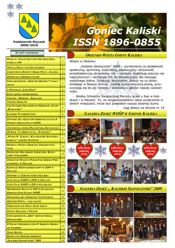Goniec Kaliski ISSN 1896-0855 Październik-Styczeń 2009/2010 W tym numerze: OKIENKO WÓJTA GMINY KALISKA WIARA W SUKCES KLUCZEM DO JEGO OSIĄGNIĘCIA X/09 2 TRWAJĄ PRACE NAD SZTANDAREM 2 ZAKOŃCZONO REMONT DROGI PIECE - KALISKA 3 SPOTKANIA Z KOMBATANTAMI 3 STOWARZYSZENIE „DZIECKO MIŁOŚCI” W KALISKACH 3 X WERNISAŻ „SAMI SWOI” 4 KURS JĘZYKA NIEMIECKIEGO 5 CHCEMY - MOŻEMY - DZIAŁAMY TURNIEJ SOŁECTW JAK SENIORZY REALIZOWALI PROGRAM „STARY -RUSZAJ SIĘ” 5 KALISKIE WANDROWCZYKI 6 ŻYWNOŚĆ DLA KLIENTÓW KORZYSTAJACYCH Z POMOCY SPOŁECZNEJ W GOPS 7 21LISTOPADA DNIEM PRACOWNIKA SOCJALNEGO 7 III RAJD NA ORIENTACJĘ „ WYGONIEC” 8 „WIARA W SUKCES - KLUCZEM DO JEGO OSIĄGNIĘCIA” - KONIEC II EDYCJI 9 WSPÓLNA WIGILIA ŚWIETLIC TERAPEUTYCZNYCH 5 6 Witam w Okienku „Kaliskie Słoneczniki” 2009 – wyróżnienia za działalność społeczną, sportową, kulturalną, edukacyjną i aktywność przedsiębiorczą za miniony rok – rozdane. Gratuluję jeszcze raz nagrodzonym i zachęcam Ich do dalszej pracy dla naszego wspólnego dobra. Dziękuję Wszystkim, którzy na co dzień, działając w Naszej Gminie zwykłą systematyczną pracą, przyczyniają się do jej rozwoju i stanowią o jakości naszej codzienności. Wielka Orkiestra Świątecznej Pomocy grała u Nas w Kaliskach i w Piecach. To, że zorganizowaliśmy takie wydarzenie w dwóch miejscach, może być powodem naszej lokalnej dumy. ciąg dalszy na stronie nr 19 GALERIA ZDJĘĆ WOŚP W GMINIE KALISKA 10 SPOTKANIE OPŁATKOWE EMERYTÓW, RENCISTÓW I INWALIDÓW 10 JUBILEUSZ 50-LECIA PUBLICZNEJ SZKOŁY PODSTAWOWEJ W PIECACH 10 KIERMASZ BOŻONARODZENIOWY W ZOW W PIECACH 12 POMNIKI NA TERENIE GMINY KALISKA 12 XVIII FINAŁ WOŚP W ZOW W PIECACH 14 XVIII FINAŁ WOŚP W ZSP W KALISKACH 15 MISTRZOWIE ŚWIATA W ZSP W KALISKACH PODCZAS XVIII FINAŁU WOŚP 18 SPRAWOZDANIE Z DYSKUSJI NAD STUDIUM 18 OKIENKO WÓJTA - CIĄG DALSZY 19 PODSUMOWANIE PRACY RADY GMINY 20 WIEŚCI SOŁECKIE Z PIECÓW 21 STOWARZYSZENIE „BÓR”- KOŃCZY SWOJĄ DZIAŁALNOŚĆ 22 W BANKU SPÓŁDZIELCZYM W SKÓRCZU ROZDANO NAGRODY 23 TRASY KONNE BEZPŁATNE DOWODY OSOBISTE 24 24 „KALISKIE SŁONECZNIKI” 2009 24 GALERIA ZDJĘĆ „ KALISKIE SŁONECZNIKI” 2009 Str. 2 Goniec Kaliski Październik-Styczeń WIARA W SUKCES KLUCZEM DO JEGO OSIĄGNIĘCIA –X/09 Działania środowiskowe w ramach projektu "Wiara w sukces- kluczem do jego osiągnięcia" - X/2009 Projekt "Wiara w sukces- kluczem do jego osiągnięcia" realizowany jest w okresie od 01.07.2009 do 31.12.2009. Jest to druga edycja projektu współfinansowanego przez Europejski Fundusz Społeczny , w ramach Priorytetu VII- Promocja integracji społecznej, Działania 7.1- Rozwój i upowszechnianie aktywnej integracji , Poddziałania 7.1.1 - Rozwój i upowszechnianie aktywnej integracji przez ośrodki pomocy społecznej. W ramach działań o charakterze środowiskowym bezrobotne Panie z projektu zdecydowały się w dniu 24 października 2009 r. na prezentację swoich osiągnięć na lokalnej, jubileuszowej ( bo 10-tej), gminnej wystawie pn. "Sami swoi". Impreza odbywała się w Domu Kultury w Kaliskach. We współpracy z prowadzącymi zajęcia Panią Marzeną Usarek oraz Panią Marią Kaszubowską Panie przygotowały stoisko przedstawiające nasz projekt. Same przez kilka dni robiły przepyszne ciasta oraz dania "na gorąco". Opowiadając o realizowanych w trakcie projektu zadaniach częstowały uczestników wystawy swoimi potrawami. Stoisko cieszyło się wielkim zainteresowaniem i uznaniem. Ponadto z inicjatywy Pani Zofii Haftka - prowadzącej w ramach projektu warsztaty pedagogiczne 6 Pań z projektu wzięło udział w jego inscenizacji. Pani Zofia Haftka przygotowała na tę okoliczność scenariusz oraz uszyła stroje. Zajęła się również organizacją prób i przygotowaniem Pań do występu. Mimo ogromnej tremy wszystko udało się na "piątkę z plusem". Wszystkim osobom zaangażowanym w realizację tego przedsięwzięcia bardzo dziękuję!!! B. Wysokińska TRWAJĄ PRACE NAD SZTANDAREM Opracowano i zatwierdzono przez Radę Gminy Kaliska projekt sztandaru gminnego. Dnia 30.09.2009 r. przesłano projekt sztandaru do Komisji Heraldycznej Ministerstwa Spraw Wewnętrznych i Administracji celem zaopiniowania. Obecnie wniosek oczekuje na opinię Komisji. Dnia 28-10.2009 r. Rada Gminy Kaliska zaopiniowała pozytywnie projekt drzewca sztandaru, który zostanie przesłany do Komisji Heraldycznej w celu wydania opinii. B. Jeleniewska Goniec Kaliski Październik-Styczeń Str. 3 ZAKOŃCZONO REMONT DROGI PIECE - KALISKA Zakończono prace związane z remontem drogi gminnej Nr 209016 Piece – Kaliska. Remont ten polegał na utwardzeniu ww. drogi tłuczniem, a wykonawcą prac był podmiot wyłoniony w drodze przetargu nieograniczonego, tj. "Transport Ciężarowy Małgorzta Ćwiklińska, Wysoka 39, 83-212 Bobowo". Łączny koszt inwestycji wynosi 54.900,53 zł, z czego 75% to środki pochodzące z Funduszu Ochrony Gruntów Rolnych Samorządu Województwa Pomorskiego, a 25% środków stanowią środki własne Gminy Kaliska. T. Sabiniarz SPOTKANIA Z KOMBATANTAMI W dniu 6 października 2009 r. Prezes Związku Solidarności Polskich Kombatantów im. Ks. Henryka Szumana Pan Ryszard Tyborski, Sekretarz związku Pan Marian Nowak oraz Pani Sekretarz Gminy Grażyna Żytkowiak odwiedzili 9 członków kombatantów, którzy ukończyli 80 lat: Pani Felicja Brodka, Kazimiera Kulas, Helena Kołatka, Zofia Morzuch, Helena Lass, Helena Schmidt, Teresa Pelowska, Helena Kromka i Pan Józef Miszewski . W trakcie odwiedzin członkowie otrzymali upominki, rozmawiano o sprawach i potrzebach kombatantów. T. Jagiełło STOWARZYSZENIE „DZIECKO MIŁOŚCI” W KALISKACH Stowarzyszenie Rodziców Wychowujących Dzieci Niepełnosprawne „Dziecko Miłości” w Kaliskach prowadzi swą działalność od marca 1996 r. W minionym roku Stowarzyszenie uzyskało status organizacji pożytku publicznego. Obecnie organizacja zrzesza 28 rodzin wych
