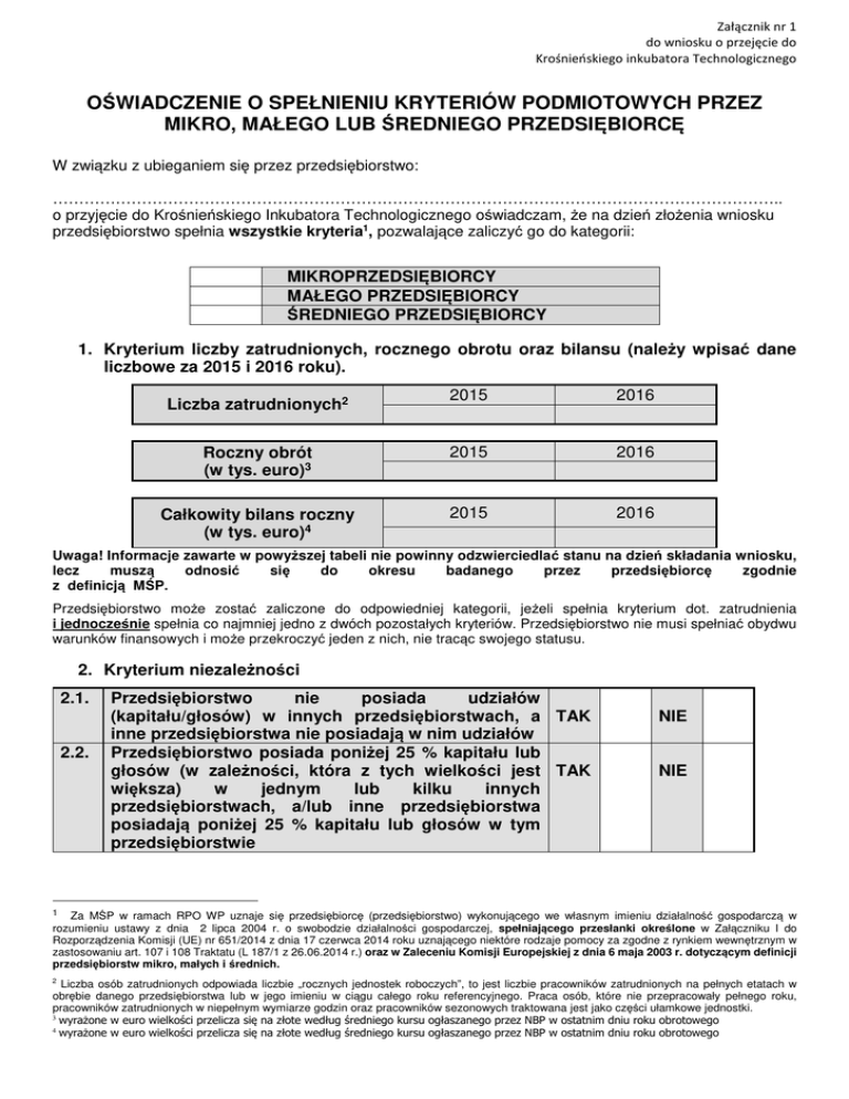 Załącznik nr 1 do wniosku o przejęcie do Krośnieńskiego inkubatora Technologicznego OŚWIADCZENIE O SPEŁNIENIU KRYTERIÓW PODMIOTOWYCH PRZEZ MIKRO, MAŁEGO LUB ŚREDNIEGO PRZEDSIĘBIORCĘ W związku z ubieganiem się przez przedsiębiorstwo: ………………………………………………………………………………………………………………………….. o przyjęcie do Krośnieńskiego Inkubatora Technologicznego oświadczam, że na dzień złożenia wniosku przedsiębiorstwo spełnia wszystkie kryteria1, pozwalające zaliczyć go do kategorii: MIKROPRZEDSIĘBIORCY MAŁEGO PRZEDSIĘBIORCY ŚREDNIEGO PRZEDSIĘBIORCY 1. Kryterium liczby zatrudnionych, rocznego obrotu oraz bilansu (należy wpisać dane liczbowe za 2015 i 2016 roku). Liczba zatrudnionych2 2015 2016 Roczny obrót (w tys. euro)3 2015 2016 Całkowity bilans roczny (w tys. euro)4 2015 2016 Uwaga! Informacje zawarte w powyższej tabeli nie powinny odzwierciedlać stanu na dzień składania wniosku, lecz muszą odnosić się do okresu badanego przez przedsiębiorcę zgodnie z definicją MŚP. Przedsiębiorstwo może zostać zaliczone do odpowiedniej kategorii, jeżeli spełnia kryterium dot. zatrudnienia i jednocześnie spełnia co najmniej jedno z dwóch pozostałych kryteriów. Przedsiębiorstwo nie musi spełniać obydwu warunków finansowych i może przekroczyć jeden z nich, nie tracąc swojego statusu. 2. Kryterium niezależności 2.1. 2.2. Przedsiębiorstwo nie posiada udziałów (kapitału/głosów) w innych przedsiębiorstwach, a TAK inne przedsiębiorstwa nie posiadają w nim udziałów Przedsiębiorstwo posiada poniżej 25 % kapitału lub głosów (w zależności, która z tych wielkości jest TAK większa) w jednym lub kilku innych przedsiębiorstwach, a/lub inne przedsiębiorstwa posiadają poniżej 25 % kapitału lub głosów w tym przedsiębiorstwie NIE NIE 1 Za MŚP w ramach RPO WP uznaje się przedsiębiorcę (przedsiębiorstwo) wykonującego we własnym imieniu działalność gospodarczą w rozumieniu ustawy z dnia 2 lipca 2004 r. o swobodzie działalności gospodarczej, spełniającego przesłanki określone w Załączniku I do Rozporządzenia Komisji (UE) nr 651/2014 z dnia 17 czerwca 2014 roku uznającego niektóre rodzaje pomocy za zgodne z rynkiem wewnętrznym w zastosowaniu art. 107 i 108 Traktatu (L 187/1 z 26.06.2014 r.) oraz w Zaleceniu Komisji Europejskiej z dnia 6 maja 2003 r. dotyczącym definicji przedsiębiorstw mikro, małych i średnich. 2 Liczba osób zatrudnionych odpowiada liczbie „rocznych jednostek roboczych”, to jest liczbie pracowników zatrudnionych na pełnych etatach w obrębie danego przedsiębiorstwa lub w jego imieniu w ciągu całego roku referencyjnego. Praca osób, które nie przepracowały pełnego roku, pracowników zatrudnionych w niepełnym wymiarze godzin oraz pracowników sezonowych traktowana jest jako części ułamkowe jednostki. 3 wyrażone w euro wielkości przelicza się na złote według średniego kursu ogłaszanego przez NBP w ostatnim dniu roku obrotowego 4 wyrażone w euro wielkości przelicza się na złote według średniego kursu ogłaszanego przez NBP w ostatnim dniu roku obrotowego 2.3. 2.4. Czy następujące podmioty: TAK NIE − publiczne korporacje inwestycyjne, firmy venture capital, osoby indywidualne lub grupy osób indywidualnych prowadzących regularną działalność w zakresie inwestycji venture capital, którzy inwestują kapitał udziałowy w firmy nie notowane na giełdzie („anioły biznesu”) pod warunkiem, że łączna wysokość inwestycji tych inwestorów w to samo przedsiębiorstwo wynosi mniej niż 1 250 000 EUR, − uniwersytety lub niedochodowe ośrodki badawcze, − inwestorzy instytucjonalni łącznie z regionalnymi funduszami rozwoju, − samorządy lokalne z rocznym budżetem nie przekraczającym 10 milionów EUR oraz liczbą mieszkańców poniżej 5 000, posiadają więcej niż 25 % lecz nie więcej niż 50 % udziałów w przedsiębiorstwie i podmioty te nie są ze sobą związane Udział podmiotów publicznych Czy 25 % lub więcej kapitału lub głosów przedsiębiorstwa jest kontrolowane bezpośrednio TAK lub pośrednio, łącznie lub indywidualnie, przez jeden lub kilka podmiotów publicznych (nie dotyczy podmiotów wymienionych w podkryterium 2.3.). NIE UWAGA! 1. Uwaga! W przypadku zaznaczenia odp. „TAK” w podkryterium 2.1. – przedsiębiorstwo jest niezależne od innych przedsiębiorstw i nie ma konieczności przeprowadzenia analizy w punktach 2.5. i 2.6. 2. W przypadku zaznaczania odpowiedzi „TAK” w podkryterium 2.4. przedsiębiorstwo nie może być uznane za MŚP Punkty 2.5. i 2.6. należy wypełnić w przypadku zaznaczenia odpowiedzi „NIE” w podkryterium 2.1. 2.5. 2.6. Przedsiębiorstwa partnerskie Czy przedsiębiorstwo posiada 25 - 50 % kapitału lub głosów w jednym lub kilku innych TAK NIE przedsiębiorstwach (za wyjątkiem podmiotów wymienionych w kryterium 2.3.), a/lub inne przedsiębiorstwa posiadają 25-50 % kapitału lub głosów w tym przedsiębiorstwie. W przypadku stwierdzenia, iż analizowane przedsiębiorstwo jest przedsiębiorstwem partnerskim, w celu zweryfikowania progów określonych w Kryterium 1, do własnych danych dot. zatrudnienia, obrotów i bilansu należy dodać dane wszystkich przedsiębiorstw partnerskich w procencie odpowiadającym rzeczywistemu udziałowi. Dla ułatwienia, w obliczeniach uwzględnić należy wyłącznie dane przedsiębiorstwa partnerskiego znajdującego się bezpośrednio na poziomie w stosunku do analizowanego przedsiębiorstwa. Przedsiębiorstwa związane Czy przedsiębiorstwo posiada ponad 50 % głosów udziałowców lub wspólników w innym TAK NIE przedsiębiorstwie, a/lub inne przedsiębiorstwo posiada ponad 50 % głosów w analizowanym przedsiębiorstwie. W przypadku stwierdzenia, iż analizowane przedsiębiorstwo jest przedsiębiorstwem związanym, w celu zweryfikowania progów określonych w Kryterium 1, do własnych d