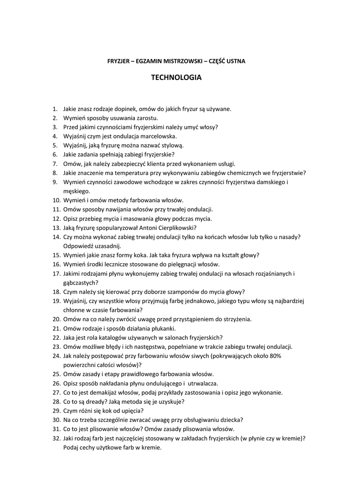 FRYZJER – EGZAMIN MISTRZOWSKI – CZĘŚĆ USTNA TECHNOLOGIA 1. 2. 3. 4. 5. 6. 7. 8. 9. 10. 11. 12. 13. 14. 15. 16. 17. 18. 19. 20. 21. 22. 23. 24. 25. 26. 27. 28. 29. 30. 31. 32. Jakie znasz rodzaje dopinek, omów do jakich fryzur są używane. Wymień sposoby usuwania zarostu. Przed jakimi czynnościami fryzjerskimi należy umyć włosy? Wyjaśnij czym jest ondulacja marcelowska. Wyjaśnij, jaką fryzurę można nazwać stylową. Jakie zadania spełniają zabiegi fryzjerskie? Omów, jak należy zabezpieczyć klienta przed wykonaniem usługi. Jakie znaczenie ma temperatura przy wykonywaniu zabiegów chemicznych we fryzjerstwie? Wymień czynności zawodowe wchodzące w zakres czynności fryzjerstwa damskiego i męskiego. Wymień i omów metody farbowania włosów. Omów sposoby nawijania włosów przy trwałej ondulacji. Opisz przebieg mycia i masowania głowy podczas mycia. Jaką fryzurę spopularyzował Antoni Cierplikowski? Czy można wykonać zabieg trwałej ondulacji tylko na końcach włosów lub tylko u nasady? Odpowiedź uzasadnij. Wymień jakie znasz formy koka. Jak taka fryzura wpływa na kształt głowy? Wymień środki lecznicze stosowane do pielęgnacji włosów. Jakimi rodzajami płynu wykonujemy zabieg trwałej ondulacji na włosach rozjaśnianych i gąbczastych? Czym należy się kierować przy doborze szamponów do mycia głowy? Wyjaśnij, czy wszystkie włosy przyjmują farbę jednakowo, jakiego typu włosy są najbardziej chłonne w czasie farbowania? Omów na co należy zwrócić uwagę przed przystąpieniem do strzyżenia. Omów rodzaje i sposób działania płukanki. Jaka jest rola katalogów używanych w salonach fryzjerskich? Omów możliwe błędy i ich następstwa, popełniane w trakcie zabiegu trwałej ondulacji. Jak należy postępować przy farbowaniu włosów siwych (pokrywających około 80% powierzchni całości włosów)? Omów zasady i etapy prawidłowego farbowania włosów. Opisz sposób nakładania płynu ondulującego i utrwalacza. Co to jest demakijaż włosów, podaj przykłady zastosowania i opisz jego wykonanie. Co to są dready? Jaką metoda się je uzyskuje? Czym różni się kok od upięcia? Na co trzeba szczególnie zwracać uwagę przy obsługiwaniu dziecka? Co to jest plisowanie włosów? Omów zasady plisowania włosów. Jaki rodzaj farb jest najczęściej stosowany w zakładach fryzjerskich (w płynie czy w kremie)? Podaj cechy użytkowe farb w kremie. 33. Czy ponad 12% roztwór nadtlenku wodoru jest wskazany przy rozjaśnianiu włosów? Uzasadnij odpowiedź. 34. Jakie znasz sposoby mycia głowy? Podaj środki służące te czynności. 35. Wymień i omów rodzaje uszkodzeń włosa. 36. Wyjaśnij dlaczego włosy zwilżone i nakręcone na wałki, po wyschnięciu zachowują skręt. Czy jest to skręt trwały? 37. Czy choroby skóry pozwalają na przeprowadzenie usługi przez fryzjera? Omów i podaj przykłady. 38. Wymień rodzaje reakcji alergicznych. 39. Omów uszkodzenia chemiczne włosa, wyjaśnij w wyniku czego powstają. 40. Omów technikę klasycznego strzyżenia damskiego „na pazia”. 41. Podaj sposoby wykonania balejażu na włosach. 42. Omów technikę strzyżenia męskiego fryzury „na jeża”. 43. Co to jest podkład rozjaśniający? Jaką mieszankę należy położyć na włosach rozjaśnionych aby otrzymać kolor ciemny brąz (poziom 3), podaj przykład? 44. Wyjaśnij, jakie błędy zostały popełnione jeżeli włosy po rozjaśnieniu wykazują odcień czerwony. 45. Jakie techniki można zastosować w pracy z długimi włosami (przy kokach, upięciach)? 46. Omów różnice między stylizacją trwałą a nietrwałą. Wymień produkty wykorzystywane podczas tworzenia linii nietrwałych. 47. Wymień i omów zawody związane z fryzjerstwem, które służą tworzeniu wizerunku człowieka. 48. Jaką czynność wykonuje fryzjer na zakończenie strzyżenia plastycznego? 49. W jaki sposób można usunąć z włosów odcień zielony? FRYZJER – EGZAMIN MISTRZOWSKI – CZĘŚĆ USTNA MASZYNOZNAWSTWO 1. 2. 3. 4. 5. 6. 7. 8. 9. 10. 11. 12. Omów budowę grzebienia do strzyżenia męskiego i cieniowania. Wymień szczotki używane w zakładzie fryzjerskim. Z jakich materiałów są produkowane? Wyjaśnij co to są klipsy i do czego są wykorzystywane we fryzjerstwie. Wymień aparaty stosowane do zabiegów fryzjerskich. Jakie znasz rodzaje nożyczek fryzjerskich? Wymień, jakie znasz rodzaje maszynek elektrycznych (do strzyżenia), omów ich przeznaczenie. Wyjaśnij, jakie mogą być skutki korzystania z uszkodzonego sprzętu fryzjerskiego. Jakie czynniki mogą spowodować nieprawidłowości w działaniu instalacji elektrycznej? Omów czym jest główka fryzjerska i do czego służy. Omów proces mycia główki fryzjerskiej. Wyjaśnij w jakim celu stosuje się uziemienie instalacji elektrycznej w zakładzie fryzjerskim. Wyjaśnij do czego możemy zastosować komputer w zakładzie fryzjerskim? 13. Podaj jakie narzędzia i przybory są potrzebne do wykonania fryzury klasycznej (damskiej i męskiej). 14. Wskaż czym różnią się wałki do trwałej ondulacji od wałków do ondulacji wodnej. 15. Jakie urządzenia sanitarne powinny znajdować się w zakładzie fryzjerskim? 16. Wyjaśnij, dlaczego nie należy wkładać ostrych narzędzi do kieszeni fartucha? 17. Opisz jak wygląda i do czego służy dyfuzor. 18. Wymień narzędzia i przybory potrzebne do wykonania farbowania. 19. Jakie narzędzia i przybory są potrzebne do wykonania zabiegu trwałej ondulacji? 20. Scharakteryzuj budowę brzytwy, omów jakie było jej znaczenie. 21. Wymień rodzaje lokówek elektrycznych. 22. Wymień rodzaje ręczników wykorzystywanych w zakładzie fryzjerskim. 23. Wymień narzędzia i przybory używane we fryzjerstwie, wykonane z tworzyw sztucznych. 24. Wymień materiały obecnie używane do produkcji grzebieni fryzjerskich. Jakie cechy grzebienia uważasz za najistotniejsze? 25. Podaj, jak nazywała się fryzura późnego rokoko, do której należy użyć