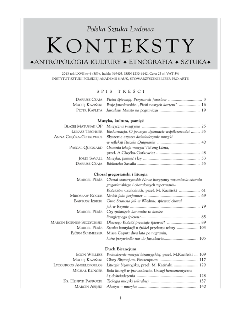 Polska Sztuka Ludowa K o n t e ks t y Fantropologia kultury F etnografia F sztukaF 2013 rok LXVII nr 4 (303). Indeks 369403. ISSN 1230-6142. Cena 25 zł. Vat 5% instytut sztuki polskiej akademii nauk, stowarzyszenie Liber Pro Arte S p i s t r e ś c i Dariusz Czaja Pieśni śpiewają. Przystanek Jarosław ................................ 3 Maciej Kaziński Pasje jarosławskie. „Pieśń naszych korzeni” .................... 16 Piotr Kaplita Jarosław. Miasto na pograniczu . .................................... 19 Muzyka, kultura, pamięć Błażej Matusiak OP Muzyczna świątynia ...................................................... Łukasz Tischner Ekskarnacja. O pewnym dylemacie współczesności . ....... Anna Chęćka-Gotkowicz Słyszenie czyste: doświadczanie muzyki w refleksji Pascala Quignarda ........................................ Pascal Quignard Ostatnia lekcja muzyki Tch’eng Liena, przeł. A.Chęćka-Gotkowicz ........................................ Jordi Savall Muzyka, pamięć i łzy ..................................................... Dariusz Czaja Biblioteka Savalla........................................................... 25 35 40 48 53 55 Chorał gregoriański i liturgia Marcel Pérès Chorał starorzymski: Nowe horyzonty rozumienia chorału gregoriańskiego i chorałowych repertuarów Kościołów wschodnich, przeł. M. Kaziński .................... 61 Mirosław Kocur Mnich jako performer .................................................... 69 Bartosz Izbicki Grać Straussa jak w Wiedniu, śpiewać chorał jak w Rzymie . ............................................................... 79 Marcel Pérès Czy zniknięcie kantorów to koniec liturgicznego śpiewu?....................................................... 85 Marcin Bornus-Szczyciński Dlaczego Kościół przestaje śpiewać? ............................... 89 Marcel Pérès Sztuka kantylacji u źródeł przekazu wiary .................... 103 Björn Schmelzer Missa Caput: dwa lata po nagraniu, które przywiodło nas do Jarosławia................................ 105 Duch Bizancjum Egon Wellesz Pochodzenie muzyki bizantyjskiej, przeł. M.Kaziński .... Maciej Kaziński Głosy Bizancjum. Postscriptum .................................... Lycourgos Angelopoulos Liturgia bizantyjska, przeł. M. Kaziński ...................... Michał Klinger Rola liturgii w prawosławiu. Uwagi hermeneutyczne i z doświadczenia ......................................................... Ks. Henryk Paprocki Teologia muzyki sakralnej ............................................ Marcin Abijski Akatyst – muzyka ....................................................... 1 109 117 120 128 137 140 Panichida i powroty do źródeł. Wywiad z Adrian Sarbu.............................................. 141 Psalmy Dawidowe Dariusz Czaja Głos wcielony. Glossa o Psalmach . ............................. Marcin Bornus-Szczyciński „Bijcie w bębny, w instrumenty grajcie...” . ................... Tomasz Dobrzański Salomone Rossi i psalmy hebrajskie............................... Vladimir Ivanoff Sarband i psalmy muzułmańskie................................... Medium aevum Joanna Benedyktowicz Quasi plaustra per gradus. Hurgot wozu staczającego się po schodach, czyli o śpiewie gregoriańskim u Franków . ..... 151 Benjamin Bagby Sześć strun, pięć palców, jeden głos. Modus i tekst we wczesnośredniowiecznej muzyce .................................. 157 Benjamin Bagby Beowulf, Edda i sztuka wykonawcza epiki średniowiecznej. Notatki z warsztatu rekonstrukcji „Pieśniarza Opowieści”, przeł. M. Sadowska..................................................... 163 Melancholie Dowlanda *** J.D. do School of the Night, przeł. M. Skiba ................ 170 Frank Pschichholz Odczytywanie Second Booke of Songes or Ayres (1600) Johna Dowlanda, przeł. M. Skiba ............................... 174 John Dowland The Second Booke of Songes or Ayres, przeł. M. Skiba ........................................................... 186 Francesco Zimei Antonello Ricci, Roberta Tucci Gianni de Santis Luigi Chiriatti 143 147 149 150 Pasje Południa Planctus z Montecassino: od intonacji do inscenizacji, tłum. A. Dudzińska-Facca ........................................ 198 Drogi pieśni pasyjnych, przeł. A. Dudzińska-Facca ..... 204 Śpiew jako odkupienie, przeł. A. Dudzińska-Facca ..... 206 Pieśni pasyjne: I passiùna tu Cristù i Lu Santu Lazzaru, tłum. A. Dudzińska-Facca . ....................................... 207 Pieśni niewinności, pieśni doświadczenia *** O śpiewie tradycyjnym i pobożności ludowej – rozmowa z Adamem Strugiem................................... Tadeusz Nowak Wniebogłosy. Pieśni dziadowskie .................................. Maria Bikont W poszukiwaniu pieśni tradycyjnej. Moje wyprawy na Ukrainę, do Rosji i na Białoruś ....... Katarzyna Jackowska-Enemuo O pięknym naczyniu i czwartym szaleństwie ................ *** Kozaczyj krug – z zespołem rozmawia Justyna Piernik............................................................. *** Bractwo śpiewacze z Andavías .................................. Marcel Pérès Pigna: grunt do uprawiania żywej muzykologii, przeł. M. Kaziński ...................................................... Piotr Dahlig Dwa spojrzenia na muzykę ludową. Emocje i fakty........ 208 210 213 219 223 227 232 235 Noty o autorach........................................................ 240 Summaries................................................................. 245 Contents..................................................................... 250