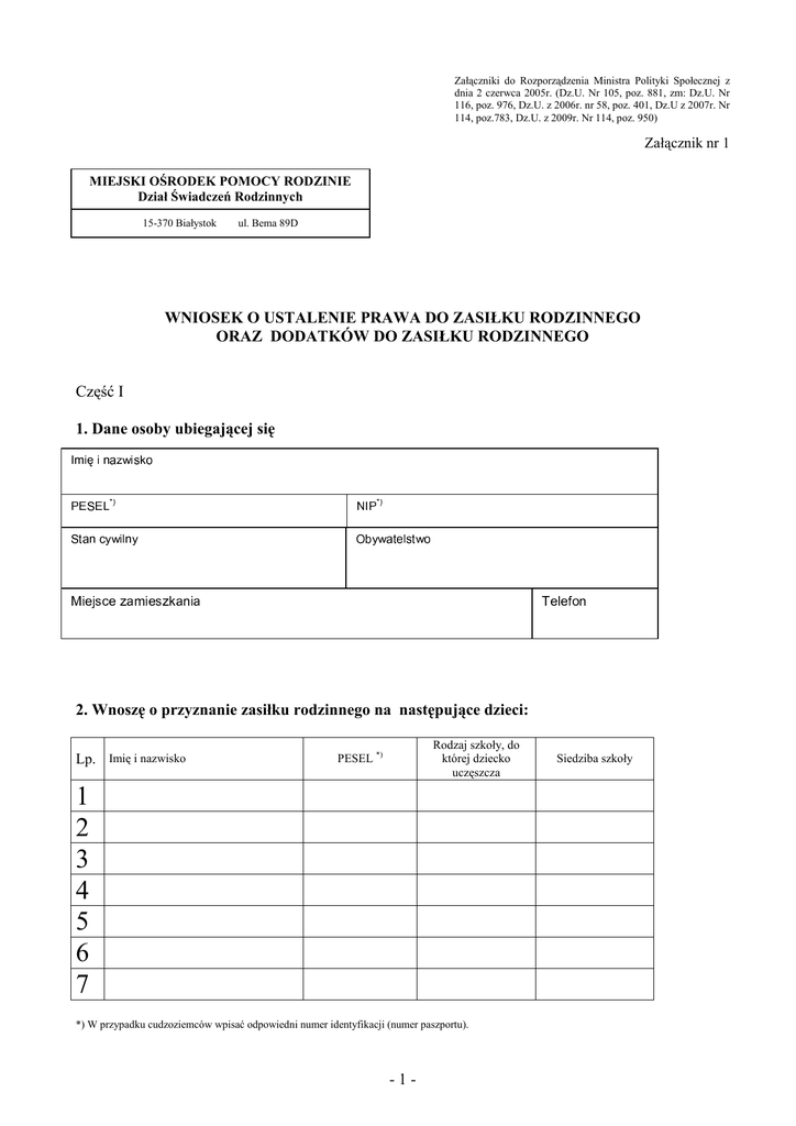 Załączniki do Rozporządzenia Ministra Polityki Społecznej z dnia 2 czerwca 2005r. (Dz.U. Nr 105, poz. 881, zm: Dz.U. Nr 116, poz. 976, Dz.U. z 2006r. nr 58, poz. 401, Dz.U z 2007r. Nr 114, poz.783, Dz.U. z 2009r. Nr 114, poz. 950) Załącznik nr 1 MIEJSKI OŚRODEK POMOCY RODZINIE Dział Świadczeń Rodzinnych 15-370 Białystok ul. Bema 89D WNIOSEK O USTALENIE PRAWA DO ZASIŁKU RODZINNEGO ORAZ DODATKÓW DO ZASIŁKU RODZINNEGO Część I 1. Dane osoby ubiegającej się 1.Dane wnioskodawcy ! " # $ % & ' # 2. Wnoszę o przyznanie zasiłku rodzinnego na następujące dzieci: Lp. Imię i nazwisko Rodzaj szkoły, do której dziecko uczęszcza PESEL *) 1 2 3 4 5 6 7 *) W przypadku cudzoziemców wpisać odpowiedni numer identyfikacji (numer paszportu). -1- Siedziba szkoły oraz dodatków do zasiłku rodzinnego z tytułu: (zakreślić odpowiedni kwadrat i wpisać dane dzieci) urodzenia dziecka ..............................................................., ..................................................................... (imię i nazwisko dziecka) (imię i nazwisko dziecka) opieki nad dzieckiem w okresie korzystania z urlopu wychowawczego (należy wypełnić część II) ..............................................................., ..................................................................... (imię i nazwisko dziecka) (imię i nazwisko dziecka) samotnego wychowywania dziecka (dodatek przysługuje na dwoje dzieci); (należy wypełnić część III) na: ..............................................................., ..................................................................... (imię i nazwisko dziecka) (imię i nazwisko dziecka) wychowywania dziecka w rodzinie wielodzietnej (dodatek przysługuje na trzecie i każde kolejne dziecko uprawnione do zasiłku rodzinnego) na: ..............................................................., ..................................................................... (imię i nazwisko dziecka) (imię i nazwisko dziecka) ..............................................................., ..................................................................... (imię i nazwisko dziecka) (imię i nazwisko dziecka) kształcenia i rehabilitacji dziecka niepełnosprawnego ..............................................................., ..................................................................... (imię i nazwisko dziecka) (imię i nazwisko dziecka) rozpoczęcia roku szkolnego przez: ..............................................................., na rok szkolny .................../......................... (imię i nazwisko dziecka) ..............................................................., na rok szkolny .................../......................... (imię i nazwisko dziecka) ..............................................................., na rok szkolny .................../......................... (imię i nazwisko dziecka) ..............................................................., na rok szkolny .................../......................... (imię i nazwisko dziecka) podjęcia przez dziecko nauki w szkole poza miejscem zamieszkania ( na częściowe pokrycie wydatków związanych z zamieszkaniem w miejscowości, w której znajduje się siedziba szkoły ) na: ..............................................................., ..................................................................... (imię i nazwisko dziecka) (imię i nazwisko dziecka) -2- na rok szkolny*)................/.................oraz rok szkolny**)......................../...................... ..............................................................., ..................................................................... (imię i nazwisko dziecka) (imię i nazwisko dziecka) na rok szkolny*).............../..................oraz rok szkolny**)......................../...................... podjęcia przez dziecko nauki w szkole poza miejscem zamieszkania ( na pokrycie wydatków związanych z zapewnieniem dziecku możliwości dojazdu z miejsca zamieszkania do miejscowości, w której znajduje się siedziba szkoły ) ..............................................................., ..................................................................... (imię i nazwisko dziecka) (imię i nazwisko dziecka) na rok szkolny*)................../...............oraz rok szkolny**)......................../...................... ..............................................................., ...................................................................... (imię i nazwisko dziecka) (imię i nazwisko dziecka) na rok szkolny*)................../................oraz rok szkolny**)......................./...................... *) Wpisać bieżący rok szkolny. **) Wypełnić w przypadku ubiegania sie o dodatek także na kolejny rok szkolny; w pustym miejscu wpisać kolejny rok szkolny. Uwaga: wypełnić oświadczenie w części VI. 3. Dane członków rodziny (w tym dzieci do ukończenia 25 lat, a także dziecka, które ukończyło 25. rok życia, legitymującego się orzeczeniem o znacznym stopniu niepełnosprawności, jeżeli w związku z tą niepełnosprawnością rodzinie przysługuje świadczenie pielęgnacyjne). Do członków rodziny nie zalicza sie dziecka zostającego pod opieka opiekuna prawnego, dziecka pozostającego w związku małżeńskim, a także pełnoletniego dziecka posiadającego własne dziecko. W skład rodziny wchodzą: 1 ..................................................................................................................................... (imię i nazwisko stopień pokrewieństwa PESEL*) urząd skarbowy) 2 ..................................................................................................................................... (imię i nazwisko stopień pokrewieństwa PESEL*) urząd skarbowy) 3 .........................................................................................................................