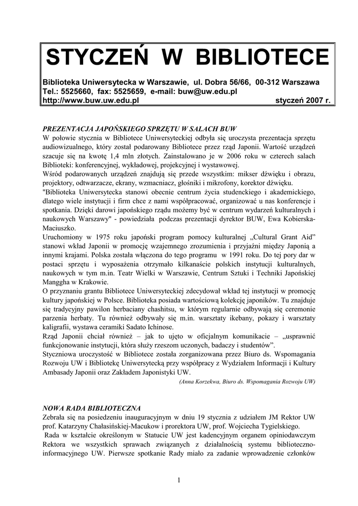 Biblioteka Uniwersytecka w Warszawie, ul. Dobra 56/66, 00-312 Warszawa Tel.: 5525660, fax: 5525659, e-mail: [email protected] http://www.buw.uw.edu.pl styczeń 2007 r. PREZENTACJA JAPOŃSKIEGO SPRZĘTU W SALACH BUW W połowie stycznia w Bibliotece Uniwersyteckiej odbyła się uroczysta prezentacja sprzętu audiowizualnego, który został podarowany Bibliotece przez rząd Japonii. Wartość urządzeń szacuje się na kwotę 1,4 mln złotych. Zainstalowano je w 2006 roku w czterech salach Biblioteki: konferencyjnej, wykładowej, projekcyjnej i wystawowej. Wśród podarowanych urządzeń znajdują się przede wszystkim: mikser dźwięku i obrazu, projektory, odtwarzacze, ekrany, wzmacniacz, głośniki i mikrofony, korektor dźwięku. "Biblioteka Uniwersytecka stanowi obecnie centrum Ŝycia studenckiego i akademickiego, dlatego wiele instytucji i firm chce z nami współpracować, organizować u nas konferencje i spotkania. Dzięki darowi japońskiego rządu moŜemy być w centrum wydarzeń kulturalnych i naukowych Warszawy" - powiedziała podczas prezentacji dyrektor BUW, Ewa KobierskaMaciuszko. Uruchomiony w 1975 roku japoński program pomocy kulturalnej „Cultural Grant Aid” stanowi wkład Japonii w promocję wzajemnego zrozumienia i przyjaźni między Japonią a innymi krajami. Polska została włączona do tego programu w 1991 roku. Do tej pory dar w postaci sprzętu i wyposaŜenia otrzymało kilkanaście polskich instytucji kulturalnych, naukowych w tym m.in. Teatr Wielki w Warszawie, Centrum Sztuki i Techniki Japońskiej Manggha w Krakowie. O przyznaniu grantu Bibliotece Uniwersyteckiej zdecydował wkład tej instytucji w promocję kultury japońskiej w Polsce. Biblioteka posiada wartościową kolekcję japoników. Tu znajduje się tradycyjny pawilon herbaciany chashitsu, w którym regularnie odbywają się ceremonie parzenia herbaty. Tu równieŜ odbywały się m.in. warsztaty ikebany, pokazy i warsztaty kaligrafii, wystawa ceramiki Sadato Ichinose. Rząd Japonii chciał równieŜ – jak to ujęto w oficjalnym komunikacie – „usprawnić funkcjonowanie instytucji, która słuŜy rzeszom uczonych, badaczy i studentów”. Styczniowa uroczystość w Bibliotece została zorganizowana przez Biuro ds. Wspomagania Rozwoju UW i Bibliotekę Uniwersytecką przy współpracy z Wydziałem Informacji i Kultury Ambasady Japonii oraz Zakładem Japonistyki UW. (Anna Korzekwa, Biuro ds. Wspomagania Rozwoju UW) NOWA RADA BIBLIOTECZNA Zebrała się na posiedzeniu inauguracyjnym w dniu 19 stycznia z udziałem JM Rektor UW prof. Katarzyny Chałasińskiej-Macukow i prorektora UW, prof. Wojciecha Tygielskiego. Rada w kształcie określonym w Statucie UW jest kadencyjnym organem opiniodawczym Rektora we wszystkich sprawach związanych z działalnością systemu bibliotecznoinformacyjnego UW. Pierwsze spotkanie Rady miało za zadanie wprowadzenie członków 1 Rady, zwłaszcza nie-bibliotekarzy, w bieŜącą sytuację bibliotek UW i nakreślenie planu działania na najbliŜszy rok. Rada, poza rutynowymi zadaniami, takimi jak przyjęcie sprawozdania BUW za rok 2006 i planu rzeczowo-finansowego na rok 2007 powinna w pierwszej kolejności zająć się nowelizacją przepisów regulujących działanie systemu bibl.-inf. UW i dostosowaniem ich do nowego Statutu UW. Są to: Regulamin Rady, Regulamin organizacyjny BUW, Regulamin systemu bibl.-inf. UW oraz Regulamin korzystania ze zbiorów. W skład Rady wchodzą: Nauczyciele akademiccy (wskazani przez Rady Wydziałów): 1. Dr Mirosław Grochowski, Wydz. Geografii, 2. Prof. Maria Lis-Turlejska, Wydz. Psychologii, 3. Prof. dr hab. Radosław Pawelec, Wydz. Polonistyki 4. Dr Anna Rosner, Wydz. Prawa 5. Prof. dr hab.Andrzej Szymacha, Wydz. Fizyki, 6. Prof. dr hab. Jadwiga Woźniak-Kasperek, Wydz. Historyczny Bibliotekarze (wybrani zgodnie z Ordynacją Wyborczą UW): 1. Joanna Borysiak , st. kustosz dypl., Gabinet Rękopisów BUW 2. Marek Kwiatkowski, kustosz, Biblioteka Instytutu Germanistyki UW, 3. ElŜbieta Podlasin, kustosz, Sekcja WypoŜyczeń BUW 4. Ewa Rejmer, kustosz, Oddział Wydawnictw Ciągłych BUW 5. Przemysław Wątroba, st. kustosz dypl., Gabinet Rycin BUW Dyrektor BUW: 1. Ewa Kobierska-Maciuszko, st. kustosz dypl. (EKM) SENACKA KOMISJA DS. BIBLIOTEK I SYSTEMÓW INFORMACYJNYCH UW... ... zebrała się na posiedzeniu w dniu 15 stycznia. Przyjęła Stanowisko [...] w sprawie elektronicznych zasobów informacji dostępnych dla środowiska UW, którego podstawą była dyskusja na dwóch poprzednich posiedzeniach. KBSI wyraŜa w nim przekonanie, Ŝe BUW powinien rozwijać, a przynajmniej utrzymać na obecnym poziomie wspólny zasób baz i e-czasopism dostępnych dla wszystkich pracowników i studentów Uniwersytetu. Zdaniem Komisji finansowanie elektronicznych zasobów informacji na Uniwersytecie Warszawskim, a w szczególności prenumerat czasopism elektronicznych przez BUW to zagadnienie dla całego Uniwersytetu strategiczne i jako takie powinno być rozpatrywane w kategoriach strategicznych inwestycji UW, a nie doraźnych działań. W sprawie współfinansowania e-zasobów przez jednostki Komisja uznaje, Ŝe nie powinno się odchodzić od zasady uniwersyteckiego solidaryzmu, zwłaszcza Ŝe na podstawie dostępnych dzisiaj statystyk korzystania z poszczególnych baz i czasopism nie da się obliczyć rzeczywistego stopnia wykorzystania baz przez przedstawicieli jednostek UW. Komisja widzi konieczność dobrego i stałego przepływu informacji pomiędzy BUW a poszczególnymi środowiskami naukowymi UW. Zwraca teŜ uwagę na potrzebę utrzymania dostępu do zasobów archiwalnych po ustaniu prenumeraty i wnioskuje, tam gdzie tylko to moŜliwe, o podpisywanie lub renegocjowanie umów z dostawcami na warunkach, które umoŜliwią archiwizację prenumerowanych danych na UW. 2 Anna Pełka zaprezentowała nową witrynę www BUW. Komisja dobrze oceniła zmiany w wyglądzie strony i organizacji jej treści. Zgłoszono drobne uwagi. Przemysław Baszkiewicz (ICM) prze
