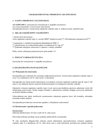 CHARAKTERYSTYKA PRODUKTU LECZNICZEGO 1. NAZWA PRODUKTU LECZNICZEGO AVAXIM 160 U, zawiesina do wstrzykiwań w ampułko-strzykawce Vaccinum hepatitidis A inactivatum adsorbatum Szczepionka przeciw wirusowemu zapaleniu wątroby typu A, inaktywowana, adsorbowana 2. SKŁAD JAKOŚCIOWY I ILOŚCIOWY 1 dawka (0,5) ml zawiera: wirus zapalenia wątroby typu A, szczep GBM* (inaktywowany**) 160 jednostek antygenowych*** * namnażany w ludzkich komórkach diploidalnych MRC-5 ** adsorbowany na wodorotlenku glinu, uwodnionym 0,3 mg Al3+ ***jednostki antygenu oznaczone w oparciu o własny standard. Pełny wykaz substancje pomocniczych, patrz punkt. 6.1. 3. POSTAĆ FARMACEUTYCZNA Zawiesina do wstrzykiwań w ampułko-strzykawce 4. SZCZEGÓŁOWE DANE KLINICZNE 4.1 Wskazania do stosowania Szczepionka jest wskazana do czynnego uodpornienia przeciw wirusowemu zapaleniu wątroby typu A (wzw A) u młodzieży od 16. roku życia i u dorosłych. Szczepionka nie chroni przed zakażeniem wywołanym wirusem zapalenia wątroby typu B, typu C lub typu E, ani żadnymi innymi znanymi drobnoustrojami wywołującymi choroby wątroby. Zakażenie wirusem zapalenia wątroby typu A jest zazwyczaj skutkiem spożycia zakażonej wody lub zakażonego pożywienia. Osoby mające kontakt z zakażonymi osobami ulegają zazwyczaj zakażeniu na drodze fekalno-oralnej. Udowodniona jest także możliwość przenoszenia zakażenia poprzez krew lub kontakty seksualne (stosunki oralno-analne). Szczepionka powinna być stosowana zgodnie z oficjalnymi zaleceniami. 4.2 Dawkowanie i sposób podawania Dawkowanie Zalecane dawkowanie: 0,5 ml u osób od 16. roku życia. Pierwotną ochronę uzyskuje się po podaniu jednej dawki szczepionki. W celu uzyskania długotrwałej ochrony przed zakażeniem spowodowanym wirusem zapalenia wątroby typu A u młodzieży od 16. roku życia oraz u osób dorosłych, powinna być podana dawka 1 uzupełniająca najlepiej pomiędzy 6 i 12 miesiącem od pierwszego szczepienia ale może być podana do 36 miesięcy po pierwszym szczepieniu (patrz punkt 5.1). Szacuje się, że przeciwciała przeciw wirusowi zapalenia wątroby typu A utrzymują się przez kilka lat (co najmniej 10 lat) po drugiej dawce (dawce uzupełniającej). Szczepionka ta może być także stosowana jako dawka uzupełniająca przeciw wirusowemu zapaleniu wątroby typu A u osób od 16. roku życia, które zostały zaszczepione szczepionką skojarzoną przeciw durowi brzusznemu (oczyszczony polisacharyd Vi) i wirusowemu zapaleniu wątroby typu A (inaktywowaną) od 6 do 36 miesięcy wcześniej. Sposób podawania Szczepionka jest adsorbowana i dlatego zaleca się podawanie jej domięśniowo (im.) w celu zminimalizowania działań niepożądanych w miejscu wstrzyknięcia. Miejscem zalecanym do podawania szczepionki jest mięsień naramienny. W wyjątkowych przypadkach szczepionka może być podana podskórnie u pacjentów z trombocytopenią lub u pacjentów, u których istnieje ryzyko wystąpienia krwawienia. Szczepionki nie należy podawać w mięsień pośladkowy ze względu na zmienność tej części ciała (różna ilość tkanki tłuszczowej) ani podawać śródskórnie, ponieważ te drogi podania mogą wpłynąć na uzyskanie mniejszej odpowiedzi immunologicznej. Nie wstrzykiwać donaczyniowo. Przed wstrzyknięciem należy upewnić się, że igła nie tkwi w naczyniu krwionośnym. Szczepionki nie wolno mieszać w jednej strzykawce z innymi szczepionkami. 4.3 Przeciwwskazania Standardowe przeciwwskazania dla wszystkich szczepień: szczepienie powinno być przełożone w przypadku gorączki, ostrej infekcji lub zaostrzenia choroby przewlekłej. Nadwrażliwość na substancje czynną lub na którąkolwiek substancję pomocniczą wymienioną w punkcie 6.1 lub po uprzednim podaniu szczepionki. 4.4 Specjalne ostrzeżenia i środki ostrożności dotyczące stosowania Nie wstrzykiwać donaczyniowo. Przed wstrzyknięciem należy upewnić się, że igła nie tkwi w naczyniu krwionośnym. Jak w przypadku każdego szczepienia, zalecane jest posiadanie roztworu adrenaliny do wstrzyknięć na wypadek wystąpienia reakcji anafilaktycznej. Szczepionki nie należy podawać w mięsień pośladkowy ze względu na zmienność tej części ciała (różna ilość tkanki tłuszczowej) ani podawać śródskórnie, ponieważ te drogi podania mogą wpłynąć na uzyskanie mniejszej odpowiedzi immunologicznej. Odpowiedź immunologiczna po szczepionce może być obniżona u pacjentów w trakcie leczenia immunosupresyjnego lub z niedoborami odporności. W takich przypadkach zalecane jest przesunięcie szczepienia do chwili zakończenia leczenia lub upewnienie się, że osoba jest dobrze chroniona. Pomimo to, szczepienie osób z przewlekłym 2 niedoborem odporności jak zakażenie HIV jest zalecane, jeżeli istniejąca choroba pozwala na odpowiedź immunologiczną, nawet jeśli odpowiedź może być ograniczona. Z powodu okresu inkubacji choroby, zakażenie może być już obecne w momencie szczepienia, jednakże nie wykryte. W przypadku zaszczepienia osoby w okresie inkubacji wirusa, szczepionka może nie mieć wpływu na rozwój wirusowego zapalenia wątroby typu A. Należy uważnie rozważyć zastosowanie szczepionki u pacjentów z chorobami wątroby, ponieważ nie przeprowadzano badań z udziałem takich pacjentów. W wyjątkowych przypadkach szczepionka może być podana podskórnie u pacjentów z trombocytopenią lub u pacjentów z ryzykiem krwawienia. Należy zachować ostrożność u osób z nadwrażliwością na neomycynę ponieważ każda dawka zawiera śladowe ilości tego antybiotyku. 4.5 Interakcje z innymi produktami leczniczymi i inne rodzaje interakcji Immunoglobuliny mogą być podawane jednocześnie ze szczepionką, jeśli zostaną wstrzyknięte w dwa różne miejsca ciała. Odsetek seroprotekcji nie ulega zmianie, ale miana przeciwciał mogą być niższe niż te uzyskiwane po podawaniu samej szczepionki. Szczepionka jest inaktywowana i podana jednocześnie z i
