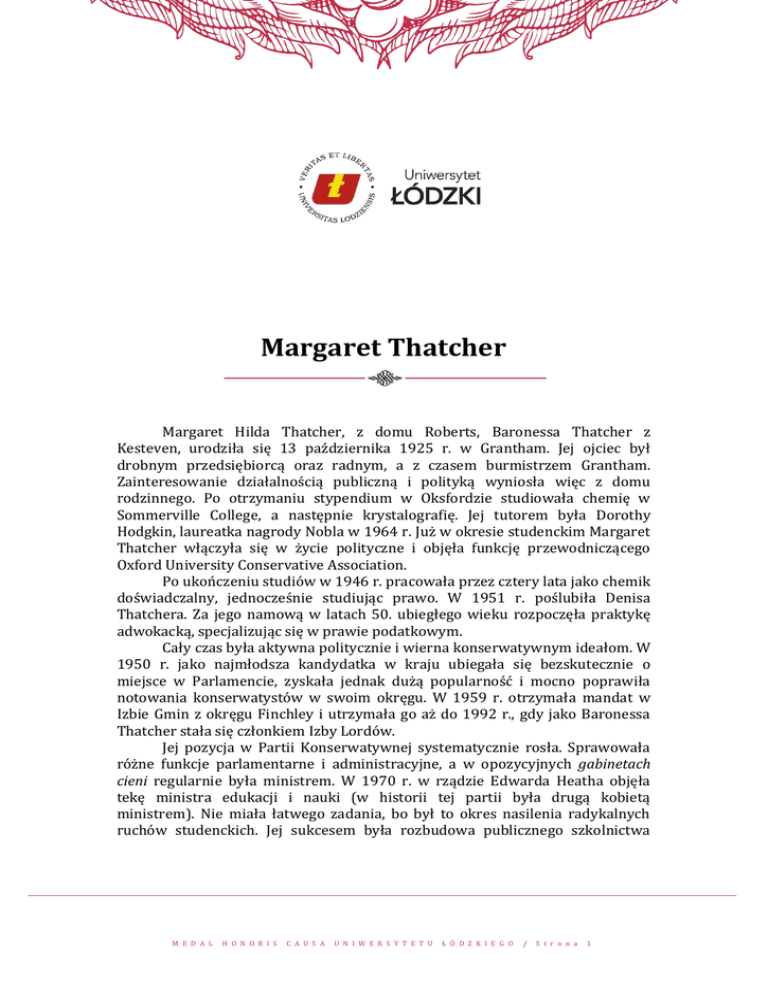 Margaret Thatcher Margaret Hilda Thatcher, z domu Roberts, Baronessa Thatcher z Kesteven, urodziła się 13 października 1925 r. w Grantham. Jej ojciec był drobnym przedsiębiorcą oraz radnym, a z czasem burmistrzem Grantham. Zainteresowanie działalnością publiczną i polityką wyniosła więc z domu rodzinnego. Po otrzymaniu stypendium w Oksfordzie studiowała chemię w Sommerville College, a następnie krystalografię. Jej tutorem była Dorothy Hodgkin, laureatka nagrody Nobla w 1964 r. Już w okresie studenckim Margaret Thatcher włączyła się w życie polityczne i objęła funkcję przewodniczącego Oxford University Conservative Association. Po ukończeniu studiów w 1946 r. pracowała przez cztery lata jako chemik doświadczalny, jednocześnie studiując prawo. W 1951 r. poślubiła Denisa Thatchera. Za jego namową w latach 50. ubiegłego wieku rozpoczęła praktykę adwokacką, specjalizując się w prawie podatkowym. Cały czas była aktywna politycznie i wierna konserwatywnym ideałom. W 1950 r. jako najmłodsza kandydatka w kraju ubiegała się bezskutecznie o miejsce w Parlamencie, zyskała jednak dużą popularność i mocno poprawiła notowania konserwatystów w swoim okręgu. W 1959 r. otrzymała mandat w Izbie Gmin z okręgu Finchley i utrzymała go aż do 1992 r., gdy jako Baronessa Thatcher stała się członkiem Izby Lordów. Jej pozycja w Partii Konserwatywnej systematycznie rosła. Sprawowała różne funkcje parlamentarne i administracyjne, a w opozycyjnych gabinetach cieni regularnie była ministrem. W 1970 r. w rządzie Edwarda Heatha objęła tekę ministra edukacji i nauki (w historii tej partii była drugą kobietą ministrem). Nie miała łatwego zadania, bo był to okres nasilenia radykalnych ruchów studenckich. Jej sukcesem była rozbudowa publicznego szkolnictwa M E D A L H O N O R I S C A U S A U N I W E R S Y T E T U Ł Ó D Z K I E G O / S t r o n a 1 M E D A L H O N O R I S C A U S A U N I W E R S Y T E T U Ł Ó D Z K I E G O średniego, mającego lepiej przygotować niezamożną młodzież do studiów wyższych. Po przegranych przez konserwatystów wyborach Margaret Thatcher niespodziewanie została wybrana na szefa partii w 1975 r., głównie dzięki poparciu jej prawego skrzydła. Była pierwszą kobietą na Zachodzie pełniącą podobną funkcję i pierwszą kobietą – liderem opozycji w Izbie Gmin. Z dużym niepokojem obserwowała pogarszającą się sytuację gospodarczą swego kraju i towarzyszące jej coraz większe niezadowolenie społeczne. Świadczyły o tym wysokie podatki, sięgające 90% w odniesieniu do osiąganych dochodów i 98% w odniesieniu do spadku dziedziczonego po najbliższych krewnych, stopa inflacji (najwyższa w Europie Zachodniej) sięgająca 27% rocznie, wysoki deficyt w handlu zagranicznym, rozrost biurokracji, nadmierna ilość regulacji i subsydiów dla znacjonalizowanych przemysłów, ogromna samowola związków zawodowych, przy stosunkowo niskiej wydajności pracy w przemyśle. Jako lider Partii Konserwatywnej zaprezentowała w pierwszym przemówieniu swoją wizję rodzaju życia, do jakiego ma prawo każdy obywatel: „Prawo człowieka do takiej pracy jaką chce podjąć, prawo do wydawania tego, co zarobił, prawo do tego, by państwo było jego sługą, a nie jego panem […] Te prawa są esencją wolnego kraju i od ich realizacji zależą wszystkie nasze wolności”. W 1979 r. po raz pierwszy Lady Margaret Thather zwyciężyła w wyborach powszechnych (większością 43 mandatów) i objęła stanowisko premiera Wielkiej Brytanii. Jako premier rozpoczęła szeroko zakrojony program liberalnych zmian gospodarczych i społecznych, który przewidywał: zwiększenie niezależności obywatela od państwa; ograniczenie nadmiernej interwencji rządu w gospodarkę; prywatyzację przedsiębiorstw państwowych; sprzedaż najemcom mieszkań komunalnych; ograniczenie wydatków państwa na służbę zdrowia, edukację, mieszkalnictwo; zmniejszenie podaży pieniądza zgodnie z doktryną monetaryzmu; prawne ograniczenie politycznych kompetencji związków zawodowych. Liberalna treść, jasno wytyczone cele oraz bezkompromisowy styl uprawiania polityki zyskały wkrótce miano thatcheryzmu. Głównym zadaniem programu Margaret Thatcher było ratowanie gospodarki przed zapaścią. Radykalna kuracja, którą zaaplikowała zrywając z doktryną keynesizmu, stworzyła wkrótce podstawy do długofalowego wzrostu gospodarczego. Program ratunkowy nie był jednak powszechnie zrozumiały i akceptowany, jego wprowadzenie wymagało więc dużej odwagi intelektualnej i siły woli. Wprawdzie ożywienie gospodarcze szybko wytrąciło krytykom najważniejsze argumenty, ale bez zaufania społecznego kontynuowanie reform byłoby niemożliwe. Pani premier zdobyła je ostatecznie zwycięstwem w wojnie M E D A L H O N O R I S C A U S A U N I W E R S Y T E T U Ł Ó D Z K I E G O / S t r o n a 2 M E D A L H O N O R I S C A U S A U N I W E R S Y T E T U Ł Ó D Z K I E G O o Wyspy Falklandzkie, zajęte przez Argentynę w kwietniu 1982 r. W efekcie w 1983 r. wygrała kolejne wybory powszechne, tym razem z przewagą aż 144 mandatów. Druga kadencja nie była łatwiejsza od pierwszej, mimo że gospodarka weszła na ścieżkę szybkiego wzrostu oraz konieczności dalszej redukcji inflacji (która ostatecznie została zmniejszona z 21% w roku 1980 do 3% w roku 1987). Głównym problemem stał się trwający niemal rok strajk górników, ostro protestujących przeciwko zamykaniu nierentownych kopalni, a także przeciwko legislacji ograniczającej rolę związków w państwie. Premier Margaret Thatcher nie uległa jednak szantażowi: górnicy wrócili do pracy, nie uzyskując żadnych koncesji. W 1984 r. IRA przeprowadziła atak bombowy na hotel, w którym odbywała się konferencja torysów. Zginęło kilka osób, ale premier Margaret Thatcher wyszła z zamachu bez szwanku. Na fali sukcesów gospodarczych premier Margaret Thatcher wygrała po raz 