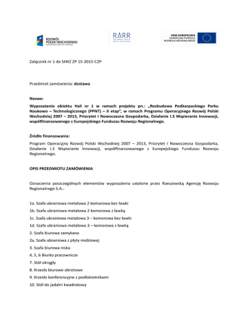 Załącznik nr 1 do SIWZ ZP 15-2015-CZP Przedmiot zamówienia: dostawa Nazwa: Wyposażenie obiektu Hali nr 1 w ramach projektu pn.: „Rozbudowa Podkarpackiego Parku Naukowo – Technologicznego (PPNT) – II etap”, w ramach Programu Operacyjnego Rozwój Polski Wschodniej 2007 – 2013, Priorytet I Nowoczesna Gospodarka, Działanie I.3 Wspieranie Innowacji, współfinansowanego z Europejskiego Funduszu Rozwoju Regionalnego. Źródło finansowania: Program Operacyjny Rozwój Polski Wschodniej 2007 – 2013, Priorytet I Nowoczesna Gospodarka, Działanie I.3 Wspieranie Innowacji, współfinansowanego z Europejskiego Funduszu Rozwoju Regionalnego. OPIS PRZEDMIOTU ZAMÓWIENIA Oznaczenia poszczególnych elementów wyposażenia ustalone przez Rzeszowską Agencję Rozwoju Regionalnego S.A.: 1a. Szafa ubraniowa metalowa 2 komorowa bez ławki 1b. Szafa ubraniowa metalowa 2 komorowa z ławką 1c. Szafa ubraniowa metalowa 3 – komorowa bez ławki 1d. Szafa ubraniowa metalowa 3 – komorowa z ławką 2. Szafa biurowa zamykana 2a. Szafa ubraniowa z płyty meblowej 3. Szafa biurowa niska 4, 5, 6 Biurko pracownicze 7. Stół okrągły 8. Krzesło biurowe obrotowe 9. Krzesło konferencyjne z podłokietnikami 10. Stół do jadalni kwadratowy 10a. Krzesło do jadalni 11. Szafka kuchenna stojąca pod zlewozmywak 12. Szafka kuchenna stojąca 13. Szafka kuchenna wisząca 14. Blat kuchenny roboczy 80x160 16. Lada recepcyjna wysoka 16a. Lada recepcyjna niska 17. Sofa 2 osobowa 18. Fotel 19. Stolik niski okolicznościowy 20. Stół konferencyjny 140x70 21. Krzesło konferencyjne z podłokietnikami 22. Szafa biurowa niska 24. Wieszak ubraniowy stojący 150 cm długości 25. Kontener biurowy mobilny 26. Pomocnik do biurka pracowniczego 27. Ścianka międzybiurkowa Przedmiotem zamówienia jest dostarczenie i montaż: Nazwa i wymiary zewnętrzne mebla Szafa ubraniowa metalowa 2 – modułowa (2-komorowa) na nóżkach bez ławki Wymiary (około): szerokość 60 cm, głębokość 50 cm, wysokość 180cm szafa + 40cm podstawa bez ławki Oznaczenie Ilość Nazwa i numer mebla na [sztuk] pomieszczenia rysunku szatnia mężczyzn nr 1.11, 1.13 1a 7 szatnia kobiet nr 1.15, 1.16 Opis mebla Szafa ubraniowa metalowa 2 – komorowa, przeznaczona do pomieszczeń o podwyższonej wilgotności. Dwie niezależne komory z metalową górną półką. Otwory wentylacyjne w dolnej i górnej części drzwi. Konstrukcja szafy z profili zamkniętych i blachy stalowej grubości min.0,8mm, Całość ocynkowana i malowana proszkowo na kolor jasnoszary. Zamek kluczowy z ryglowaniem drzwi w trzech punktach. Szafa wyposażona w plastikowy drążek, wieszaki ubraniowe, haczyk na ręczniki oraz lusterko. Szafa ustawiona na stalowej podstawie ramowej z profili zamkniętych z nóżkami wyposażonymi w stopki poziomujące – bez ławki. Wymiary (około): szerokość 60 cm, głębokość 50 cm, wysokość 180cm szafa + 40cm podstawa bez ławki Szafa ubraniowa 2 – komorowa metalowa jw. Szafa ubraniowa metalowa 2 – modułowa (2-komorowa) na nóżkach z ławką Wymiary (około): szerokość 60 cm, głębokość 50 cm, wysokość 180cm szafa + 40cm podstawa z ławką szatnia mężczyzn nr 1.11, 1.13 1b 12 szatnia kobiet nr 1.15, 1.16 Szafa ustawiona na stalowej podstawie ramowej z profili zamkniętych ocynkowanych i malowanych proszkowo z nóżkami wyposażonymi w stopki poziomujące – z ławką jednostronną na długość szafy. Siedzisko ławki z listew plastikowych lub drewnianych odpornych na wilgoć. Wymiary (około): szerokość 60 cm, głębokość 50 cm, wysokość 180cm szafa + 40cm podstawa z ławką Rysunek poglądowy Szafa ubraniowa metalowa 3 – modułowa (3-komorowa) na nóżkach bez ławki Wymiary (około): szerokość 90 cm, głębokość 50 cm, wysokość 180cm szafa + 40cm podstawa bez ławki Szafa ubraniowa 3 – komorowa metalowa jw. szatnia mężczyzn nr 1.11, 1.13 1c 8 szatnia kobiet nr 1.15, 1.16 Szafa ustawiona na stalowej podstawie ramowej z profili zamkniętych z nóżkami wyposażonymi w stopki poziomujące – bez ławki. Wymiary (około): szerokość 90 cm, głębokość 50 cm, wysokość 180cm szafa + 40cm podstawa bez ławki Szafa ubraniowa 3 – komorowa metalowa jw. Szafa ubraniowa metalowa 3 – modułowa (3-komorowa) na nóżkach z ławką Wymiary (około): szerokość 90 cm, głębokość 50 cm, wysokość 180cm szafa + 40cm podstawa z ławką szatnia mężczyzn nr 1.11, 1.13 1d 26 szatnia kobiet nr 1.15, 1.16 Szafa biurowa 5-poziomowa na segregatory; zamykana dwudrzwiowa Wymiary (około): szerokość 80 cm, wysokość 190-200 cm, głębokość 45 cm. 2 4 Pokój biurowy nr 0.12 Szafa ustawiona na stalowej podstawie ramowej z profili zamkniętych ocynkowanych i malowanych proszkowo z nóżkami wyposażonymi w stopki poziomujące – z ławką jednostronną na długość szafy. Siedzisko ławki z listew plastikowych lub drewnianych odpornych na wilgoć. Wymiary (około): szerokość 90 cm, głębokość 50 cm, wysokość 180cm szafa + 40cm podstawa z ławką Szafa dwudrzwiowa 4-półkowa z drzwiami rozwieralnymi. Konstrukcja szafy wieńcowa, skręcana. Elementy korpusu połączone za pomocą złączy mimośrodowych niewidocznych na zewnątrz i umożliwiających wymianę poszczególnych elementów w przypadku ich uszkodzenia. Nie dopuszcza się konstrukcji klejonej. Wykonana z trójwarstwowej meblowej płyty wiórowej obustronnie melaminowanej o podwyższonej trwałości, w klasie higieniczności E1. Obrzeża termoplastyczne ABS (dopuszcza się PCV) grubości min.2mm dobrane pod kolor płyty – trwałe i estetycznie zamontowane na wykańczanych krawędziach. Krawędzie obrzeży zaokrąglone R=2mm. Korpus wykonany z płyty grubości min.18 mm o gęstości powyżej 750kg/m3, fronty i plecy - z płyty grubości min.16 mm, wieniec górny i dolny - z płyty grubości min.25 mm, półki – grubości min.25 mm o gęstości powyżej 700 kg/m3.Dopuszcza się plecy z jednego arkusza płyty HDF gr. min. 3mm w kolorze sza