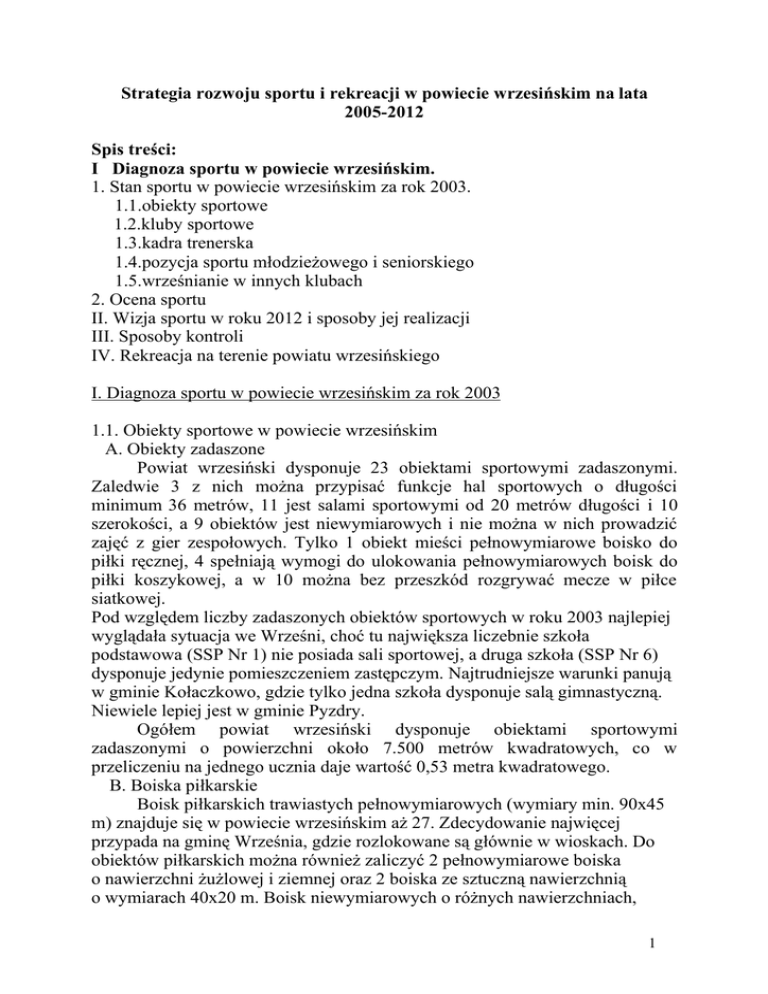 Strategia rozwoju sportu i rekreacji w powiecie wrzesińskim na lata 2005-2012 Spis treści: I Diagnoza sportu w powiecie wrzesińskim. 1. Stan sportu w powiecie wrzesińskim za rok 2003. 1.1.obiekty sportowe 1.2.kluby sportowe 1.3.kadra trenerska 1.4.pozycja sportu młodzieżowego i seniorskiego 1.5.wrześnianie w innych klubach 2. Ocena sportu II. Wizja sportu w roku 2012 i sposoby jej realizacji III. Sposoby kontroli IV. Rekreacja na terenie powiatu wrzesińskiego I. Diagnoza sportu w powiecie wrzesińskim za rok 2003 1.1. Obiekty sportowe w powiecie wrzesińskim A. Obiekty zadaszone Powiat wrzesiński dysponuje 23 obiektami sportowymi zadaszonymi. Zaledwie 3 z nich można przypisać funkcje hal sportowych o długości minimum 36 metrów, 11 jest salami sportowymi od 20 metrów długości i 10 szerokości, a 9 obiektów jest niewymiarowych i nie można w nich prowadzić zajęć z gier zespołowych. Tylko 1 obiekt mieści pełnowymiarowe boisko do piłki ręcznej, 4 spełniają wymogi do ulokowania pełnowymiarowych boisk do piłki koszykowej, a w 10 można bez przeszkód rozgrywać mecze w piłce siatkowej. Pod względem liczby zadaszonych obiektów sportowych w roku 2003 najlepiej wyglądała sytuacja we Wrześni, choć tu największa liczebnie szkoła podstawowa (SSP Nr 1) nie posiada sali sportowej, a druga szkoła (SSP Nr 6) dysponuje jedynie pomieszczeniem zastępczym. Najtrudniejsze warunki panują w gminie Kołaczkowo, gdzie tylko jedna szkoła dysponuje salą gimnastyczną. Niewiele lepiej jest w gminie Pyzdry. Ogółem powiat wrzesiński dysponuje obiektami sportowymi zadaszonymi o powierzchni około 7.500 metrów kwadratowych, co w przeliczeniu na jednego ucznia daje wartość 0,53 metra kwadratowego. B. Boiska piłkarskie Boisk piłkarskich trawiastych pełnowymiarowych (wymiary min. 90x45 m) znajduje się w powiecie wrzesińskim aż 27. Zdecydowanie najwięcej przypada na gminę Września, gdzie rozlokowane są głównie w wioskach. Do obiektów piłkarskich można również zaliczyć 2 pełnowymiarowe boiska o nawierzchni żużlowej i ziemnej oraz 2 boiska ze sztuczną nawierzchnią o wymiarach 40x20 m. Boisk niewymiarowych o różnych nawierzchniach, 1 na których można rozgrywać zawody w piłce pięcioosobowej jest zdecydowanie więcej. C. Inne boiska W powiecie wrzesińskim w roku 2003 naliczyliśmy 17 boisk do piłki siatkowej plażowej. Najwięcej, bo aż 8 znajduje się we Wrześni. Także w tym mieście znajdują się cztery korty do tenisa ziemnego o nawierzchni ceglanej, stadion lekkoatletyczny niepełnowymiarowy, tor do kolarstwa górskiego oraz dwa baseny pływackie 25 metrowe, jeden kryty i jeden odkryty. Zimą czynne jest odkryte lodowisko. W Orzechowie znajduje się jeden kort do tenisa ziemnego o nawierzchni ceglanej oraz basen kąpielowy odkryty. W powiecie rozmieszczonych jest wiele placów o nawierzchni asfaltowej. Jednak obecnie, ze względów zdrowotnych, tej nawierzchni nie wykorzystuje się do żadnych rozgrywek sportowych prowadzonych przez poszczególne związki sportowe. Dlatego też przy spisie obiektów sportowych postanowiliśmy ominąć te place, gdyż faktycznie nie powinny spełniać funkcji boisk sportowych. 1.2. Kluby sportowe na terenie powiatu wrzesińskiego Na terenie naszego powiatu zarejestrowane są 63 kluby sportowe, z których 32 to Uczniowskie Kluby Sportowe rekrutujące swych członków głównie spośród uczącej się młodzieży. W sezonie 2003/2004 jedynie 17 klubów wzięło udział w rozgrywkach poszczególnych okręgowych lub polskich związków sportowych. Są to: A. Gmina Września · Victoria Września (piłka nożna mężczyzn - drużyny seniorów, juniorów, trampkarzy) · Błękitni Psary Polskie (piłka nożna mężczyzn – drużyna seniorów, juniorów, trampkarzy), · Kosynier Sokołowo (piłki nożna mężczyzn - drużyna seniorów i trampkarzy), · Orkan Września (piłka siatkowa kobiet – zespół seniorek i zespoły juniorek) oraz sekcja lekkiej atletyki dziewcząt i chłopców w kategorii młodzików), Progress Września (piłka siatkowa mężczyzn – drużyna seniorów i juniorów młodszych), · Wrzesiński Klub Koszykówki (piłka koszykowa mężczyzn- zespół seniorów), · MKS Września (piłka koszykowa- zespół młodzieżowy), · Wrzos Września (szachy- drużyna seniorów), · UKS Iskra Marzenin (szachy- drużyna seniorów i juniorów), · UKS Żak Września (szachy- drużyna seniorów, juniorów oraz sekcja lekkiej atletyki- juniorzy), · Wrzesiński Klub Karate De Shotokan (karate- juniorzy), 2 · UKS Olimp Września (piłka nożna- zespół trampkarzy, piłka siatkowazespól młodziczek). B. Gmina Miłosław · Orlik Miłosław (piłka nożna – zespoły seniorów, juniorów i trampkarzy), · MCK Fortuna Miłosław (tenis stołowy – zespół seniorów) · Sparta Orzechowo (piłka nożna – zespoły seniorów i trampkarzy) C. Gmina Nekla · Płomień Nekla (piłka nożna – zespoły seniorów i trampkarzy) D. Gmina Pyzdry · Prosna Lisewo (piłka nożna – zespół juniorów) E. Gmina Kołaczkowo (brak zespołów zgłoszonych do rozgrywek) 1.3. Kadra trenerska w powiecie wrzesińskim W powiecie wrzesińskim z zespołami zgłoszonymi do rozgrywek oraz z zawodnikami w sportach indywidualnych pracuje ogółem 38 trenerów i instruktorów sportowych. Liczba ta obejmuje jedynie trenerów i instruktorów pracujących dla klubów sportowych, zrzeszeń, klas sportowych i z zawodnikami biorącymi udział w zawodach okręgowych związków sportowych. Podział kadry trenerskiej na poszczególne dyscypliny · piłka nożna – 19 · lekka atletyka – 7 · piłka siatkowa kobiet – 4 · piłka siatkowa mężczyzn – 4 · piłka koszykowa mężczyzn – 2 · szachy – 2 · karate – 2 Dwóch trenerów pracuje w dwóch różnych dyscyplinach. 1.4. Pozycja sportu wrzesińskiego Pozycję sportu młodzieżowego można łatwo wyznaczyć na podstawie klasyfikacji Departamentu Kultury Fizycznej i Spor