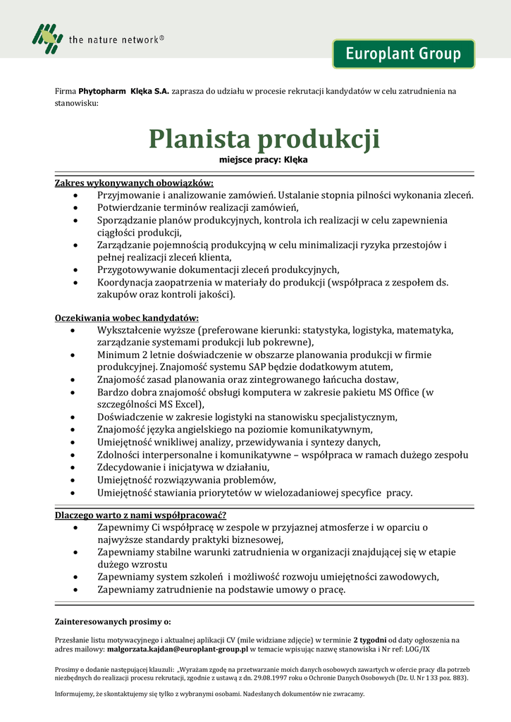 Firma Phytopharm Klęka S.A. zaprasza do udziału w procesie rekrutacji kandydatów w celu zatrudnienia na stanowisku: Planista produkcji miejsce pracy: Klęka Zakres wykonywanych obowiązków: Przyjmowanie i analizowanie zamówień. Ustalanie stopnia pilności wykonania zleceń. Potwierdzanie terminów realizacji zamówień, Sporządzanie planów produkcyjnych, kontrola ich realizacji w celu zapewnienia ciągłości produkcji, Zarządzanie pojemnością produkcyjną w celu minimalizacji ryzyka przestojów i pełnej realizacji zleceń klienta, Przygotowywanie dokumentacji zleceń produkcyjnych, Koordynacja zaopatrzenia w materiały do produkcji (współpraca z zespołem ds. zakupów oraz kontroli jakości). Oczekiwania wobec kandydatów: Wykształcenie wyższe (preferowane kierunki: statystyka, logistyka, matematyka, zarządzanie systemami produkcji lub pokrewne), Minimum 2 letnie doświadczenie w obszarze planowania produkcji w firmie produkcyjnej. Znajomość systemu SAP będzie dodatkowym atutem, Znajomość zasad planowania oraz zintegrowanego łańcucha dostaw, Bardzo dobra znajomość obsługi komputera w zakresie pakietu MS Office (w szczególności MS Excel), Doświadczenie w zakresie logistyki na stanowisku specjalistycznym, Znajomość języka angielskiego na poziomie komunikatywnym, Umiejętność wnikliwej analizy, przewidywania i syntezy danych, Zdolności interpersonalne i komunikatywne – współpraca w ramach dużego zespołu Zdecydowanie i inicjatywa w działaniu, Umiejętność rozwiązywania problemów, Umiejętność stawiania priorytetów w wielozadaniowej specyfice pracy. Dlaczego warto z nami współpracować? Zapewnimy Ci współpracę w zespole w przyjaznej atmosferze i w oparciu o najwyższe standardy praktyki biznesowej, Zapewniamy stabilne warunki zatrudnienia w organizacji znajdującej się w etapie dużego wzrostu Zapewniamy system szkoleń i możliwość rozwoju umiejętności zawodowych, Zapewniamy zatrudnienie na podstawie umowy o pracę. Zainteresowanych prosimy o: Przesłanie listu motywacyjnego i aktualnej aplikacji CV (mile widziane zdjęcie) w terminie 2 tygodni od daty ogłoszenia na adres mailowy: [email protected] w temacie wpisując nazwę stanowiska i Nr ref: LOG/IX Prosimy o dodanie następującej klauzuli: „Wyrażam zgodę na przetwarzanie moich danych osobowych zawartych w ofercie pracy dla potrzeb niezbędnych do realizacji procesu rekrutacji, zgodnie z ustawą z dn. 29.08.1997 roku o Ochronie Danych Osobowych (Dz. U. Nr 133 poz. 883). Informujemy, że skontaktujemy się tylko z wybranymi osobami. Nadesłanych dokumentów nie zwracamy.