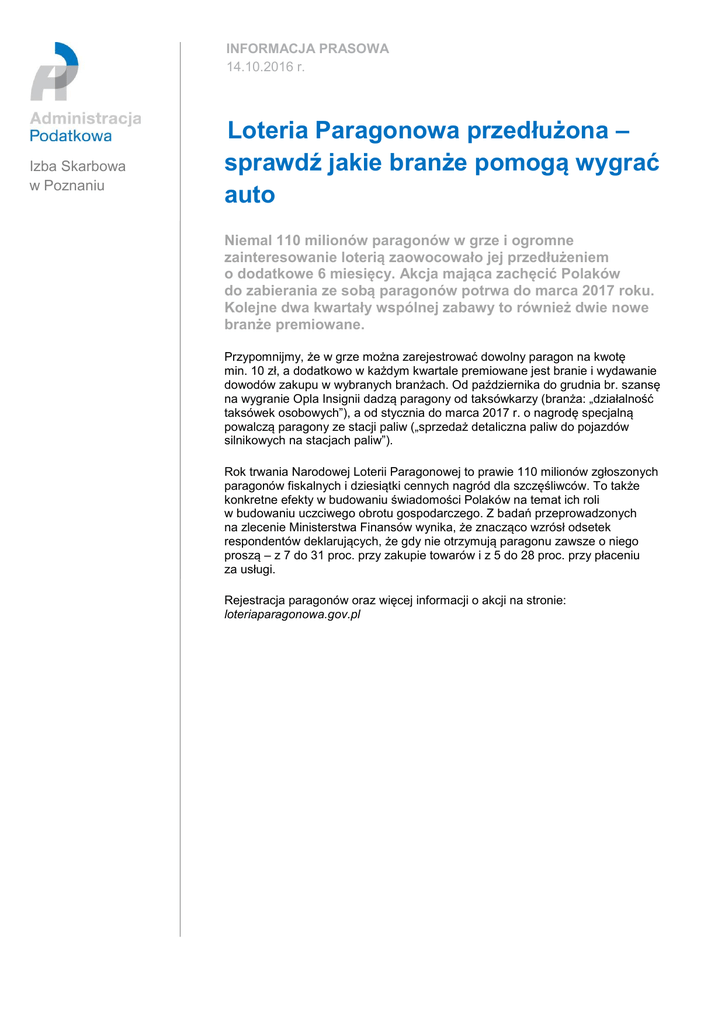 INFORMACJA PRASOWA 14.10.2016 r. Izba Skarbowa w Poznaniu Loteria Paragonowa przedłużona – sprawdź jakie branże pomogą wygrać auto Niemal 110 milionów paragonów w grze i ogromne zainteresowanie loterią zaowocowało jej przedłużeniem o dodatkowe 6 miesięcy. Akcja mająca zachęcić Polaków do zabierania ze sobą paragonów potrwa do marca 2017 roku. Kolejne dwa kwartały wspólnej zabawy to również dwie nowe branże premiowane. Przypomnijmy, że w grze można zarejestrować dowolny paragon na kwotę min. 10 zł, a dodatkowo w każdym kwartale premiowane jest branie i wydawanie dowodów zakupu w wybranych branżach. Od października do grudnia br. szansę na wygranie Opla Insignii dadzą paragony od taksówkarzy (branża: „działalność taksówek osobowych”), a od stycznia do marca 2017 r. o nagrodę specjalną powalczą paragony ze stacji paliw („sprzedaż detaliczna paliw do pojazdów silnikowych na stacjach paliw”). Rok trwania Narodowej Loterii Paragonowej to prawie 110 milionów zgłoszonych paragonów fiskalnych i dziesiątki cennych nagród dla szczęśliwców. To także konkretne efekty w budowaniu świadomości Polaków na temat ich roli w budowaniu uczciwego obrotu gospodarczego. Z badań przeprowadzonych na zlecenie Ministerstwa Finansów wynika, że znacząco wzrósł odsetek respondentów deklarujących, że gdy nie otrzymują paragonu zawsze o niego proszą – z 7 do 31 proc. przy zakupie towarów i z 5 do 28 proc. przy płaceniu za usługi. Rejestracja paragonów oraz więcej informacji o akcji na stronie: loteriaparagonowa.gov.pl