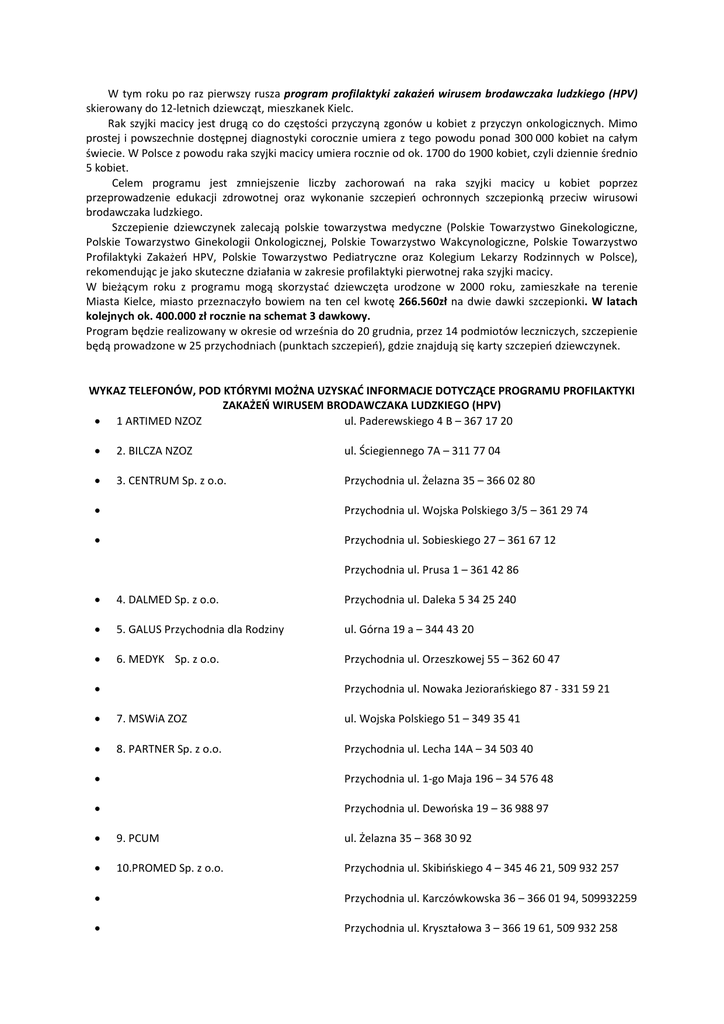 W tym roku po raz pierwszy rusza program profilaktyki zakażeń wirusem brodawczaka ludzkiego (HPV) skierowany do 12-letnich dziewcząt, mieszkanek Kielc. Rak szyjki macicy jest drugą co do częstości przyczyną zgonów u kobiet z przyczyn onkologicznych. Mimo prostej i powszechnie dostępnej diagnostyki corocznie umiera z tego powodu ponad 300 000 kobiet na całym świecie. W Polsce z powodu raka szyjki macicy umiera rocznie od ok. 1700 do 1900 kobiet, czyli dziennie średnio 5 kobiet. Celem programu jest zmniejszenie liczby zachorowań na raka szyjki macicy u kobiet poprzez przeprowadzenie edukacji zdrowotnej oraz wykonanie szczepień ochronnych szczepionką przeciw wirusowi brodawczaka ludzkiego. Szczepienie dziewczynek zalecają polskie towarzystwa medyczne (Polskie Towarzystwo Ginekologiczne, Polskie Towarzystwo Ginekologii Onkologicznej, Polskie Towarzystwo Wakcynologiczne, Polskie Towarzystwo Profilaktyki Zakażeń HPV, Polskie Towarzystwo Pediatryczne oraz Kolegium Lekarzy Rodzinnych w Polsce), rekomendując je jako skuteczne działania w zakresie profilaktyki pierwotnej raka szyjki macicy. W bieżącym roku z programu mogą skorzystać dziewczęta urodzone w 2000 roku, zamieszkałe na terenie Miasta Kielce, miasto przeznaczyło bowiem na ten cel kwotę 266.560zł na dwie dawki szczepionki. W latach kolejnych ok. 400.000 zł rocznie na schemat 3 dawkowy. Program będzie realizowany w okresie od września do 20 grudnia, przez 14 podmiotów leczniczych, szczepienie będą prowadzone w 25 przychodniach (punktach szczepień), gdzie znajdują się karty szczepień dziewczynek. WYKAZ TELEFONÓW, POD KTÓRYMI MOŻNA UZYSKAĆ INFORMACJE DOTYCZĄCE PROGRAMU PROFILAKTYKI ZAKAŻEŃ WIRUSEM BRODAWCZAKA LUDZKIEGO (HPV) • 1 ARTIMED NZOZ ul. Paderewskiego 4 B – 367 17 20 • 2. BILCZA NZOZ ul. Ściegiennego 7A – 311 77 04 • 3. CENTRUM Sp. z o.o. Przychodnia ul. Żelazna 35 – 366 02 80 • Przychodnia ul. Wojska Polskiego 3/5 – 361 29 74 • Przychodnia ul. Sobieskiego 27 – 361 67 12 Przychodnia ul. Prusa 1 – 361 42 86 • 4. DALMED Sp. z o.o. Przychodnia ul. Daleka 5 34 25 240 • 5. GALUS Przychodnia dla Rodziny ul. Górna 19 a – 344 43 20 • 6. MEDYK Sp. z o.o. Przychodnia ul. Orzeszkowej 55 – 362 60 47 Przychodnia ul. Nowaka Jeziorańskiego 87 - 331 59 21 • • 7. MSWiA ZOZ ul. Wojska Polskiego 51 – 349 35 41 • 8. PARTNER Sp. z o.o. Przychodnia ul. Lecha 14A – 34 503 40 • Przychodnia ul. 1-go Maja 196 – 34 576 48 • Przychodnia ul. Dewońska 19 – 36 988 97 • 9. PCUM ul. Żelazna 35 – 368 30 92 • 10.PROMED Sp. z o.o. Przychodnia ul. Skibińskiego 4 – 345 46 21, 509 932 257 • Przychodnia ul. Karczówkowska 36 – 366 01 94, 509932259 • Przychodnia ul. Kryształowa 3 – 366 19 61, 509 932 258 Przychodnia Zapiecek 368 81 17 • • 11. RODZINA Sp. z o.o. ul. Orląt Lwowskich 72 K – 332 71 73 • 12.SUPRAMED Sp. z o.o. Przychodnia ul. Warszawska 151 – 331 60 08 • Przychodnia ul. Pocieszka 11 – 344 75 84 • Przychodnia ul. Zamenhoffa 4 - 331 57 86 • 13. Sitkówka Nowiny SZPOZ ul. Białe Zagłębie 32 – 345 94 68 • 14. ZDROWIE Centrum Medyczne ul. Warszawska 34 – 344 85 15