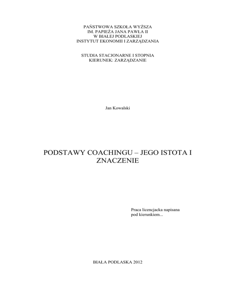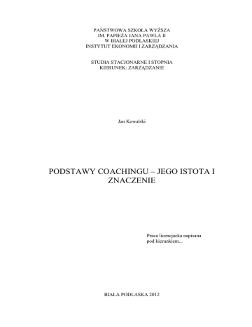 PAŃSTWOWA SZKOŁA WYŻSZA IM. PAPIEŻA JANA PAWŁA II W BIAŁEJ PODLASKIEJ INSTYTUT EKONOMII I ZARZĄDZANIA STUDIA STACJONARNE I STOPNIA KIERUNEK: ZARZĄDZANIE Jan Kowalski PODSTAWY COACHINGU – JEGO ISTOTA I ZNACZENIE Praca licencjacka napisana pod kierunkiem... BIAŁA PODLASKA 2012 SPIS TREŚCI SPIS TREŚCI Wstęp ............................................................................................................. 4 Rozdział 1. Ruszaj w podróż z coachingiem ................................................ 5 Czym jest coaching? ............................................................................ 5 Rodzaje coachingu ............................................................................... 6 Relacja coachingowa ........................................................................... 8 Zasady coachingu i postawa coacha .................................................... 9 o 5 zasad coachingu w podejściu ericksonowskim ............................. 9 Kluczowe umiejętności coacha ......................................................... 12 o Aktywne słuchanie ......................................................................... 12 o Sprawcza moc pytań ....................................................................... 13 Rozdział 2. Potencjał człowieka ................................................................. 14 Jakim potencjałem dysponuje człowiek? .......................................... 14 Świadomość potencjału człowieka a postawa coacha ....................... 16 Rozdział 3. Rozmowa coachingowa ........................................................... 17 Model rozmowy coachingowej ......................................................... 17 Model GROW .................................................................................... 17 o CEL ................................................................................................. 18 o RZECZYWISTOŚĆ ....................................................................... 18 o OPCJE ............................................................................................ 19 o ZOBOWIĄZANIE KOŃCOWE .................................................... 20 12.11.2012 3 WSTĘP Wstęp Od ponad dwudziestu lat w zachodnim świecie biznesu COACHING jest uznawany za jedną z najbardziej efektywnych metod rozwoju, zarówno poszczególnych osób, jak i organizacji oraz przedsiębiorstw, stosowaną z powodzeniem wśród kadry zarządzającej oraz menedżerskiej. Tym samym coaching jest w ostatnich latach jedną z najdynamiczniej rozwijających się dziedzin na świecie. Jego popularność wynika z faktu, że przynosi spektakularne korzyści i ułatwia ludziom osiąganie sukcesów tak w życiu zawodowym, jak i prywatnym. Coaching na polskim rynku jest dopiero w fazie wdrożenia i implementacji. Stwarza nam to możliwość wykorzystania doświadczeń innych krajów, które postrzegają coaching jako realną wartość, jako metodę o wysokiej skuteczności. Docenienie rezultatów, jakie przynosi coaching, i wynikające z tego zapotrzebowanie na tę metodę w Polsce w ciągu ostatnich lat stale rośnie, a w ślad za nim w sposób geometryczny zwiększa się zapotrzebowanie na osoby świadczące profesjonalne usługi coachingowe. Na rynku szkoleniowo-edukacyjnym oferowane są różnorodne formy kształcenia coachów — od kilkudniowych szkoleń, poprzez edukację akademicką, aż do wielomiesięcznych kursów, mających akredytację międzynarodowych organizacji wyznaczających standardy coachingu. Na podstawie certyfikacji Erickson College International, ugruntowanej, kilkuletniej praktyki coachingowej oraz kompetencji nabytych i nieustannie doskonalonych w najważniejszych na świecie szkołach i organizacjach coachingo-wych (Erickson College International, Center for Right Relationship European, International Coach Federation) postanowiłyśmy przygotować książkę, która krok po kroku pozwoli początkującemu coachowi poznać tajniki najczęściej wykorzystywanych narzędzi i przygotuje go do efektywnego przeprowadzenia spotkania z klientem. 12.11.2012 4 RUSZAJ W PODRÓŻ Z COACHINGIEM Rozdział 1. Ruszaj w podróż z coachingiem Różnica między wielkimi ludźmi a całą resztą jest taka, że wielcy ludzie aktywnie tworzą swoje życie, podczas gdy wszyscy inni są stworzeni przez ich życie, pasywnie czekają, by zobaczyć, gdzie życie ich dalej zabierze. Różnica między tymi dwoma podejściami to różnica pomiędzy życiem pełnią życia a samym tylko egzystowaniem. Michael E. Gerber Czym jest coaching? Odblokowanie potencjału osoby w celu maksymalizacji jej dokonań i działań. Jest raczej pomaganiem w uczeniu się niż nauczaniem. Tak definiuje coaching John Whitmore, któremu po ponad 30 latach działalności w branży coachingowej przyznano tytuł „Britain’s Number One Business Coach”. Coaching jest wspaniałym procesem wzmacniającym indywidualny, stały i kompleksowy rozwój kompetencji człowieka. Coaching inspiruje i pomaga budować wartościowe postawy, rozwijać nowe strategie zachowań oraz osiągać zamierzone cele i rezultaty. Sprawia, że osoba lepiej wykorzystuje swoje umiejętności i naturalne zdolności, staje się bardziej kreatywna i zyskuje większą motywację. Powody, dla których w ciągu kilku ostatnich lat tak wyraźnie wzrosło zainteresowanie coachingiem na świecie, są mierzalne. 99% respondentów zgadza się z tym, że coaching może przynieść organizacjom wymierne korzyści, 67% ocenia go jako „efektywny” lub „bardzo efektywny” — wykazały badania prze-prowadzone w 2008 roku przez Chartered Institute for Professional Development. Popularność coachingu wynika z faktu, że pomaga on zarówno poszczególnym osobom, jak i organizacjom uzyskiwać optymalne tempo rozwoju i przełomowe efekty działania. Początki coachingu w jego współczesnej formie sięgają końca lat 70., wtedy to ukazała się książka Ti