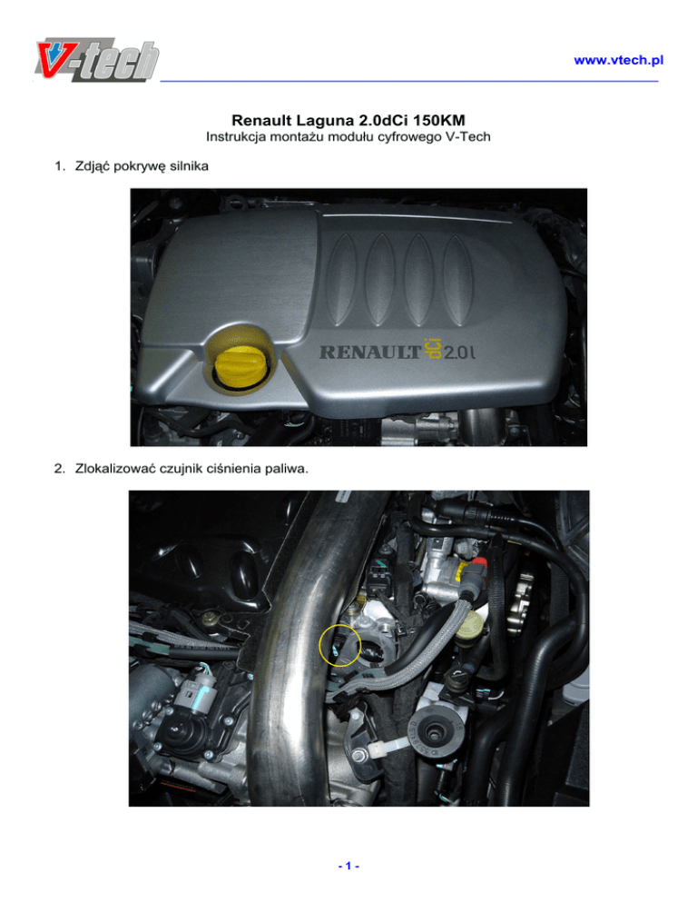 www.vtech.pl ________________________________________________________________________________ Renault Laguna 2.0dCi 150KM Instrukcja montażu modułu cyfrowego V-Tech 1. Zdjąć pokrywę silnika 2. Zlokalizować czujnik ciśnienia paliwa. -1- www.vtech.pl ________________________________________________________________________________ 3. Wypiąć wtyczkę z czujnika ciśnienia paliwa -2- www.vtech.pl ________________________________________________________________________________ 4. Pomiędzy wypiętą wtyczkę i czujnik ciśnienia paliwa wpiąć adapter modułu. 5. Zamontować moduł w miejscu nie narażonym na działanie wody i wysokiej temperatury. Przymocować wiązkę modułu celem zabezpieczenia jej przed uszkodzeniem przez elementy ruchome silnika. -3-