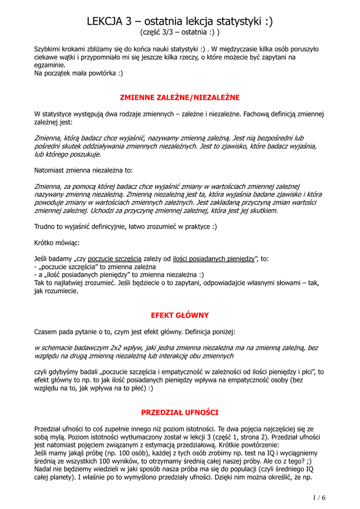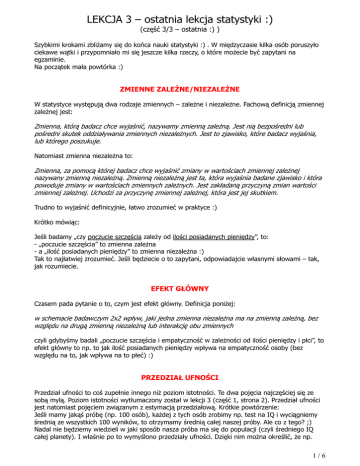 LEKCJA 3 – ostatnia lekcja statystyki :) (część 3/3 – ostatnia :) ) Szybkimi krokami zbliżamy się do końca nauki statystyki :) . W międzyczasie kilka osób poruszyło ciekawe wątki i przypomniało mi się jeszcze kilka rzeczy, o które możecie być zapytani na egzaminie. Na początek mała powtórka :) ZMIENNE ZALEŻNE/NIEZALEŻNE W statystyce występują dwa rodzaje zmiennych – zależne i niezależne. Fachową definicją zmiennej zależnej jest: Zmienna, którą badacz chce wyjaśnić, nazywamy zmienną zależną. Jest nią bezpośredni lub pośredni skutek oddziaływania zmiennych niezależnych. Jest to zjawisko, które badacz wyjaśnia, lub którego poszukuje. Natomiast zmienna niezależna to: Zmienna, za pomocą której badacz chce wyjaśnić zmiany w wartościach zmiennej zależnej nazywany zmienną niezależną. Zmienną niezależną jest ta, która wyjaśnia badane zjawisko i która powoduje zmiany w wartościach zmiennych zależnych. Jest zakładaną przyczyną zmian wartości zmiennej zależnej. Uchodzi za przyczynę zmiennej zależnej, która jest jej skutkiem. Trudno to wyjaśnić definicyjnie, łatwo zrozumieć w praktyce :) Krótko mówiąc: Jeśli badamy „czy poczucie szczęścia zależy od ilości posiadanych pieniędzy”, to: - „poczucie szczęścia” to zmienna zależna - a „ilość posiadanych pieniędzy” to zmienna niezależna :) Tak to najłatwiej zrozumieć. Jeśli będziecie o to zapytani, odpowiadajcie własnymi słowami – tak, jak rozumiecie. EFEKT GŁÓWNY Czasem pada pytanie o to, czym jest efekt główny. Definicja poniżej: w schemacie badawczym 2x2 wpływ, jaki jedna zmienna niezależna ma na zmienną zależną, bez względu na drugą zmienną niezależną lub interakcję obu zmiennych czyli gdybyśmy badali „poczucie szczęścia i empatyczność w zależności od ilości pieniędzy i płci”, to efekt główny to np. to jak ilość posiadanych pieniędzy wpływa na empatyczność osoby (bez względu na to, jak wpływa na to płeć) :) PRZEDZIAŁ UFNOŚCI Przedział ufności to coś zupełnie innego niż poziom istotności. Te dwa pojęcia najczęściej się ze sobą mylą. Poziom istotności wytłumaczony został w lekcji 3 (część 1, strona 2). Przedział ufności jest natomiast pojęciem związanym z estymacją przedziałową. Krótkie powtórzenie: Jeśli mamy jakąś próbę (np. 100 osób), każdej z tych osób zrobimy np. test na IQ i wyciągniemy średnią ze wszystkich 100 wyników, to otrzymamy średnią całej naszej próby. Ale co z tego? ;) Nadal nie będziemy wiedzieli w jaki sposób nasza próba ma się do populacji (czyli średniego IQ całej planety). I właśnie po to wymyślono przedziały ufności. Dzięki nim można określić, że np. 1/6 „z 95% dokładnością, średnia populacji znajduje się pomiędzy IQ=98,34 a IQ=101,66”. Oczywiście możemy zakładać różne przedziały, pojawia się jednak wówczas zjawisko, które warto zapamiętać: - im przedział ma większą dokładność (im bliżej 100%), tym będzie szerszy Jest to logiczne, bo jeśli chcemy znać średnią z dokładnością 99,99% to będziemy mieli szerszą „ramkę” w której ta średnia może być (np. gdzieś pomiędzy 85 a 115). Przy założeniu tak wyśrubowanej dokładności mamy 0,01% szansy na to, że średniej tam jednak nie będzie. Gdy zakładamy dokładność równą 90%, to przedział może być węższy np. <98; 102> ale za to już jest 10% szansy na to, że średnia jednak umknie poza przedział ;) I to tak z grubsza tyle :) Przedziały ufności wyznaczamy wzorem: μ ∈ < X – z * Sx ; X + z * Sx > lub: X – z * Sx ≤ μ ≤ X + z * Sx Ten wzór oznacza to samo, tylko jest inaczej zapisany. Można z niego wywnioskować to, że przedział ufności jest symetrycznie ułożony po obu stronach średniej :) z, którego używamy w tym wzorze odpowiada za dokładność, którą chcemy uzyskać: z= 1 1,44 1,64 1,96 2,58 → → → → → dokładność 68% dokładność 85% dokładność 90% dokładność 95% dokładność 99% (dobrze jest się tego nauczyć na pamięć – procenty biorą się z odchyleń standardowych od średniej – uproszczony wykres tego był w lekcji 1 na stronie 7). Sx to błąd standardowy (wzór jest w lekcji 2 na stronie 10) X to średnia z naszej próby STANDARYZACJA Na wszelki wypadek dobrze jest wiedzieć, czym jest standaryzacja :) . Aby to zrozumieć wyobraźmy sobie taką historyjkę: Jesteśmy znanymi naukowcami i bierzemy udział w międzygalaktycznej konferencji dla psychologów. Właśnie występuje znany prelegent i opowiada historię swojego niezwykłego pacjenta (możesz wymyślić ją jak chcesz ;) ). Na zakończenie mówi o wyniku testu IQ, który osiągnął tenże pacjent – 140. Wszyscy biją brawo. Każdy wie, gdzie w populacji go to plasuje. Teraz nadchodzi nasza kolej – po super atrakcyjnym zaprezentowaniu historii przypadku przed międzygalaktycznym audytorium, nadchodzi czas na podsumowanie. I mówimy wszystkim, że w naszym własnym teście empatyczności EA-x1 pacjent otrzymał wynik 67,84. Nikt nie wie co to oznacza, ani czy to dobrze, czy źle ;) . Mówimy dalej – w tym teście średnia wynosi 58,16 a odchylenie standardowe 6,79. Nadal nikt nie wie o co chodzi. Zanim ktoś policzy ile odchyleń standardowych od średniej jest nasz pacjent, miną wieki. Tutaj z ratunkiem przychodzi standaryzacja. Standaryzacja to metoda polegająca na zamianie surowych wyników (IQ= 115, EA-x1=71,74 itp.) na ilość odchyleń standardowych od średniej (z=1, z=2...). Dzięki temu, po przeliczeniu nasz zagmatwany wynik będzie zrozumiały dla każdego 2/6 („pacjent ma empatyczność w trzecim odchyleniu standardowym”). Wzór na standaryzację – lekcja 2, strona 10 :) . Znajdź go i przepisz poniżej: z= Jeśli padnie polecenie narysowania rozkładu normalnego wystandaryzowanego, to po prostu rysujemy rozkład normalny: Zero na środku oznacza, że na środku wypada średnia