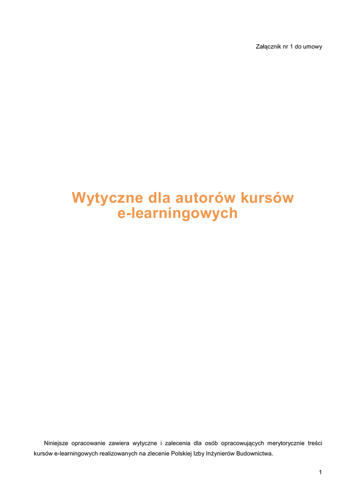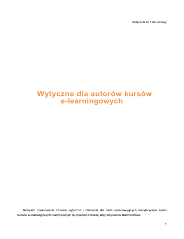 Załącznik nr 1 do umowy Wytyczne dla autorów kursów e-learningowych Niniejsze opracowanie zawiera wytyczne i zalecenia dla osób opracowujących merytorycznie treści kursów e-learningowych realizowanych na zlecenie Polskiej Izby Inżynierów Budownictwa. 1 1. Forma dostarczanych treści kursów • Preferowany format: edytowalna prezentacja *.ppt (MS Power Point) zawierające sugerowane rozmieszczenie treści i materiałów na kolejnych ekranach szkolenia (część teoretyczna + test). • Treść kursów może być również dostarczona w plikach tekstowych w formacie umożliwiającym wydobycie z nich danych przez edytor tekstowy lub inny program (np. *.txt, *.doc, *.pdf, *.ppt). • Mile widziane są dodatkowe materiały dydaktyczne w postaci dodatkowych plików (p. 4). • Materiały powinny być sprawdzone pod kątem merytoryki, ortografii i interpunkcji • W przypadku dodatkowych uwag (np. scenariusz szkolenia lub opis interakcji) należy je wyraźnie oddzielać (np. wyróżniać je innym kolorem). • Fragmenty tekstów szkolenia, które ma czytać lektor, należy oznaczać innym kolorem (np. żółtym). • Należy pamiętać by dostarczane treści pozostawały w zgodności z prawem autorskim. W kursach e-learningowych nie wolno korzystać z treści innych autorów bez ich zgody lub podania referencji. 2. Układ treści szkoleniowych Układ treści powinien być jasny i przejrzysty: • Złożone jednostki tematyczne mogą zostać podzielone na moduły, • Slajdy nie powinny być przeładowane treścią - warto stosować wewnętrzne linki (do słowniczka, materiałów w *.pdf, filmów, animacji, dźwięków), • Na każdym tekstowym slajdzie poza tekstem powinna znajdować się jakaś grafika, animacja lub film powiązane lub kojarzące się z fragmentem treści znajdującym się na tym slajdzie, • Należy unikać długich, pełnych zdań(zalecane są równoważniki zdań, hasła, wypunktowania, rozwinięcia wyświetlane po kliknięciu na dany element, wewnętrzne linki: do słowniczka, materiałów w *.pdf, dźwięków, animacji, filmów), 4. Dodatkowe materiały dydaktyczne P r z y g o t o w u j ą c t r e ś ć k u r s u e - l e a r n i n g o w e g o , w a r t o p a m i ę t a ć o p r z yg o t o w a n i u n a s t ę p u j ą c yc h d o d a t k o w yc h m a t e r i a ł ó w dydaktycznych: • teksty uzupełniające w postaci plików do ściągnięcia (pliki w formacie: *.txt, *.doc, *.pdf, *.ppt, *.xls, *.jpg, *.gif, *.bmp, *.png, itp.), • fotografie*** (pliki w formacie: *.jpg, *.gif, *.bmp, *.png), • rysunki*** (plany, mapy, wykresy, tabele, diagramy) (pliki w formacie: *.jpg, *.gif, *.bmp, *.png), • animacje i gry we Flash-u (pliki w formacie: *.flv, *.swf), • słownik terminów, • nagrania audio (pliki w formacie: *.mp3, *.wma, *.wav), • nagrania video (pliki w formacie: *.flv, *.avi, *.mpg, *.wmv, *.mov, *.mp4), • linki zewnętrzne (prowadzące do treści w sieci Internet), • bibliografia. 5. Zalecana liczba ekranów szkoleniowych • teoria i test sprawdzający wiedzę(łącznie): od 120 do 150 ekranów szkoleniowych 6. Zalecana ilość pytań sprawdzających wiedzę • do 12 pytań losowanych z bazy 24 pytań 7. Dostępne formaty pytań sprawdzających wiedzę Aktualnie dostępne są następujące formaty ćwiczeniowe: • prawda/fałsz, • pytania wielokrotnego wyboru, • krótkie odpowiedzi, • dopasowywanie, • przeciągnij i upuść, 2 • • • 8. wypełnianie luk, krzyżówki, diagramy. Przykładowa struktura kursu • • • • • • • • • • • Ekran tytułowy (1 ekran), Spis treści (1 ekran), Określenie wymogów i umiejętności niezbędnych do opanowania materiału („Przed rozpoczęciem nauki powinieneś...") (1 ekran), Cele dydaktyczne szkolenia (określenie, czego nauczy się użytkownik) (1 ekran), Część teoretyczna (liczba ekranów w zależności od rozmiarów szkolenia): o Temat 1. ■ Sekcja 1.1. ■ Sekcja 1.2. ♦ ćwiczenie śródlekcyjne sprawdzające wiedzę i pozwalające osobom szkolonym kontrolować stopień opanowania materiału ■ Sekcja 1.3. ■ o Temat 2. ■ Sekcja 2.1 ♦ ćwiczenie śródlekcyjne sprawdzające wiedzę i pozwalające osobom szkolonym kontrolować stopień opanowania materiału ■ Sekcja 2.2. ■ Sekcja 2.3. Zakończenie (co użytkownik powinien wiedzieć po odbyciu szkolenia przed rozpoczęciem testu) (1 ekran), Wstęp do testu (informacje o mającym za chwilę rozpocząć się teście sprawdzającym wiedzę) (1 ekran), Test (liczba ekranów zależy od liczby pytań, jednak liczba pytań nie powinna przekraczać 25), Informacja o zakończonym teście (1 ekran), Bibliografia (spis literatury do której odniesienia znajdują się w danym szkoleniu) (1 ekran), Materiały dodatkowe (ewentualne materiały dodatkowe do pobrania przez zainteresowanych użytkowników). 3 Słowniczek pojęć Adobe Acrobat Reader - program pozwalający oglądać pliki zapisane w formacie pdf, Ć w i c z e n i e ś r ó d l e k c y j n e - ć w i c z e n i e s p r a w d z a j ą c e w i e d z ę i pozwalające osobom szkolonym kontrolować stopień opanowania materiału; umieszczane jest w części teoretycznej między wybranymi slajdami z teorią, Czat - narzędzie pozwalające użytkownikom platformy wymieniać komunikaty tekstowe w czasie rzeczywistym, doc - format plików pozwalający przenosić treść, zdjęcia, obrazki, używany przez edytor tekstowy np. MS Word, Open Office Writer, Edytor tekstowy - aplikacja pozwalająca użytkownikowi edytować pliki tekstowe, np. MS Word, Ekran - jeden slajd szkolenia (tekst + wszelkie pomoce dydaktyczne znajdujące się na nim) wyświetlany w przeglądarce, Flash - technologia tworzenia animacji do kursów z wykorzystaniem grafiki wektorowej, Forum - forma grup dyskusyjnych przeniesiona na stronę WWW, pozwalająca użytkownikom szkolenia na wymianę informacji, opinii, itp. na dany temat, Foxit - program pozwalający oglądać pliki zapisane w formaci