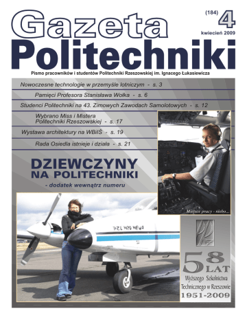 Gazeta (184) 4 kwiecieñ 2009 Politechniki Pismo pracowników i studentów Politechniki Rzeszowskiej im. Ignacego £ukasiewicza Nowoczesne technologie w przemyœle lotniczym - s. 3 Pamiêci Profesora Stanis³awa Wo³ka - s. 6 Studenci Politechniki na 43. Zimowych Zawodach Samolotowych - s. 12 Wybrano Miss i Mistera Politechniki Rzeszowskiej - s. 17 Wystawa architektury na WBiIŒ - s. 19 Rada Osiedla istnieje i dzia³a - s. 21 DZIEWCZYNY NA POLITECHNIKI - dodatek wewn¹trz numeru Miejsce pracy - niebo... 5 8 lat Wy¿szego Szkolnictwa Technicznego w Rzeszowie 1951-2009 2 GAZETA POLITECHNIKI WYSTAWA ARCHITEKTURY 23-24 lutego 2009 r. vide str. 19-20 Kompozycja architektoniczna - Tomasz Bachórz. Panel dyskusyjny. Kompozycja architektoniczna - Dominika Chudy. Kompozycja architektoniczna - Joanna Figurska. Kompozycja architektoniczna - Ma³gorzata Kawalec. Jaœmina Wanat z prac¹ pt. Futura. Ekspozycja modeli i rysunków odrêcznych. Wystawa prac na VI p. bud. P. , Nr 4(184)–KWIECIEN 2009 3 Od Redakcji: Po raz pierwszy w Politechnice Rzeszowskiej organizowany jest 23 kwietnia 2009 r. Dzieñ Otwarty pod nazw¹ "DZIEWCZYNY NA POLITECHNIKI". Akcjê, której kontynuacjê podjê³y w bie¿¹cym roku akademickim liczne uczelnie techniczne, rozpoczê³a wiosn¹ 2008 r. Politechnika Warszawska wspólnie z miesiêcznikiem edukacyjnym "Perspektywy". Tegoroczna akcja odbywa siê pod patronatem Konferencji Rektorów Polskich Uczelni Technicznych. Dzieñ Otwarty 23 kwietnia 2009 r. to szczególny rodzaj zachêcenia dziewcz¹t – g³ównie tegorocznych maturzystek – do studiowania w jedynej na Podkarpaciu uczelni technicznej. Politechnika Rzeszowska jest uczelni¹, w której na szeœciu wydzia³ach studjuj¹ dziewczyny nie tylko z naszego regionu, ale i z ca³ej Polski – m.in. za spraw¹ kszta³cenia pilotów lotnictwa cywilnego. Niemniej na ka¿dym z wydzia³ów studiuj¹ dziewczêta, które nie boj¹ siê studiów technicznych, radz¹ sobie doskonale i chwal¹ zarówno wybór kierunku studiów, jak i nade wszystko wybór uczelni. O tym, ¿e dobrym in¿ynierem mo¿e byæ nie tylko mê¿czyzna, przekonujemy na dalszych stronach GP. Niniejsze wydanie zawiera dodatek adresowany g³ównie do kandydatek na studia w Politechnice Rzeszowskiej w roku akademickim 2009/2010. Wierzê w to, ¿e zawarta w nim oferta pomo¿e wielu Paniom w wyborze studiów technicznych w³aœnie w naszej uczelni, do czego szczerze zachêcam. Marta Olejnik Redaktor Naczelny Nowoczesne technologie w przemyœle lotniczym I Konferencja Inauguracyjna Projektu Kluczowego W dniach 10-11 lutego 2009 r. odby³a siê w naszej uczelni konferencja inauguruj¹ca realizacjê prac badawczych objêtych Projektem Kluczowym pt. "Nowoczesne technologie materia³owe stosowane w przemyœle lotniczym". Konferencja dotyczy³a Programu Operacyjnego "Innowacyjna Gospodarka" - Priorytet 1. Badania i rozwój nowoczesnych technologii, Dzia³anie 1.1. Wsparcie badañ naukowych dla budowy gospodarki opartej na wiedzy, Poddzia³anie 1.1.2. Strategiczne programy badañ naukowych i prac rozwojowych. Organizatorzy konferencji to: Politechnika Rzeszowska jako koordynator i Centrum Zaawansowanych Technologii "AERONET - Dolina Lotnicza". Wœród uczestników znaleŸli siê przed- stawiciele uczelni wy¿szych, m.in. z politechnik: Lubelskiej, Warszawskiej, £ódzkiej, Czêstochowskiej, Œl¹skiej, a tak¿e IPPT PAN Warszawa, Instytutu Lotnictwa w Warszawie, Instytutu Maszyn Przep³ywowych PAN Gdañsk. Obecni byli równie¿ przedstawiciele wielu przedsiêbiorstw zrzeszonych z SGPPL Dolina Lotnicza, takich jak: WSK "PZL-Rzeszów", PZL Œwidnik, PW Kalisz, Ultratech, Hispano-Suiza Polska, AVIO Polska, PZL Mielec, CEREL Boguchwa³a, VAC AERO, firma Margañski & Mys³owski, MTU Aero Engines Polska. Ich aktywny udzia³ w dyskusji nad zadaniami badawczymi projektu pozwoli³ na uszczegó³owienie programu badañ s³u¿¹cego rozwojowi przemys³u lotniczego w Polsce. Prorektor ds. rozwoju - prof. M. Orkisz podczas prezentowania Rady Konsorcjum Projektowego. Fot. M. Kwoka 4 GAZETA POLITECHNIKI Otwarcia konferencji dokona³ prorektor ds. nauki prof. PRz Jacek Kluska, po czym prezes Stowarzyszenia Dolina Lotnicza Marek Darecki przedstawi³ aktualne problemy przemys³u lotniczego, wskazuj¹c na potrzebê wprowadzania nowoczesnych technik wytwarzania w przemyœle lotniczym i modernizacji bazy naukowej. Poruszanym zagadnieniem by³a te¿ wspó³praca wi³a dr hab. in¿. Romana Œliwa, prof. PRz - kierownik Projektu, prezentuj¹c jednoczeœnie liderów merytorycznych g³ównych zadañ badawczych. Wœród nich znaleŸli siê nie tylko przedstawiciele Politechniki Rzeszowskiej, ale tak¿e profesorowie z innych uczelni technicznych. Podczas konferencji zostali wybrani cz³onkowie Rady Wspó³pracy Nauka-Gospodarka. Prof. PRz Romana Œliwa referuje g³ówne za³o¿enia Projektu Kluczowego. Fot. M. Kwoka uczelni technicznych z partnerami przemys³owymi w zakresie badañ naukowych oraz edukacji. Komitet Steruj¹cy ww. projektu przedstawi³ prof. Marek Orkisz, a g³ówne za³o¿enia omó- Konferencjê poœwiêcono zagadnieniom z obszaru nowoczesnych technologii materia³owych stosowanych w przemyœle lotniczym. Liderzy merytoryczni w swoich wyst¹pieniach przedstawili planowane zadania badawcze i sposoby ich realizacji w piêcioletnim okresie trwania projektu. Maj¹ one na celu poprawê konkurencyjnoœci gospodarki regionu poprzez podnoszenie poziomu innowacyjnoœci, a tym samym zwiêkszenie mo¿liwoœci transferu nowoczesnych technologii do przedsiêbiorstw zwi¹zanych z lotnictwem. Zadania badawcze dotycz¹ konkretnych zagadnieñ materia³owych, a nowo opracowane technologie znajd¹ zastosowanie w lotnictwie. Drugi dzieñ konferencji przebiega³ pod znakiem dyskusji dotycz¹cych poszczególnych planów zadañ badawczych. Burzliwe rozmowy przedstawicieli uczelni technicznych i przemys³u lotniczego umo¿liwi³y sformu³owanie oraz weryfikacjê podzadañ w ka¿dej grupie badawczej. Jedno z