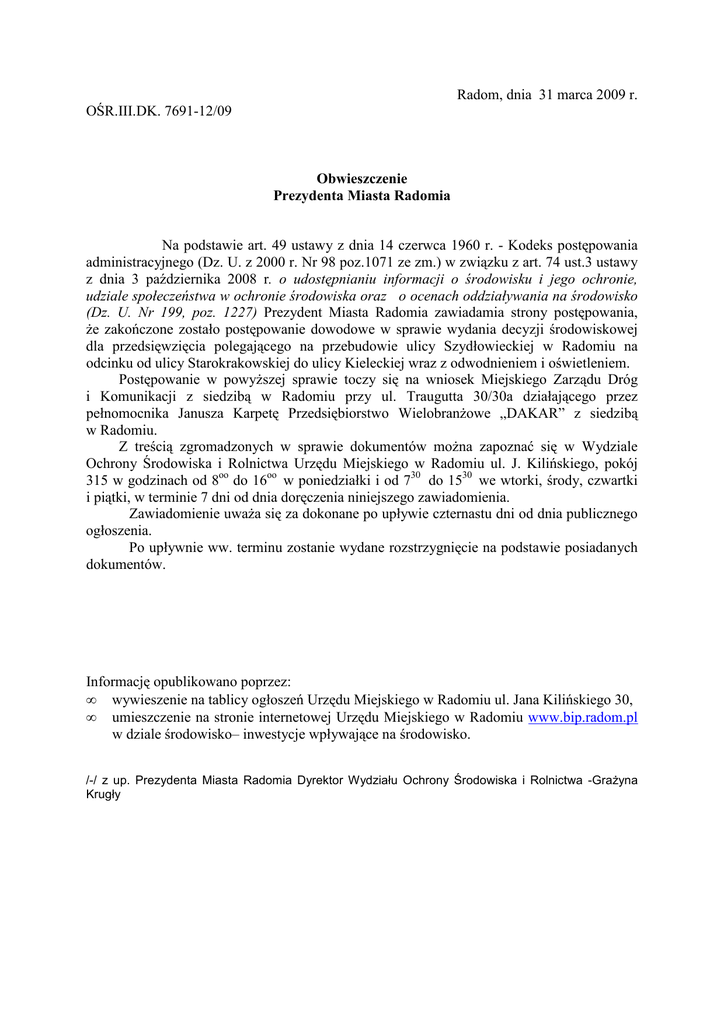 Radom, dnia 31 marca 2009 r. OŚR.III.DK. 7691-12/09 Obwieszczenie Prezydenta Miasta Radomia Na podstawie art. 49 ustawy z dnia 14 czerwca 1960 r. - Kodeks postępowania administracyjnego (Dz. U. z 2000 r. Nr 98 poz.1071 ze zm.) w związku z art. 74 ust.3 ustawy z dnia 3 października 2008 r. o udostępnianiu informacji o środowisku i jego ochronie, udziale społeczeństwa w ochronie środowiska oraz o ocenach oddziaływania na środowisko (Dz. U. Nr 199, poz. 1227) Prezydent Miasta Radomia zawiadamia strony postępowania, Ŝe zakończone zostało postępowanie dowodowe w sprawie wydania decyzji środowiskowej dla przedsięwzięcia polegającego na przebudowie ulicy Szydłowieckiej w Radomiu na odcinku od ulicy Starokrakowskiej do ulicy Kieleckiej wraz z odwodnieniem i oświetleniem. Postępowanie w powyŜszej sprawie toczy się na wniosek Miejskiego Zarządu Dróg i Komunikacji z siedzibą w Radomiu przy ul. Traugutta 30/30a działającego przez pełnomocnika Janusza Karpetę Przedsiębiorstwo WielobranŜowe „DAKAR” z siedzibą w Radomiu. Z treścią zgromadzonych w sprawie dokumentów moŜna zapoznać się w Wydziale Ochrony Środowiska i Rolnictwa Urzędu Miejskiego w Radomiu ul. J. Kilińskiego, pokój 315 w godzinach od 8oo do 16oo w poniedziałki i od 730 do 1530 we wtorki, środy, czwartki i piątki, w terminie 7 dni od dnia doręczenia niniejszego zawiadomienia. Zawiadomienie uwaŜa się za dokonane po upływie czternastu dni od dnia publicznego ogłoszenia. Po upływnie ww. terminu zostanie wydane rozstrzygnięcie na podstawie posiadanych dokumentów. Informację opublikowano poprzez: • wywieszenie na tablicy ogłoszeń Urzędu Miejskiego w Radomiu ul. Jana Kilińskiego 30, • umieszczenie na stronie internetowej Urzędu Miejskiego w Radomiu www.bip.radom.pl w dziale środowisko– inwestycje wpływające na środowisko. /-/ z up. Prezydenta Miasta Radomia Dyrektor Wydziału Ochrony Środowiska i Rolnictwa -GraŜyna Krugły