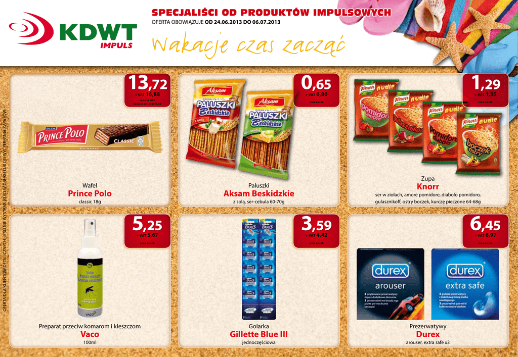 specjaliści od produktów impulsowych OFERTA OBOWIĄZUJE OD 24.06.2013 DO 06.07.2013 Wakacje czas zacząć 13,72 0,65 1,29 cena za DSP cena za szt. 0,49/0,60 cena za szt. cena za szt. OFERTA DLA KLIENTÓW DETALICZNYCH, JEŚLI NIE WYSTĄPIŁ BŁĄD W DRUKU LUB DO WYCZERPANIA ZAPASÓW. + VAT 16,88 Wafel + VAT 1,35 Zupa Knorr Aksam Beskidzkie classic 18g ser w ziołach, amore pomidore, diabolo pomidoro, gulasznikoff, ostry boczek, kurczę pieczone 64-68g z solą, ser-cebula 60-70g 5,25 3,59 6,45 cena za szt. cena za szt. cena za szt. + VAT Preparat przeciw komarom i kleszczom 100ml 0,80 Paluszki Prince Polo Vaco + VAT 5,67 + VAT 4,42 + VAT Golarka Prezerwatywy jednoczęściowa arouser, extra safe x3 Gillette Blue Iii Durex 6,97 specjaliści od produktów impulsowych OFERTA OBOWIĄZUJE OD 24.06.2013 DO 06.07.2013 Wakacje czas zacząć 1,29 1,59 20,99 cena za szt. cena za szt. cena za DSP cena za szt. 0,84/0,88 OFERTA DLA KLIENTÓW DETALICZNYCH, JEŚLI NIE WYSTĄPIŁ BŁĄD W DRUKU LUB DO WYCZERPANIA ZAPASÓW. + VAT 1,35 + VAT 1,67 + VAT 22,04 Napój Kubuś Play Napój marchew-truskawka-limetka, marchew-malina-limetka, marchew-czereśnia-limetka, marchew-czerwona pomarańcza-limetka, multiwitamina, arbuz 0,4l Roko green, black, orange 0,4l 1,25 + VAT 1,54 k n o wO Ś Ć w dw t Scooby Doo 3 smaki 0,2l x25 1,22 1,25 cena za szt. cena za szt. + VAT cena za szt. Sok 1,50 + VAT Dostępne tylko w Napój gazowany Hoop Cola 0,5l Napój izotoniczny Napój energetyczny blueberry, lemon 0,5l 250ml V-Max Sport Las Vegas 1,54