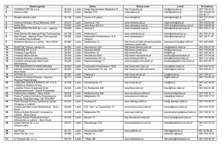 Lp. 1. 2. Nazwa agencji "CONSULTOR" Sp. z o.o. Adecco Lublin 20-325 20-011 Lublin Lublin Adres Droga Męczenników Majdanka 74 Sądowa 2/10 Strona www http://consultor.pl/ www.adecco.pl e-mail [email protected] [email protected] 3. Straight oddział Lublin 20-126 Lublin Unicka 4 (II piętro) www.straight.pl [email protected] 4. 5. 6. Centrum Edukacji i Pracy Młodzieży OHP Active Plus MANPOWER POLSKA Sp. z o.o. - Agencja Lublin Work Service SA Agencja Pracy Tymczasowej Start People - Agencja Pracy Tymczasowej i Doradztwa Personalnego Akademia Rolnicza w Lublinie – Biuro Karier 20-015 20-632 20-008 Lublin Lublin Lublin Graniczna 13/3 Jana Sawy 8/012 A Hempla 5 www.lubelska.ohp.pl www.activeplus.com.pl www.manpower.waw.pl [email protected] [email protected] [email protected] Nr telefonu 081/ 745 41 91 081/ 534 85 16, 534 85 17 081/ 747 35 00 w.177 081/ 532 62 56 081/ 528 08 58 081/ 532 41 44 20-109 20-002 Lublin Lublin www.workservice.pl www.startpeople.pl [email protected] [email protected] 081/ 533 21 25 081 749 71 77 20-950 Lublin Królewska 3 Krakowskie Przedmieście 13/ 8 (IIpiętro) Akademicka 13 [email protected] 081/ 445 6605 ELEKTUS Tadeusz Jakubczyk EVIDENCE SP. Z O.O. Fundacja Fuga Mundi Fundacja Nasza Szkoła Fundacja Rozwoju Lubelszczyzny Fundacja Uniwersytetu Marii CurieSkłodowskiej ITEM MAŁGORZATA MARCZEWSKA Katolicki Uniwersytet Lubelski Jana Pawła II – Biuro Karier LECHAA Sp. z o.o. Lubelska Fundacja Rozwoju - Agencja Rozwoju Regionalnego LUBELSKA SZKOŁA BIZNESU SP. Z O.O. FUNDACJI ROZWOJU KUL Lubelskie Forum Organizacji Osób Niepełnosprawnych - Sejmik Wojewódzki Politechnika Lubelska – Biuro Karier Polska Fundacja Ośrodków Wspomagania Rozwoju Gospodarczego "OIC POLAND" Polski Komitet Pomocy Społecznej Zarząd Okręgowy w Lublinie Uniwersytet Marii Curie-Skłodowskiej – Biuro Karier Wyższa Szkoła Ekonomii i Innowacji w Lublinie – Biuro Karier Wyższa Szkoła Przedsiębiorczości i Administracji w Lublinie – Biuro Karier Leader Service Sp. z o.o. Oddział Lublin 20-004 20-074 20-007 20-016 20-094 20-036 Lublin Lublin Lublin Lublin Lublin Lublin Narutowicza 18/3 Spokojna 8A/20 Peowiaków 12 Narutowicza 59/3 Lubartowska 74A, I p. Radziszewskiego 11 http://www.ar.lublin.pl/miedzywydzial owe/biuro_karier.html http://www.elektus.lublin.pl/ http://www.evidence.pl http://www.ffm.pl/ http://www.naszaszkola.pl/ www.fundacja.lublin.pl www.fundacja.umcs.lublin.pl [email protected] [email protected] [email protected] [email protected] [email protected] [email protected] 081/ 534 21 081/ 743 80 081/ 534 26 081/ 747 94 081/ 710 19 081/ 537 58 20-002 20-950 Lublin Lublin Krakowskie Przedmieście 19/25 Al. Racławickie 14, pok. 131. http://www.item.lublin.pl/ http://www.kul.lublin.pl/kariera/ [email protected] [email protected] 081/ 534 33 67 081/ 445 43 71 20-207 20-111 Lublin Lublin Fiołkowa 5 Rynek 7 http://www.lechaa.pl/ www.lfr.lublin.pl [email protected] [email protected] 081/ 759 30 11 081/ 743 65 43 20-708 Lublin Konstantynów 1H http://www.lbs.pl/ [email protected] 20-043 Lublin Al. Racławickie 44D www.lfoon.lublin.pl [email protected] 081/ 445 46 60, 68 081/ 532 83 46 20-618 20-209 Lublin Lublin Nadbystrzycka 38D Mełgiewska 7/9 www.biurokarier.pollub.pl www.praca.oic.lublin.pl [email protected] [email protected] 081/ 538 10 11 081/ 749 17 70 20-323 Lublin Puchacza 8 www.alterego.lublin.pl info@ alterego.lublin.pl 081/ 744 89 47 20-045 Lublin D.S. "Ikar", ul. Czwartaków 15 www.kariera.umcs.lublin.pl [email protected] 081/ 533 70 82 20-209 Lublin Mełgiewska 7/9 www.wsei.lublin.pl [email protected] 081/ 749 32 19 20-150 Lublin Bursaki 12 http://biurokarier.wspa.pl/ [email protected] 081/ 740 84 68 20-011 Lublin Piłsudskiego 12/3 www.leaderservice.com.pl [email protected] 081/ 527 25 12, 11 29. 30. Job Finder Dolce Vita Sp. z o.o. 20-141 20-080 Lublin Lublin Porzeczkowa 28/27 Niecała 12 www.jobfinder.pl [email protected] [email protected] 691 35 66 38 081/ 532 15 57 31. In Temporis Sp. z o. o. 20-410 Lublin 1 Maja 16A www.intemporis.eu [email protected] 081/ 532 24 32 7. 8. 9. 10. 11. 12. 13. 14. 15. 16. 17. 18. 19. 20. 21. 22. 23. 24. 25. 26. 27. 28. 50 44 01 08 00 17