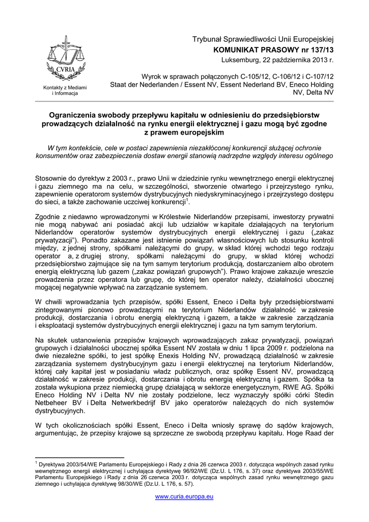 Trybunał Sprawiedliwości Unii Europejskiej KOMUNIKAT PRASOWY nr 137/13 Luksemburg, 22 października 2013 r. Kontakty z Mediami i Informacja Wyrok w sprawach połączonych C-105/12, C-106/12 i C-107/12 Staat der Nederlanden / Essent NV, Essent Nederland BV, Eneco Holding NV, Delta NV Ograniczenia swobody przepływu kapitału w odniesieniu do przedsiębiorstw prowadzących działalność na rynku energii elektrycznej i gazu mogą być zgodne z prawem europejskim W tym kontekście, cele w postaci zapewnienia niezakłóconej konkurencji służącej ochronie konsumentów oraz zabezpieczenia dostaw energii stanowią nadrzędne względy interesu ogólnego Stosownie do dyrektyw z 2003 r., prawo Unii w dziedzinie rynku wewnętrznego energii elektrycznej i gazu ziemnego ma na celu, w szczególności, stworzenie otwartego i przejrzystego rynku, zapewnienie operatorom systemów dystrybucyjnych niedyskryminacyjnego i przejrzystego dostępu do sieci, a także zachowanie uczciwej konkurencji1. Zgodnie z niedawno wprowadzonymi w Królestwie Niderlandów przepisami, inwestorzy prywatni nie mogą nabywać ani posiadać akcji lub udziałów w kapitale działających na terytorium Niderlandów operatorów systemów dystrybucyjnych energii elektrycznej i gazu („zakaz prywatyzacji”). Ponadto zakazane jest istnienie powiązań własnościowych lub stosunku kontroli między, z jednej strony, spółkami należącymi do grupy, w skład której wchodzi tego rodzaju operator a, z drugiej strony, spółkami należącymi do grupy, w skład której wchodzi przedsiębiorstwo zajmujące się na tym samym terytorium produkcją, dostarczaniem albo obrotem energią elektryczną lub gazem („zakaz powiązań grupowych”). Prawo krajowe zakazuje wreszcie prowadzenia przez operatora lub grupę, do której ten operator należy, działalności ubocznej mogącej negatywnie wpływać na zarządzanie systemem. W chwili wprowadzania tych przepisów, spółki Essent, Eneco i Delta były przedsiębiorstwami zintegrowanymi pionowo prowadzącymi na terytorium Niderlandów działalność w zakresie produkcji, dostarczania i obrotu energią elektryczną i gazem, a także w zakresie zarządzania i eksploatacji systemów dystrybucyjnych energii elektrycznej i gazu na tym samym terytorium. Na skutek ustanowienia przepisów krajowych wprowadzających zakaz prywatyzacji, powiązań grupowych i działalności ubocznej spółka Essent NV została w dniu 1 lipca 2009 r. podzielona na dwie niezależne spółki, to jest spółkę Enexis Holding NV, prowadzącą działalność w zakresie zarządzania systemem dystrybucyjnym gazu i energii elektrycznej na terytorium Niderlandów, której cały kapitał jest w posiadaniu władz publicznych, oraz spółkę Essent NV, prowadzącą działalność w zakresie produkcji, dostarczania i obrotu energią elektryczną i gazem. Spółka ta została wykupiona przez niemiecką grupę działającą w sektorze energetycznym, RWE AG. Spółki Eneco Holding NV i Delta NV nie zostały podzielone, lecz wyznaczyły spółki córki Stedin Netbeheer BV i Delta Netwerkbedrijf BV jako operatorów należących do nich systemów dystrybucyjnych. W tych okolicznościach spółki Essent, Eneco i Delta wniosły sprawę do sądów krajowych, argumentując, że przepisy krajowe są sprzeczne ze swobodą przepływu kapitału. Hoge Raad der 1 Dyrektywa 2003/54/WE Parlamentu Europejskiego i Rady z dnia 26 czerwca 2003 r. dotycząca wspólnych zasad rynku wewnętrznego energii elektrycznej i uchylająca dyrektywę 96/92/WE (Dz.U. L 176, s. 37) oraz dyrektywa 2003/55/WE Parlamentu Europejskiego i Rady z dnia 26 czerwca 2003 r. dotycząca wspólnych zasad rynku wewnętrznego gazu ziemnego i uchylająca dyrektywę 98/30/WE (Dz.U. L 176, s. 57). www.curia.europa.eu Nederlanden (sąd najwyższy Królestwa Niderlandów), rozpoznający sprawę w ostatniej instancji, postanowił zwrócić się w tej kwestii do Trybunału Sprawiedliwości. Trybunał stwierdził po pierwsze, że zakaz prywatyzacji, oznaczający w szczególności, iż inwestorzy prywatni nie mogą nabywać akcji ani udziałów w kapitale operatorów systemów dystrybucyjnych energii elektrycznej i gazu działających na terytorium Niderlandów, mieści się w zakresie unormowania art. 345 TFUE, wyrażającym zasadę neutralności traktatów względem zasad prawa własności w państwach członkowskich, z którego wynika między innymi, że państwa członkowskie mają prawo ustanawiać i zachowywać publiczną własność określonych przedsiębiorstw. Artykuł 345 TFUE nie powoduje jednak wykluczenia zasad prawa własności obowiązujących w państwach członkowskich z zakresu zastosowania podstawowych reguł traktatu FUE, w tym w szczególności zasady niedyskryminacji, swobody działalności gospodarczej i swobody przepływu kapitału. W związku z tym Trybunał stwierdził, że biorąc pod uwagę skutki zakazu prywatyzacji, zakaz ten stanowi ograniczenie swobody przepływu kapitału. Jednakże względy leżące u podstaw wyboru systemu własności przyjętego w prawie krajowym są czynnikami, które można brać pod uwagę jako uzasadnienie ograniczenia swobody przepływu kapitału. Do sądu odsyłającego należy dokonanie odpowiednich ustaleń. W odniesieniu do zakazu powiązań grupowych i zakazu działalności ubocznej Trybunał stwierdził, że stanowią one również ograniczenia swobody przepływu kapitału, które wymagają uzasadnienia. Trybunał uznał w tej kwestii, że cele w postaci zwalczania szeroko pojętego wzajemnego subsydiowania, w tym wymiany strategicznych informacji, zapewnienia przejrzystości na rynku energii elektrycznej i gazu oraz zapobiegania zakłóceniom konkurencji, wskazane w pytaniu sądu odsyłającego, służą zapewnieniu niezakłóconej konkurencji na rynku produkcji, dostawy i obrotu energią elektryczną i gazem. Zwalczanie wzajemnego subsydiowania służy ponadto zagwarantowaniu wystarczającego poziomu inwestycji w systemy d