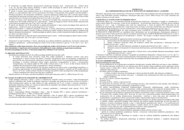 2. 3. 4. 5. 6. 7. Po skierowaniu nie podjął szkolenia ,przygotowania zawodowego dorosłych, stażu , wykonywania prac , których mowa w art. 73a, lub innej formy pomocy określonej w ustawie zasiłek przysługuje po upływie okresu wskazanego w art. 33 ust 4 pkt3./art.75 ust.1 pkt 1a i ust.2 pkt 1 ustawy/ W okresie 6 miesięcy przed zarejestrowaniem się w Powiatowym Urzędzie Pracy rozwiązał stosunek pracy lub stosunek służbowy za wypowiedzeniem albo na mocy porozumienia stron chyba, że porozumienie stron nastąpiło z powodu upadłości , likwidacji pracodawcy lub zmniejszenia zatrudnienia z przyczyn dotyczących zakładu pracy albo z powodu zmiany miejsca zamieszkania lub pracownik rozwiązał umowę o pracę w trybie art. 55 $ 1 /1 KP– zasiłek przysługuje po okresie 90 dni od dnia zarejestrowania się w Powiatowym Urzędzie Pracy (art.75 ust.1 pkt 2 i ust.2 pkt 2). W okresie 6 miesięcy przed zarejestrowaniem się w Powiatowym Urzędzie Pracy spowodował rozwiązanie ze swej winy stosunku pracy lub stosunku służbowego bez wypowiedzenia – zasiłek przysługuje po okresie 180 dni od dnia zarejestrowania się Powiatowym Urzędzie Pracy (art.75 ust.1 pkt.3 i ust.2 pkt 3 ustawy) W okresie nie dłuższym niż 10 dni przebywał za granicą lub pozostawał w innej sytuacji powodującej brak gotowości do podjęcia pracy – zasiłek za ten okres nie przysługuje (art.75 ust.3 ustawy) Otrzymał przewidziane w odrębnych przepisach świadczenie w postaci jednorazowego ekwiwalentu pieniężnego za urlop górniczy, jednorazowej odprawy socjalnej, zasiłkowej, pieniężnej po zasiłku socjalnym, jednorazowej odprawy warunkowej lub odprawy pieniężnej bezwarunkowej – zasiłek przysługuje po upływie okresu, za który otrzymał ekwiwalent lub odprawę (art.75 ust.1 pkt.4 i ust.2 pkt 4 ustawy) Otrzymał odszkodowanie za skrócenie okresu wypowiedzenia umowy o prace – zasiłek przysługuje po upływie okresu za który otrzymał odszkodowanie (art.75 ust.1 pkt.5 i ust.2 pkt 4 ustawy) Zarejestrował się jako bezrobotny w okresie, zgłoszonego do ewidencji działalności gospodarczej, zawieszenia wykonywania działalności gospodarczej – zasiłek przysługuje po okresie 90 dni od dnia rejestracji w pup (art. 75 ust.1 pkt 8 i ust.2 pkt 2 ustawy). Okres pobierania zasiłku ulega skróceniu o okresy nie przysługiwania zasiłku o których mowa w art.75 ust.1-3 jak również o okres zatrudnienia w ramach prac interwencyjnych, robót publicznych, stażu, szkolenia, przygotowania zawodowego dorosłych przypadających na okres, w którym przysługiwał by zasiłek(art.73 ust.4 ustawy). 8. VI. DODATEK AKTYWIZACYJNY Bezrobotnemu posiadającemu prawo do zasiłku przysługuje dodatek aktywizacyjny, jeżeli: 1. W wyniku skierowania przez Powiatowy Urząd Pracy podjął zatrudnienie w niepełnym wymiarze czasu pracy obowiązującym w danym zawodzie lub służbie i otrzymuje wynagrodzenia niższe od minimalnego wynagrodzenia za pracę (nie dot. prac interwencyjnych, publicznych i stanowisk refundowanych). W tym przypadku dodatek aktywizacyjny przysługuje w wysokości stanowiącej różnicę między minimalnym wynagrodzeniem za pracę, a otrzymywanym wynagrodzeniem, nie większej jednak niż 50% zasiłku o którym mowa w art. 72 ust.1, od dnia złożenia wniosku do ostatniego dnia przysługiwania zasiłku, przypadającego w okresie zatrudnienia. 2. Z własnej inicjatywy podjął zatrudnienie lub inną pracę zarobkową (nie dotyczy pracy u poprzedniego pracodawcy i u pracodawcy zagranicznego). W tym przypadku dodatek aktywizacyjny przysługuje w wysokości do 50% zasiłku o którym mowa w art.72 ust.1 od dnia złożenia wniosku do ostatniego dnia połowy okresu przysługiwania zasiłku przypadającego w okresie zatrudnienia lub wykonywania innej pracy zarobkowej. Podstawa prawna: art. 48 ustawy o promocji zatrudnienia i instytucjach rynku pracy (tj Dz.U. z 2008 nr 69 poz.415 i zm). VII. ZASADA WALORYZACJI ZASIŁKÓW DLA BEZROBOTNYCH Zasiłki podlegają waloryzacji z dniem 1 czerwca o średnioroczny wskaźnik wzrostu cen towarów i usług konsumpcyjnych ogółem w poprzednim roku. Zasiłki nie podlegają waloryzacji w przypadku, gdy średnioroczny poziom wzrostu cen towarów i usług konsumpcyjnych ogółem nie uległ zmianie lub uległ zmniejszeniu (art.72 ust. 6 ustawy o promocji zatrudnienia i instytucjach rynku pracy). Przepis ust. 6 stosuje się odpowiednio do stypendiów oraz dodatków aktywizacyjnych (art. 72 ust.7). Wyjaśnienia skrótów użytych w nawiasach Ustawa- ustawa z dnia z 20 kwietnia 2004 o promocji zatrudnienia i instytucjach rynku pracy(tj. Dz.Uz 2008 nr 69poz. 415 i zm.) Rozp..1- rozporządzenie Ministra Gospodarki i Pracy z dnia 26 listopada 2004 w sprawie rejestracji bezrobotnych i poszukujących pracy (Dz. U. z 2004 r. nr 262 poz.2607 i zmiany). Rozp..2 - Rozporządzenie Ministra Pracy i Polityki Społecznej z dnia 18 sierpnia 2009 w sprawie szczegółowego trybu przyznawania zasiłku dla bezrobotnych, stypendium i dodatku aktywizacyjnego Dz. U. z 2009 nr 136, poz.1118 i zmiany). Otrzymałem (am) jeden egzemplarz niniejszej informacji zapoznałem się i zobowiązuję się do przestrzegania: ………………………….………………….….. Imię i nazwisko rejestrowanego ………………….……. Data ……………………..……………….. Data i podpis rejestrowanego ………………………………………… Podpis i pieczątka pracownika PUP INFORMACJA DLA OSÓB REJESTRUJĄCYCH SIĘ W POWIATOWYM URZĘDZIE PRACY w RADOMIU Obowiązki i uprawnienia osoby rejestrowanej w Powiatowym Urzędzie Pracy jako bezrobotnej lub osoby poszukującej pracy określa ustawa z dnia 20.04.2004 o promocji zatrudnienia i instytucjach rynku pracy ( tj.Dz.U 2008 nr 69 poz. 415 z późn. zmianami) oraz przepisy wykonawcze do tejże ustawy. I. REJESTRACJA W POWIATOWYM URZĘDZIE PRACY 1. Bezrobotny zgłasza się, w celu dokonania rejestracji do powiatowego urzędu pra