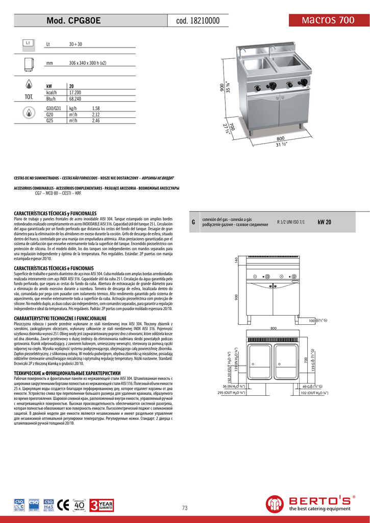 Mod. CPG80E TOT. 30+30 mm 306 x 340 x 300 h (x2) kW kcal/h Btu/h 20 17.200 68.240 G30/G31 G20 G25 kg/h m3/h m3/h 900 35 3⁄8” Lt Macros 700 cod. 18210000 1,58 2,12 2,46 700 ” 27 ½ 800 31 ½” CESTAS DE NO SUMINISTRADOS - CESTAS NÃO FORNECIDOS - KOSZE NIE DOSTARCZONY - КОРЗИНЫ НЕ ВХОДИТ ACCESORIOS COMBINABLES - ACESSÓRIOS COMPLEMENTARES - PASUJĄCE AKCESORIA - ВОЗМОЖНЫЕ АКСЕССУАРЫ CG7 – MCD 80 – CESTI – KRF. CARACTERÍSTICAS TÉCNICAS y FUNCIONALES Plano de trabajo y paneles frontales de acero inoxidable AISI 304. Tanque estampado con amplios bordes redondeados realizado completamente en acero INOXIDABLE AISI 316. Capacidad útil del tanque 25 L. Circulación del agua garantizada por un fondo perforado que distancia los cestos del fondo del tanque. Desagüe de gran diámetro para la eliminación de los almidones en exceso durante la cocción. Grifo de descarga de esfera, situado dentro del hueco, controlado por una manija con empuñadura atérmica. Altas prestaciones garantizadas por el sistema de calefacción que envuelve externamente toda la superficie del tanque. Encendido piezoeléctrico con protección de silicona. En el modelo doble, los dos tanques son independientes con mandos separados para una regulación independiente y óptima de la temperatura. Pies regulables. Estándar: 2P puertas con manija estampada espesor 20/10. conexión del gas -- conexão a gás connessione gas connection podłączenie gazowe - газовое соединение raccordement gaz - Gasanschluß kW 20 16 R 1/2 UNI ISO 7/1 140 G CARACTERÍSTICAS TÉCNICAS e FUNCIONAIS 900 Superfície de trabalho e painéis dianteiros de aço inox AISI 304. Cuba moldada com amplas bordas arredondadas realizada inteiramente com aço INOX AISI 316. Capacidade útil da cuba 25 l. Circulação da água garantida pelo fundo perfurado, que separa as cestas do fundo da cuba. Abertura de extravasação de grande diâmetro para a eliminação do amido excessivo durante a cozedura. Torneira de descarga de esfera, localizada dentro do vão, comandada por pega com puxador com isolamento térmico. Alto rendimento garantido pelo sistema de aquecimento, que envolve externamente toda a superfície da cuba. Activação piezoeléctrica com protecção de silicone. No modelo duplo, as duas cubas são independentes, com comandos separados, para garantir a regulação independente e ideal da temperatura. Pés reguláveis. Padrão: 2P portas com puxador moldado espessura 20/10. CHARAKTERYSTYKI TECHNICZNE I FUNKCJONALNE 100 (½” G) Płaszczyzna robocza i panele przednie wykonane ze stali nierdzewnej inox AISI 304. Tłoczony zbiornik z szerokimi, zaokrąglonymi obrzeżami, wykonany całkowicie ze stali nierdzewnej INOX AISI 316. Pojemność użytkowa zbiornika wynosi 25 l. Obieg wody jest zagwarantowany poprzez dno z otworami, ktόre oddziela kosze od dna zbiornika. Zawόr przelewowy o dużej średnicy do eliminowania nadmiaru skrobi powstałych podczas gotowania. Kranik odprowadzający, z zaworem kulowym, umieszczony wewnątrz, sterowany za pomocą rączki odpornej na ciepło. Wysoka wydajność systemu podgrzewającego, obejmującego całą powierzchnię zbiornika. Zapłon piezoelektryczny, z silikonową osłoną. W modelu podwόjnym, obydwa zbiorniki są niezależne, posiadają oddzielne sterowanie umożliwiające niezależną i optymalną regulację temperatury. Nόżki nastawne. Standard: Drzwiczki 2P z tłoczoną klamką o grubości 20/10. Рабочая поверхность и фронтальные панели из нержавеющей стали AISI 304. Штампованная емкость с широкими закругленными бортами полностью из нержавеющей стали AISI 316. Полезный объем емкости 25 л. Циркуляция воды создается благодаря перфорированному дну, которое отдаляет корзины от дна емкости. Устройство слива при переполнении большого размера для удаления крахмала, образуемого во время приготовления. Шаровой сливной кран, расположенный внутри емкости, управляемый ручкой с ненагревающейся поверхностью. Высокая производительность обеспечивается системой разогрева, которая полностью обволакивает всю поверхность емкости. Пьезоэлектрический поджиг с силиконовой защитой. В двойной модели две емкости являются независимыми и имеют раздельное управление для независимой оптимальной регулировки температуры. Регулируемые ножки. Стандарт: 2 дверца с штампованной ручкой толщиной 20/10. 36 (IN H2O ¾”) 295 (OUT H2O ¾”) 73 (½” G) 700 139 G ТЕХНИЧЕСКИЕ и ФУНКЦИОНАЛЬНЫЕ ХАРАКТЕРИСТИКИ 139 (IN H2O ¾”) 192.30 (OUT H2O ¾”) 800 49 G (½” G) 102 (OUT H2O ¾”)