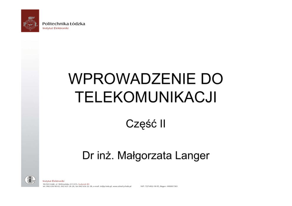 WPROWADZENIE DO TELEKOMUNIKACJI Część II Dr inż. Małgorzata Langer Transmisja bezprzewodowa • • • • • Emisje sygnałów radiowych i telewizyjnych Telewizja satelitarna Telefonia komórkowa Układy lokalizacji Systemy oparte na technice laserowej lub podczerwieni (najczęściej wymagają widoczności optycznej) Fale elektromagnetyczne • Zaburzenie pola elektromagnetycznego rozchodzące się w przestrzeni ze skończoną prędkością. Są to fale poprzeczne - w każdym punkcie pola wektor natężenia pola elektrycznego E i wektor indukcji magnetycznej B są prostopadłe do kierunku rozchodzenia się fal elektromagnetycznych i do siebie, a ich prędkość rozchodzenia się w próżni c≈3·10⁸m/s. Właściwości, warunki powstawania i rozprzestrzeniania się fal elektromagnetycznych opisują równania falowe wynikające z równań Maxwella • Równania Maxwella: w przestrzeni nie zawierającej ładunków (w próżni) 2 ∂ ∂ ∇ 2 E = − µ ∆ H = µε 2 E ∂t ∂t 2 ∂ 2 ∇ H = µε 2 H ∂t gdzie – H - natężenie pola magnetycznego, – E - natężenie pola elektrycznego Fala rozchodzi się z prędkością: 1 µε Interpretacja fizyczna I równania Interpretacja fizyczna II równania Polaryzacja elektryczna i magnetyczna • W środowisku nieprzewodzącym natężenie pola elektrycznego pochodzącego od ładunku punktowego jest εr razy mniejsze niż w próżni. W momencie pojawienia się pola zewnętrznego dielektryk polaryzuje się a jego stopień polaryzacji opisuje wektor polaryzacji Pe = ε 0 χ e E Gdzie χe jest podatnością elektryczną dielektryka Przenikalność elektryczna • W przypadku pól szybkozmiennych ma charakter zespolony: ε = ε’ - jε’’ • Część urojona „odpowiada” za straty cieplne • Wektorowe prawo Ohma: J =σ E Wzór na powierzchniową gęstość prądu przewodzenia; σ - konduktywność materiału Wypadkowa konduktywność efektywna ośrodka ωε’’+σ Tangens kąta stratności ωε ' '+σ tgδ = ωε ' Dla małych częstotliwości: tgδ~σ/ωε’ Podatność magnetyczna • Analogicznie, jak dla pola elektrycznego: Polaryzacja magnetyczna: Pm Pm = χ m H Gdzie χm jest podatnością magnetyczną Zasada zachowania energii dla pola elektromagnetycznego Wektor Poyntinga • Wskazuje kierunek przepływu mocy fali elektromagnetycznej (w ośrodku izotropowym zawsze zgodny z kierunkiem wektora propagacji). Oznacza to, że kierunek przepływu mocy jest zgodny z kierunkiem najszybszej zmiany fazy Dla próżni: Z0=120π ~377 Ω Fala płaska • Fala płaska - jest to fala, której powierzchnie falowe (powierzchnie o jednakowej fazie) tworzą równoległe do siebie linie proste, gdy fala rozchodzi się po powierzchni lub płaszczyzny, gdy rozchodzi się w przestrzeni Fala typu TEM Transverse Electromagnetic wave • Wektory natężenia pola elektrycznego i magnetycznego są do siebie wzajemnie prostopadłe • Trójka wektorów (E, H oraz k – wersor kierunku prostopadły do płaszczyzny ewkwifazowej – wyznacza kierunek rozchodzenia się fali) jest prawoskrętna (jak układ współrzędnych xyz) Fala TEM w dielektryku bezstratnym (próżni) oraz w ośrodku stratnym α jest współczynnikiem tłumienia Równania fali biegnącej • Dla fali płaskiej (natężenia pól o tej samej fazie znajdują się zawsze w jednej płaszczyźnie), rozchodzącej się w kierunku x: E ( x, t ) = E0 sin( 2πυt − 2π H ( x, t ) = H 0 sin(2πυt − λ 2π λ x) x) Gdzie E0; H0 – amplitudy natężenia elektrycznego i magnetycznego; λ - długość fali; ν - częstotliwość Foton – kwant energii • Im mniejsza długość fali (większa częstotliwość), tym bardziej ujawnia się dwoista – cząsteczkowa natura promieniowania elektromagnetycznego • Energia fotonu: E=hc/λ • Gdzie h = 6,626 0693 (11) × 10-34 J.s = 4,135 667 443 (35) ×10-15 eV .s Fale elektromagnetyczne Rodzaj fali Długość fali [m] Częstotliwość [Hz] Radiowe > 10⁻⁴ < 3•10¹² Podczerwień 5·10⁻⁴ ÷ 8·10⁻⁷ 6·10¹¹ ÷ 3,7·10¹⁴ Światło widzialne Ultrafiolet 8·10⁻ ÷ 4·10⁻⁷ 3,7·10¹⁴÷ 7,5·10¹⁴ Promienie Roentgena Promienie Gamma 10⁻⁹ ÷ 6·10⁻¹² 1,5‧10¹⁷÷ 5·10¹⁹ < 10⁻¹⁰ > 10¹⁸ 4·10⁻⁷÷10⁻⁹ 7,5 10¹⁴ ÷ 3·10¹⁷ PROMIENNIKI (źródła promieniowania) • Źródłami fal elektromagnetycznych są kable i przewody z prądem przemiennym, kineskopowe ekrany telewizorów i monitorów, przełączalne układy elektroniczne, silniki, kuchenki mikrofalowe, telefony komórkowe i przenośne, piloty do sprzętu audio video, ale również Słońce, gwiazdy … • Szczególnie zakłócającymi środowisko są częstotliwości 50 Hz i jej wielokrotności, wynikające z przyjętego systemu zasilania w Europie (w USA – 60 Hz) FALE RADIOWE • Fale elektromagnetyczne o częstotliwości mniejszej od 3‧10¹² Hz (długości większej od 0,1 mm). • Wynalezienie radia: ~ 1897-1900 – Guglielmo Marconi Fale radiowe - zalety • Charakterystyka promieniowania (dookólna lub kierunkowa) może być kształtowana elastycznie – ANTENY • Łączność może być ustanawiana bez zapewnienia widzialności optycznej (fale elektromagnetyczne są odbijane i tylko częściowo tłumione przez ściany, drzewa, chmury, itp.) • Istnieje obszar fal radiowych przeznaczony do nielicencjonowanego wykorzystania Zakresy częstotliwości do nielicencjonowanego wykorzystania • 27 MHz – głównie CB radio • 433MHz i 686 MHz – systemy alarmowe, automatyka, sprzęt powszechnego użytku • 2,4GHz i 5GHz – bezprzewodowe sieci komputerowe, połączenia urządzeń multimedialnych, peryferyjnych, medycznych, itd. (Wi-Fi; Bluetooth; GPRS; ZigBee; M2M, …) Tory radiowe - RADIOLINIE • Tor telekomunikacyjny - układ umożliwiający ruch fal elektromagnetycznych w kanale przestrzennym w taki sposób, że energia tych fal zostaje skupiona w umyślnym walcu o dostatecznie małym promieniu • Linia radiowa = tory ra