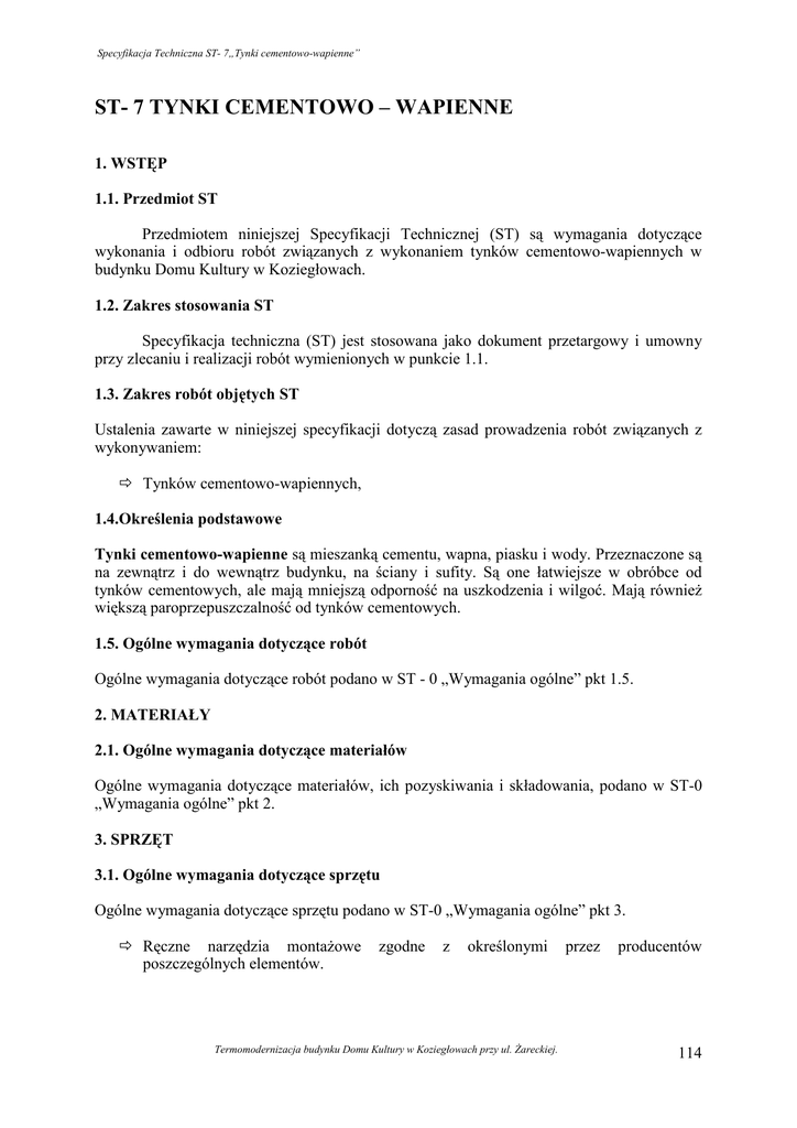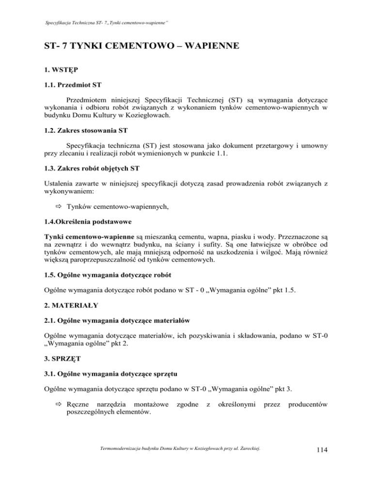 Specyfikacja Techniczna ST- 7„Tynki cementowo-wapienne” ST- 7 TYNKI CEMENTOWO – WAPIENNE 1. WSTĘP 1.1. Przedmiot ST Przedmiotem niniejszej Specyfikacji Technicznej (ST) są wymagania dotyczące wykonania i odbioru robót związanych z wykonaniem tynków cementowo-wapiennych w budynku Domu Kultury w Koziegłowach. 1.2. Zakres stosowania ST Specyfikacja techniczna (ST) jest stosowana jako dokument przetargowy i umowny przy zlecaniu i realizacji robót wymienionych w punkcie 1.1. 1.3. Zakres robót objętych ST Ustalenia zawarte w niniejszej specyfikacji dotyczą zasad prowadzenia robót związanych z wykonywaniem: Tynków cementowo-wapiennych, 1.4.Określenia podstawowe Tynki cementowo-wapienne są mieszanką cementu, wapna, piasku i wody. Przeznaczone są na zewnątrz i do wewnątrz budynku, na ściany i sufity. Są one łatwiejsze w obróbce od tynków cementowych, ale mają mniejszą odporność na uszkodzenia i wilgoć. Mają równieŜ większą paroprzepuszczalność od tynków cementowych. 1.5. Ogólne wymagania dotyczące robót Ogólne wymagania dotyczące robót podano w ST - 0 „Wymagania ogólne” pkt 1.5. 2. MATERIAŁY 2.1. Ogólne wymagania dotyczące materiałów Ogólne wymagania dotyczące materiałów, ich pozyskiwania i składowania, podano w ST-0 „Wymagania ogólne” pkt 2. 3. SPRZĘT 3.1. Ogólne wymagania dotyczące sprzętu Ogólne wymagania dotyczące sprzętu podano w ST-0 „Wymagania ogólne” pkt 3. Ręczne narzędzia montaŜowe poszczególnych elementów. zgodne z określonymi Termomodernizacja budynku Domu Kultury w Koziegłowach przy ul. śareckiej. przez producentów 114 Specyfikacja Techniczna ST- 7„Tynki cementowo-wapienne” 4. TRANSPORT 4.1. Ogólne wymagania dotyczące transportu Ogólne wymagania dotyczące transportu podano w ST-0 „Wymagania ogólne” pkt 4. Materiały moŜna przewozić dowolnymi środkami transportu. Materiały powinny być przewoŜone w opakowaniach fabrycznych. NaleŜy w czasie transportu zabezpieczyć przewoŜone materiały przed moŜliwością przemieszczania się w skrzyni ładunkowej. Składowanie materiałów powinno pomieszczeniach zamkniętych. odbywać się w miejscach zadaszonych lub 5. WYKONANIE ROBÓT 5.1. Ogólne zasady wykonania robót Ogólne zasady wykonania robót podano w ST-0 „Wymagania ogólne” pkt 5. 5.2. Wykonanie tynków cementowo - wapiennych Przed przystąpieniem do robót tynkarskich muszą być ukończone wszystkie roboty stanu surowego, powinny być wykonane roboty instalacyjne, zamurowane wszelkie przebicia i bruzdy oraz obsadzona stolarka otworowa zewnętrzna. PodłoŜe powinno być suche, stabilne, równe i nośne, tzn. odpowiednio mocne, oczyszczone z warstw mogących osłabić przyczepność zaprawy, zwłaszcza z kurzu, brudu, wapna, olejów, tłuszczów, wosku, resztek farby olejnej i emulsyjnej. Słabo związane części powierzchni naleŜy odkuć, zaś części luźne lub osypliwe usunąć przy pomocy szczotki stalowej. Bezpośrednio przed tynkowaniem naleŜy podłoŜe zmoczyć czystą wodą. JeŜeli istnieje potrzeba redukcji chłonności podłoŜa, zaleca się stosowanie emulsji gruntujących. Tynków cementowych nie stosuje się na podłoŜach drewnianych, metalowych i z tworzyw sztucznych. Przed tynkowaniem podłoŜy gipsowych powierzchnię istniejących ścian naleŜy zarysować ostrym dłutem w gęstą, skośną siatkę tak, by głębokość rys wynosiła ok. 3 mm. Krawędzie styku płyt wiórowo-cementowych przed tynkowaniem naleŜy wzmocnić pasami z nierdzewnej siatki metalowej. Tynki naleŜy wykonywać w temperaturze powyŜej + 5oC. Do wykonania tynków wskazane jest przystąpić po okresie osiadania i kurczenia się. Wilgotność muru w okresie rozpoczynania robót tynkarskich nie powinna przekraczać 8%. Zaleca się wykonanie tynków urządzeniami mechanicznymi zestawem do tynkowania bezspręŜarkowego. Podczas wykonywania obrzutki tynkarz powinien trzymać wylot końcówki tynkarskiej w odległości ok. 20 - 30 cm od powierzchni podłoŜa, w zaleŜności od konsystencji zaprawy. Kąt nachylenia końcówki w stosunku do tynkowanej powierzchni powinien wynosić około 60°. Wykonanie narzutu moŜna rozpocząć po upływie ok. 4 godzin od wykonania obrzutki. Termomodernizacja budynku Domu Kultury w Koziegłowach przy ul. śareckiej. 115 Specyfikacja Techniczna ST- 7„Tynki cementowo-wapienne” W pierwszej kolejności naleŜy narzucić zaprawę na stropy pomieszczeń. Stropów gdzie przewidziano sufity podwieszane nie naleŜy tynkować Za zespołem wykonującym narzut winien postępować zespół tynkarzy wyrównujący narzut, usuwający listwy i inne elementy wyrównując powstałe przy tym bruzdy ręcznie. Ostatnią czynnością jest zatarcie tynku przy uŜyciu pac. 6. KONTROLA JAKOŚCI ROBÓT 6.1. Ogólne zasady kontroli jakości robót Ogólne zasady kontroli jakości robót podano w ST-0 „Wymagania ogólne” pkt 6. Badania jakości wykonanych robót polegają na ocenie zgodności montaŜu poszczególnych elementów z wytycznymi dokumentacji projektowej oraz wytycznymi producenta z uwzględnieniem podanej przez niego tolerancji. W przypadku nie zachowania wymaganych parametrów montaŜu Inspektor Nadzoru oceni wpływ tego odstępstwa na jakość wykonanych robót, a następnie podejmie decyzję o pozostawieniu zabudowanych elementów lub nakaŜe ich rozbiórkę. 6.2. Sprawdzenie poprawności wykonania tynków cementowo –wapiennych Dla III klasy tynku przyjmuje się następujące wymagania: 1. Dopuszczalne odchylenie powierzchni tynku od płaszczyzny i odchylenie krawędzi od linii prostej lub załoŜonego szablonu - nie większe niŜ 3 mm i w liczbie nie większej niŜ 3 na długości łaty 2m. 2. Dopuszczalne odchylenie powierzchni od kierunku pionowego - nie większe niŜ 4 mm. 3. Dopuszczalne odchylenie od kierunku poziomego - me większe niŜ 2 mm na 1 m i ogółem nie większe niŜ 7 mm dla całej powierzchni ograniczonej pionowymi przegrodami. 4. Dopu