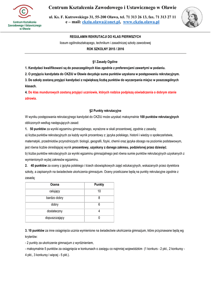 Centrum Kształcenia Zawodowego i Ustawicznego w Oławie ul. Ks. F. Kutrowskiego 31, 55-200 Oława, tel. 71 313 26 13, fax. 71 313 27 11 e – mail: [email protected], www.ckziu.olawa.pl REGULAMIN REKRUTACJI DO KLAS PIERWSZYCH liceum ogólnokształcącego, technikum i zasadniczej szkoły zawodowej ROK SZKOLNY 2015 / 2016 §1 Zasady Ogólne 1. Kandydaci kwalifikowani są do poszczególnych klas zgodnie z preferencjami zawartymi w podaniu. 2. O przyjęciu kandydata do CKZiU w Oławie decyduje suma punktów uzyskana w postępowaniu rekrutacyjnym. 3. Do szkoły zostaną przyjęci kandydaci z największą liczbą punktów do wyczerpania miejsc w poszczególnych klasach. 4. Do klas mundurowych zostaną przyjęci uczniowie, których rodzice podpiszą oświadczenia o dobrym stanie zdrowia. §2 Punkty rekrutacyjne W wyniku postępowania rekrutacyjnego kandydat do CKZiU może uzyskać maksymalnie 100 punktów rekrutacyjnych obliczonych według następujących zasad: 1. 50 punktów za wyniki egzaminu gimnazjalnego, wyrażone w skali procentowej, zgodnie z zasadą: a) liczba punktów rekrutacyjnych za każdy wynik procentowy z: języka polskiego, historii i wiedzy o społeczeństwie, matematyki, przedmiotów przyrodniczych: biologii, geografii, fizyki, chemii oraz języka obcego na poziomie podstawowym, jest równa liczbie określającej wynik procentowy, uzyskany z danego zakresu, podzielonej przez dziesięć; b) liczba punktów rekrutacyjnych za wyniki egzaminu gimnazjalnego jest równa sumie punktów rekrutacyjnych uzyskanych z wymienionych wyżej zakresów egzaminu. 2. 40 punktów za oceny z języka polskiego i trzech obowiązkowych zajęć edukacyjnych, wskazanych przez dyrektora szkoły, a zapisanych na świadectwie ukończenia gimnazjum. Oceny przeliczane będą na punkty rekrutacyjne zgodnie z zasadą: Ocena Punkty celujący 10 bardzo dobry 8 dobry 6 dostateczny 4 dopuszczający 0 3. 10 punktów za inne osiągnięcia ucznia wymienione na świadectwie ukończenia gimnazjum, które przyznawane będą wg kryteriów: - 2 punkty za ukończenie gimnazjum z wyróżnieniem, - maksymalnie 5 punktów za osiągnięcia w konkursach o zasięgu co najmniej wojewódzkim (1 konkurs - 2 pkt., 2 konkursy 4 pkt., 3 konkursy i więcej - 5 pkt.). Centrum Kształcenia Zawodowego i Ustawicznego w Oławie ul. Ks. F. Kutrowskiego 31, 55-200 Oława, tel. 71 313 26 13, fax. 71 313 27 11 e – mail: [email protected], www.ckziu.olawa.pl - maksymalnie 2 punkty za poniższe osiągnięcia w zawodach wiedzy, artystycznych i sportowych organizowanych przez kuratora oświaty lub organizowanych co najmniej na szczeblu powiatowym przez inne podmioty działające na terenie szkół (1 osiągnięcie - 1 pkt., i więcej osiągnięć - 2 pkt.) - zajęcie od I do III miejsca w zawodach sportowych, - zajęcie od I do III miejsca lub uzyskanie tytułu laureata w konkursach lub zawodach artystycznych, - zajęcie od I do III miejsca lub uzyskanie tytułu laureata w konkursach lub zawodach wiedzy lub innych konkursach tematycznych organizowanych, - 1 punkt za inne osiągnięcia takie jak: wzorowe zachowanie lub stała, udokumentowana działalność na rzecz innych ludzi zwłaszcza w formie wolontariatu aktywna współpraca z domem dziecka, hospicjum, schroniskiem dla zwierząt, organizacjami charytatywnymi itp./ lub wyróżniająca, udokumentowana działalność na rzecz środowiska szkolnego, zwłaszcza w międzyszkolnych organach samorządów młodzieży, samorządzie szkolnym lub organizacjach młodzieżowych; §3 Laureaci olimpiad Laureaci i finaliści ogólnopolskich olimpiad przedmiotowych oraz laureaci konkursów przedmiotowych o zasięgu wojewódzkim i ponad wojewódzkim, których program obejmuje w całości lub poszerza treści podstawy programowej co najmniej z jednego przedmiotu (co potwierdza właściwy kurator oświaty wydając stosowne zaświadczenie) są przyjmowani są do szkoły niezależnie od kryteriów. §4 Zwolnienie z egzaminu gimnazjalnego W przypadku uczniów zwolnionych przez Dyrektora Okręgowej Komisji Egzaminacyjnej z obowiązku przystąpienia do egzaminu gimnazjalnego z przyczyn losowych lub zdrowotnych, zgodnie z § 49 ust. 4 rozporządzenia MEN z dnia 30 kwietnia 2007 r. w sprawie warunków i sposobu oceniania, klasyfikowania i promowania uczniów i słuchaczy oraz przeprowadzania sprawdzianów i egzaminów w szkołach publicznych (Dz. U Nr 83 poz. 562 ze zmianami), ustala się następujące zasady wyliczania punków, odpowiadającej sumie liczny punktów możliwych do uzyskania za poszczególne zakresy egzaminu gimnazjalnego z: - języka polskiego - liczba punktów za ocenę na świadectwie z języka polskiego, - historii i WOS - średnia liczba punktów za oceny na świadectwie z historii i WOS, - matematyki - liczba punktów za ocenę na świadectwie z matematyki, - przedmiotów przyrodniczych - średnia liczba punktów za oceny na świadectwie z biologii, geografii, fizyki, chemii, - języka obcego - liczba punktów za ocenę na świadectwie z języka obcego wskazanego przez kandydata. §5 ukończenie gimnazjum za granicą Kandydatów, którzy ukończyli gimnazjum dla dzieci obywateli polskich czasowo przebywających za granicą lub ukończyli szkołę za granicą przyjmuje się do klasy pierwszej na podstawie świadectwa (zaświadczenia) wydanego przez szkołę za granicą i ostatniego świadectwa szkolnego wydanego w Polsce, na podstawie sumy lat nauki szkolnej ucznia. §6 Kryteria rozróżniające w przypadku uzyskania równej liczby punktów rekrutacyjnych Dodatkowymi kryteriami różnicującym kandydatów, w przypadku posiadania równej liczby punktów rekrutacyjnych wynikających z kryteriów podstawowych: Centrum Kształcenia Zawodowego i Ustawicznego w Oławie ul. Ks. F. Kutrowskiego 31, 55-200 Oława, tel. 71 313 26 13, fax. 71 313 27 11 e – mail: [email protected], www.ckziu.olawa.pl - łączna liczba punktów za wyniki na egzaminie gimnazjalnym, - ocena zachowania, - liczba punktów za wy