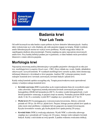 Badania krwi Your Lab Tests Od osób leczonych na raka bardzo często pobiera się krew dotestów laboratoryjnych. Analizy takie wykonywane są w celu zbadania, jak ciało pacjenta reaguje na terapię. Dzięki wynikom analiz laboratoryjnych moŜna teŜ wykryć nowe problemy. Wyniki mogą takŜe słuŜyć do zapobiegania skutkom ubocznymterapii. PoniŜej znajdują się opisy najczęściej stosowanych analiz krwi. Przy kaŜdej definicji podane jest wyjaśnienie, co dane badanie moŜe powiedzieć lekarzowi o stanie zdrowia pacjenta. Morfologia krwi Najczęściej stosowaną analizą laboratoryjną w przypadku pacjentów chorujących na raka jest tzw. morfologia krwi (complete blood count - CBC). Krew składa się z wody, białek, składników odŜywczych i Ŝywych komórek. W wynikach morfologii krwi zawarte są dane, które dostarczają informacji lekarzowi o krwinkach w krwi pacjenta. Analiza CBC wykazuje pomiary trzech rodzajów komórek krwi: krwinek czerwonych, krwinek białych i płytek krwi. KaŜdy rodzaj komórek spełnia szczególną rolę. Terapia przeciwrakowa moŜe spowodować zmiany w kaŜdym rodzaju komórek krwi. • Krwinki czerwone (RBCs) potrzebne są do rozprowadzania tlenu do wszystkich części ciała człowieka. Najprostszą metodą mierzenia krwinek czerwonych jest pomiar hemoglobiny (HGB) lub hematokrytu (HCT). Za niskie wyniki któregokolwiek z tych dwóch pomiarów oznaczają, Ŝe pacjent cierpi na anemię. Normalny poziom HGB wynosi około 12 do 18, a normalny wynik HCT znajduje się w przedziale od 37 do 52. • Płytki krwi (PLTs) pomagają przy wstrzymywaniu krwawienia. Zdrowy człowiek posiada od 150 tys. do 450 tys. płytek krwi. Pacjent, którego poziom płytek krwi spada za nisko moŜe mieć problemy z siniakami lub nie gojącymi się ranami krwawiącymi. Ryzyko krwotoków wzrasta, gdy liczba płytek krwi spada poniŜej 20 tysięcy. • Krwinki białe (WBCs) zwalczają zakaŜenia. Wynik WBC u człowieka zdrowego znajduje się w przedziale od 5 tysięcy do 10 tysięcy. Istnieje wiele rodzajów krwinek białych. KaŜdy z nich działa na swój sposób. Z punktu widzenia zwalczania infekcji, najwaŜniejszym rodzajem krwinek białych jest neutrofil (neutrophil). U człowieka zdrowego występuje od 2,5 tys. do 6 tys. neutrofili. Twój lekarz bacznie śledzić będzie wyniki pomiarów twoich krwinek białych dlatego, Ŝe ryzyko zakaŜenia znacznie wzrasta, gdy liczba neutrofili spada poniŜej 500. Biochemia krwi Biochemia krwi to analiza krwi, która zawiera wiele danych wskazujących na to, na ile dobrze funkcjonują róŜne organy ciała pacjenta. Na przykład, w jednej części tego badania zawarte są wyniki, które świadczą o tym, jak działa wątroba. Inne wskaźniki dotyczą pracy nerek, serca i płuc. Do biochemii krwi zalicza się równieŜ pomiar elektrolitów w krwi, takich jak sód i wapń. Co uznawane jest za normę? Przedziały wyników uznawanych za normalne w badaniach morfologii krwi i biochemii krwi róŜnią się trochę w zaleŜności od tego, które laboratorium dokonuje analizy. W kaŜdym razie przedziały normalne wydrukowane są zazwyczaj na arkuszach z wynikami, zaraz obok wyników analizy krwi pacjenta. Dla niektórych pacjentów przydatne jest posiadanie własnej kopii wyników badań laboratoryjnych. Pacjent prosi o kopię swoich wyników, a potem prosi kogoś z jego zespołu opieki zdrowotnej o wyjaśnienia poszczególnych liczb. Jeśli masz pytania na temat swojej choroby nowotworowej lub wyników analiz laboratoryjnych, prosimy cię o telefon, o dowolnej godzinie dnia lub nocy, pod numer 1-800-227-2345. Language: Polish Last Medical Review: 11/17/2015 Last Revised: 11/17/2015 2015 Copyright American Cancer Society
