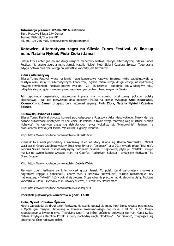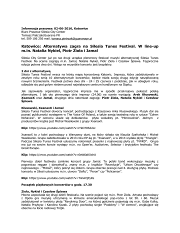 Informacja prasowa: 02-06-2016, Katowice Biuro Prasowe Silesia City Center Tomasz Pietrzak/Guarana PR tel. 509 106 256 mail. [email protected] Katowice: Alternatywa zagra na Silesia Tunes Festival. W line-up m.in. Natalia Nykiel, Piotr Zioła i Jamal Silesia City Center już po raz drugi urządza plenerowy festiwal muzyki alternatywnej Silesia Tunes Festival. Na scenie zagrają m.in. Jamal, Natalia Nykiel, Piotr Zioła i Czesław Śpiewa. Tegoroczna edycja potrwa dwa dni. Wstęp na wszystkie koncerty jest bezpłatny. 2 dni z alternatywą Silesia Tunes Festival wraca na letnią mapę koncertową Katowic. Impreza, która zadebiutowała w zeszłym roku serią 10 alternatywnych koncertów, będzie miała swoją drugą edycję naszpikowaną nowymi brzmieniami. Festiwal potrwa dwa dni - 24 i 25 czerwca i podobnie, jak w ubiegłym roku, odbędzie się pod gołym niebem przed największym centrum handlowym na Śląsku. Jak zapowiada organizator, tegoroczna impreza ma w sposób przekrojowy pokazać polską alternatywę. I tak oto pierwszego dnia imprezy (24.06) na scenie wystąpią: Arek Kłusowski, XxanaxX oraz Jamal, drugiego dnia natomiast zagrają: Piotr Zioła, Natalia Nykiel i Czesław Śpiewa. Kłusowski, XxanaxX i Jamal Silesia Tunes Festival otworzy koncert pochodzącego z Rzeszowa Arka Kłusowskiego. Muzyk dał sie poznać publiczności występem w The Voice Of Poland, a także swoją teatralną rolą w sztuce "Cohen Nohavica". W czerwcu ukaże się debiutancka płyta wokalisty pt. "Mimowolnie". Jednym z producentów krążka jest Michał Wasilewski z grupy XxanaxX. Klip: https://www.youtube.com/watch?v=iYkO70S2vkc XxanaxX to z kolei pochodzący z Warszawy duet, na który składa się Klaudia Szafrańska i Michał Wasilewski. Grupa zadebiutowała w 2013 roku EP-ką pt. "XxanaxX", a w 2014 wydała płytę "Triangle". Podczas Silesia Tunes Festival usłyszymy natomiast piosenki z najnowszej płyty pt. "FWRD". Grupa ma już na swoim koncie występy m.in. na Open'er, Audioriver, Selector i brytyjskim festiwalu The Great Escape. Klip: https://www.youtube.com/watch?v=6etk6aKXxhA Pierwszy dzień festiwalu zamknie koncert grupy Jamal. To polski band wykonujący muzykę z pogranicza reggae i dancehall'u, znany m.in. z krążków "Rewolucje", "Urban Discotheque" czy najnowszego - "Miłość", który pokrył się złotem. Grupa obecnie pracuje nad 4. studyjną płytą. Podczas koncertu w Silesii usłyszymy m.in. utwory "Defto", "Peron" czy "Policeman". Klip: https://www.youtube.com/watch?v=TiinAVjPyRs Początek piątkowych koncertów o godz. 17.30 Zioła, Nykiel i Czesław Śpiewa Mocno zapowiada się drugi dzień festiwalu. Na scenie pojawi się m.in. Piotr Zioła. Artysta pochodzący z Opola gra muzykę utrzymaną w klimacie amerykańskiego pop-rocka z lat 50. i 60. Muzyk zadebiutował w kwietniu płytą "Revolving Door", na której gościnnie pojawiają się m.in. Gaba Kulka, Natalia Przybysz i Karolina Kozak. Z płyty pochodzą single "Podobny" i "W ciemno", znajdujące się obecnie na liście radiowej Trójki. Klip: https://www.youtube.com/watch?v=HfYOkW6Wk_o Oprócz Piotra Zioły na scenie Silesia Tunes Festival wystąpi także Natalia Nykiel, okrzyknięta jednym z najbardziej intrygujących debiutów w 2014 roku. Artystka ma na swoim koncie doskonale przyjętą płytę "Lupus Electro". Autorkami tekstów na płycie są m.in. Katarzyna Nosowska i Paulina Przybysz. Klip do jednego z singli Natalii pt. "Bądź duży" na YouTube wyświetlono już ponad 35 miliona razy! Obecnie piosenkarka koncertuje w ramach trasy „ERROR TOUR". Klip: https://www.youtube.com/watch?v=H0h_EhCnDpI Na finał Silesia Tunes Festival zagra natomiast grupa Czesław Śpiewa. Grupa ma na swoim koncie tak znane przeboje jak "Maszynka do świerkania", "Krucha blondynka" czy "W sam raz". Pierwszy album „Debiut” sprzedał się w nakładzie blisko 100 tysięcy , a kolejny - „POP” - pokrył się podwójną Platyną . Ostatni, bardzo dobrze przyjęty przez krytyków muzycznych album pt. „Czesław Śpiewa Księga Emigrantów cz.1” również zbliżył się do statusu Złotej Płyty. Czesław Śpiewa zdobył również uznanie polskich krytyków muzycznych, otrzymując łącznie 15 nominacji do „Fryderyków” i zgarniając 3 nagrody. Do tej pory zespół zagrał ponad 800 koncertów w Polsce i za granicą m.in. na Roskilde Festival , OFF Festival i Męskie Granie. Klip: https://www.youtube.com/watch?v=fA2FwdNzokA Początek sobotnich koncertów o godz. 18.00 Silesia Tunes Festival odbywa się już po raz drugi. W zeszłym roku na scenie STF wystąpili m.in. Kamp!, The Dumplings, Call The Sun, Jóga, Fair Weather Friends, Holly Blue i Plug&Play. Trwająca 3 dni impreza zgromadziła ponad 3 tys. osób. Line-up: 24.06 (piątek) 17.30 - Arek Kłusowski 18.50 - XxanaxX 20.15 - Jamal Wstęp na wszystkie koncerty jest bezpłatny 25.06 (sobota) 18.00 - Piotr Zioła 19.00 - Natalia Nykiel 20.40 - Czesław Śpiewa Wstęp na wszystkie koncerty jest bezpłatny