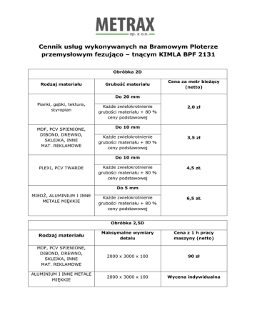Cennik usług wykonywanych na Bramowym Ploterze przemysłowym fezująco – tnącym KIMLA BPF 2131 Obróbka 2D Rodzaj materiału Grubość materiału Cena za metr bieżący (netto) Do 20 mm Pianki, gąbki, tektura, styropian MDF, PCV SPIENIONE, DIBOND, DREWNO, SKLEJKA, INNE MAT. REKLAMOWE Każde zwielokrotnienie grubości materiału + 80 % ceny podstawowej 2,0 zł Do 10 mm Każde zwielokrotnienie grubości materiału + 80 % ceny podstawowej 3,5 zł Do 10 mm PLEXI, PCV TWARDE Każde zwielokrotnienie grubości materiału + 80 % ceny podstawowej 4,5 zŁ Do 5 mm MIEDŹ, ALUMINIUM I INNE METALE MIĘKKIE Każde zwielokrotnienie grubości materiału + 80 % ceny podstawowej 6,5 zŁ Obróbka 2,5D Rodzaj materiału Maksymalne wymiary detalu Cena z 1 h pracy maszyny (netto) MDF, PCV SPIENIONE, DIBOND, DREWNO, SKLEJKA, INNE MAT. REKLAMOWE 2000 x 3000 x 100 90 zł ALUMINIUM I INNE METALE MIĘKKIE 2000 x 3000 x 100 Wycena indywidualna Frezowanie (wybieranie materiału) Rodzaj materiału MDF, PCV SPIENIONE, STYROPIAN, DIBOND, DREWNO, SKLEJKA, INNE MAT. REKLAMOWE Grubość materiału Cena za metr bieżący (netto) Do 10 mm Każde zwielokrotnienie grubości materiału + 80 % ceny podstawowej 2,0 zł Do 5 mm ALUMINIUM I INNE METALE MIĘKKIE Każde zwielokrotnienie grubości materiału + 80 % ceny podstawowej 6,5 zł Do 0,5 mm STAL Każde zwielokrotnienie grubości materiału + 80 % ceny podstawowej 15zł Zamówienie poniżej 10 metrów bieżących + 50 zł (netto). Cena w tabelach nie uwzględnia materiału. Powyżej przedstawiony został skrócony cennik usług, dzięki któremu można wyliczyć orientacyjną cenę usługi. Przedstawiona cena końcowa nie jest ceną ostateczną. Cena końcowa może się zmieniać w zależności od preferencji i potrzeb zamawiającego. KONTAKT P.P.U. METRAX Sp. z o. o. Email: [email protected] Dobrów 9 Tel.: +48(015)864 80 14 28 – 142 Tuczępy Tel./fax.: +48(015)864 80 15 NIP: 655 18 16 350 REGON: 292673570