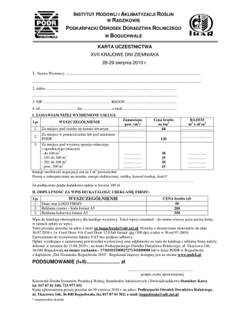 INSTYTUT HODOWLI I AKLIMATYZACJI ROŚLIN W RADZIKOWIE PODKARPACKI OŚRODEK DORADZTWA ROLNICZEGO W BOGUCHWALE KARTA UCZESTNICTWA XVII KRAJOWE DNI ZIEMNIAKA 28-29 sierpnia 2010 r. 1. Nazwa Wystawcy ..................................................................................................................... ................................................................................................................................................... 2. Adres ........................................................................................................................................ ....................................................................................................................................................... 3. NIP ...................................................................... REGON ..................................................... 4. tel. .................................... fax. ............................ e-mail. ....................................................... I. ZAMAWIAM NIśEJ WYMIENIONE USŁUGI: Lp. WYSZCZEGÓLNIENIE 1. Zamawiana pow. (m2) ……………….. Cena brutto za 1m2 60 RAZEM m2 x zł/ m2 ............................... Za miejsce pod stoisko na terenie otwartym Za miejsce w pomieszczeniu lub pod namiotem ............................... 2. ……………….. PODR 120 3. Za miejsce pod wystawę sprzętu rolniczego i ogrodniczego (maszyn) - do 100 m2 ................... ................... 30 - 101 do 200 m2 ................... ................... 25 - 201 do 300 m2 ................... ................... 20 - pow. 300 m2 ................... ................... 15 Istnieje moŜliwość negocjacji cen za 1 m2 powierzchni. Proszę o zabezpieczenie na stoisku: energii elektrycznej, stolika, krzeseł (rodzaj, ilość)* ……………………………………………………………………………………………………………… Za podłączenie prądu dodatkowa opłata w kwocie 100 zł. II. ODPŁATNOŚĆ ZA WPIS DO KATALOGU I REKLAMĘ FIRMY: Lp. WYSZCZEGÓLNIENIE 1. Dane oraz LOGO FIRMY 2. Reklama czarno – biała format A5 3. Reklama kolorowa format A5 CENA brutto (zł) 50 200 350 Wpis do katalogu obowiązkowy dla kaŜdego wystawcy. Tekst wpisu (standard – do ośmiu wierszy poza nazwą firmy, w ramach opłaty za wpis). Tekst prosimy przesłać na adres e-mail: [email protected]. Prosimy o dostarczenie materiałów do dnia 30.07.2010 r. [w Corel Draw 9.0, Corel Draw 12.0 lub format: jpg (300 dpi) a tekst w Word 97-2003] UpowaŜniam do wystawienia faktury VAT bez podpisu odbiorcy. Opłaty wynikające z zamawianej powierzchni wystawowej oraz odpłatności za wpis do katalogu i reklamę firmy naleŜy dokonać w terminie do 13.08.2010 r., na konto Podkarpackiego Ośrodka Doradztwa Rolniczego, ul. Tkaczowa 146, 36-040 Boguchwała na numer rachunku - 17101015280027271341000000 lub w kasie PODR w Boguchwale z dopiskiem „Dni Ziemniaka Boguchwała 2010”. Regulamin imprezy dostępny jest na stronie www.podrb.pl PODSUMOWANIE (I+II) ........................ zł .................................................................... podpis osoby upowaŜnionej Kierownik Działu Systemów Produkcji Rolnej, Standardów Jakościowych i Doświadczalnictwa Stanisław Kawa tel. 017 87 01 540; 723 977 552 Kartę zgłoszeniową proszę przesłać do 30 czerwca 2010 r. na adres: Podkarpacki Ośrodek Doradztwa Rolniczego, ul. Tkaczowa 146, 36-040 Boguchwała, fax 017 87 01 502; e-mail: [email protected] * niepotrzebne skreślić