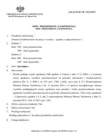 ZAŁĄCZNIK NR 1 DO SIWZ 2 REGIONALNA BAZA LOGISTYCZNA 04-470 Warszawa, ul. Marsa 110 OPIS PRZEDMIOTU ZAMÓWIENIA OPIS PRZEDMIOTU ZAMÓWIENIA 1. Przedmiot zamówienia : Dostawa kombinezonów do pracy w wodzie – zgodnie z załącznikiem nr 1 2. Zadanie 1: Ilość: 700 – ilość gwarantowana 200 – ilość opcjonalna Zadanie 2: Ilość: 600 – ilość gwarantowana 200 – ilość opcjonalna 3. CPV: 18114000-1 4. Inne normy: Wyrób podlega ocenie zgodności OiB zgodnie z Ustawą z dnia 17.11.2006 r. o systemie oceny zgodności wyrobów przeznaczonych na potrzeby obronności i bezpieczeństwa państwa (Dz. U. z 2006 r. nr 235, poz. 1700, z późn. zm.) oraz § 13.1 Rozporządzenia Ministra Obrony Narodowej z dn. 11 stycznia 2013 r. w sprawie szczegółowego wykazu wyrobów podlegających ocenie zgodności oraz sposobu i trybu przeprowadzenia oceny zgodności wyrobów przeznaczonych na potrzeby obronności państwa. Tryb oceny zgodności – I (pierwszy) zgodnie z § 3, pkt 2 rozporządzenia Ministra Obrony Narodowej z dnia 11 stycznia 2013 r. (Dz. U 2013, poz. 136). 5. Oferty częściowe (zadania): Tak 6. Oferty równoważne: Nie 7. Wymogi techniczne: Według załącznika nr 1 do opisu przedmiotu zamówienia 8. Usługi dodatkowe: Załącznik nr 1 do SIWZ nr sprawy: D/148/2016; strona 1 z 8 - Wykonawca dostarczy przedmiot umowy do 3 Regionalnej Bazy Logistycznej Kraków, Skład Materiałowy Dęblin, 08-530 Dęblin, ul. Saperów 3, tel. 261-515-510, 261-515-525, fax. 261515-539. - wykonawca oznakuje przedmiot zamówienia kodami kreskowymi, zgodnie z postanowieniami decyzji nr 3/MON Ministra Obrony Narodowej z dnia 3 stycznia 2014 r. w sprawie wytycznych określających wymagania w zakresie znakowania kodem kreskowym wyrobów dostarczanych do resortu obrony narodowej (Dz. Urz. MON z dnia 7 stycznia 2014 r., poz. 11) oraz przywołanym w jej treści standardem GS1. Załącznik nr 1 do SIWZ nr sprawy: D/148/2016; strona 2 z 8 Załącznik nr 1 OPIS PRZEDMIOTU ZAMÓWIENIA NA DOSTAWĘ KOMBINEZONÓW DO PRACY W WODZIE 1. WSTĘP Przedmiotem zamówienia jest dostawa kombinezonów do pracy w wodzie, zapewniających wodoszczelność i niezatapialność w czasie prowadzenia działań ratowniczych oraz realizacji zadań specjalistycznych przez pododdziały SZ RP w środowisku wodnym w następujących ilościach: a) kolor khaki: 700 kpl. ilość gwarantowana 200 kpl. ilość opcjonalna (przy czym dostawa zawierająca ilości opcjonalne może być realizowana w niezbędnej ilości w razie wystąpienia potrzeb oraz przyznania środków finansowych na ten cel). b) kolor pomarańczowy (jak dla pododdziałów PSP): 600 kpl. ilość gwarantowana 200 kpl. ilość opcjonalna (przy czym dostawa zawierająca ilości opcjonalne może być realizowana w niezbędnej ilości w razie wystąpienia potrzeb oraz przyznania środków finansowych na ten cel). 2. WYMAGANIA EKSPLOATACYJNO-TECHNICZNE 2.1. Podstawowe wymagania 2.1.1. Warunki pracy Kombinezon powinien być wykonany w technologii zapewniającej jego szczelność oraz niezatapialność w wodzie oraz w ekstremalnych środowiskach takich jak zanieczyszczenie ściekami, produktami ropopochodnymi. Użyte do jego produkcji materiały powinny zapewnić wysoką odporność na uszkodzenia mechaniczne, w tym przekłucie i rozdarcie. 2.1.2. Dane wyjściowe Kombinezon powinien być jednoczęściowy z kapturem, wyposażony w niezbędne mankiety lub inne rozwiązania techniczne zapewniające jego szczelność, Zastosowane zapięcie powinno zapewniać szczelność bez limitu czasu pracy. Dopuszcza się zintegrowanie butów z resztą kombinezonu. 2.1.3. Sprzężenie techniczne z innymi rodzajami wyrobów: Nie przewiduje się sprzężenia kombinezonu z innymi wyrobami technicznymi. 2.1.4. Rodzaj zasilania, wielkość zużycia energii lub paliwa: Nie przewiduje się wykorzystania żadnych źródeł zasilania w trakcie użytkowania kombinezonu. 2.1.5. Wymagania konstrukcyjno - techniczne: Kombinezon do pracy w wodzie powinien zostać wykonany i ukompletowany według dokumentacji technicznej producenta i spełniać niżej wymienione parametry techniczne: powinien być wykonany z materiału wielowarstwowego zapewniającego jego elastyczność, szczelność i wysoką odporność na przebicie; powinien zapewniać skuteczne utrzymywanie użytkownika na powierzchni wody; Załącznik nr 1 do SIWZ nr sprawy: D/148/2016; strona 3 z 8 kombinezon pod względem dopasowania powinien być wykonany w dwóch wariantach według tabeli nr 1, tj. rozmiar I i rozmiar II; Tabela nr 1 Lp. 1 2 3 4 Dane Wzrost (cm) Obwód klatki piersiowej (cm) Obwód pasa (cm) Rozmiar buta (numeracja angielska/francuska) Rozmiar I 176-188 do 116 do 104 Rozmiar II 182-194 do 124 do 112 9/43 10/45 rękawy i mankiet szyjny powinny być wykończone w sposób uniemożliwiającymi przedostawanie się wody do skafandra; zamontowany zamek powinien umożliwiać przebywanie w wodzie bez limitu czasu; buty powinny być wzmocnione na przetarcia i przebicia mechaniczne; kombinezon powinien posiadać kieszeń na dodatkowy ekwipunek; kombinezon powinien być wyposażony w wewnętrzne szelki o regulowanej długości podtrzymujące kombinezon w pasie; kombinezon powinien posiadać wzmocnienia w okolicach kolan i pośladków i wokół zamka; z przeciwpoślizgowego materiału wbudowany rozporek; kombinezon powinien być wyposażony w ocieplone rękawice; kombinezon powinien lub czarnego; być przenoszony w torbie transportowej koloru khaki w przypadku ograniczeń czasu użytkowania kombinezon powinien posiadać czytelną informację o przewidywanym okresie jego użytkowania. 2.1.6. Wymagania dotyczące wyglądu zewnętrznego, powłoki ochronnej i barwy powłok ochronnych: Dostarczany kombinezon do pracy w wodzie ma być wykonany w następujących kolorach: c) kolor khaki, bez żadnych elementów odblaskowych lub demaskujących. Dopuszcza się wstawki w kolorze czarnym lub innym zapewniającym maskowanie użytkownika kombinezonu: 700 kpl. 